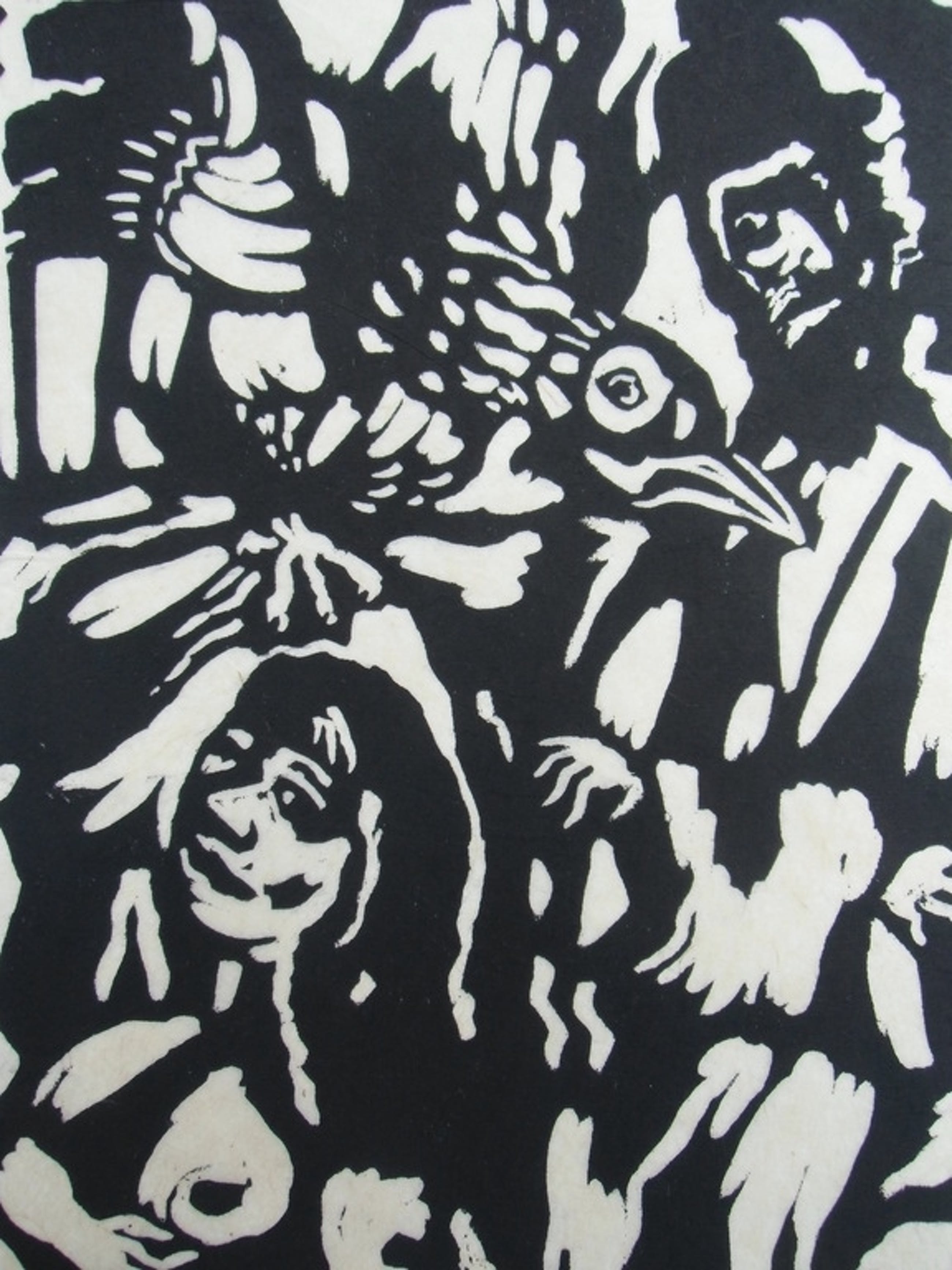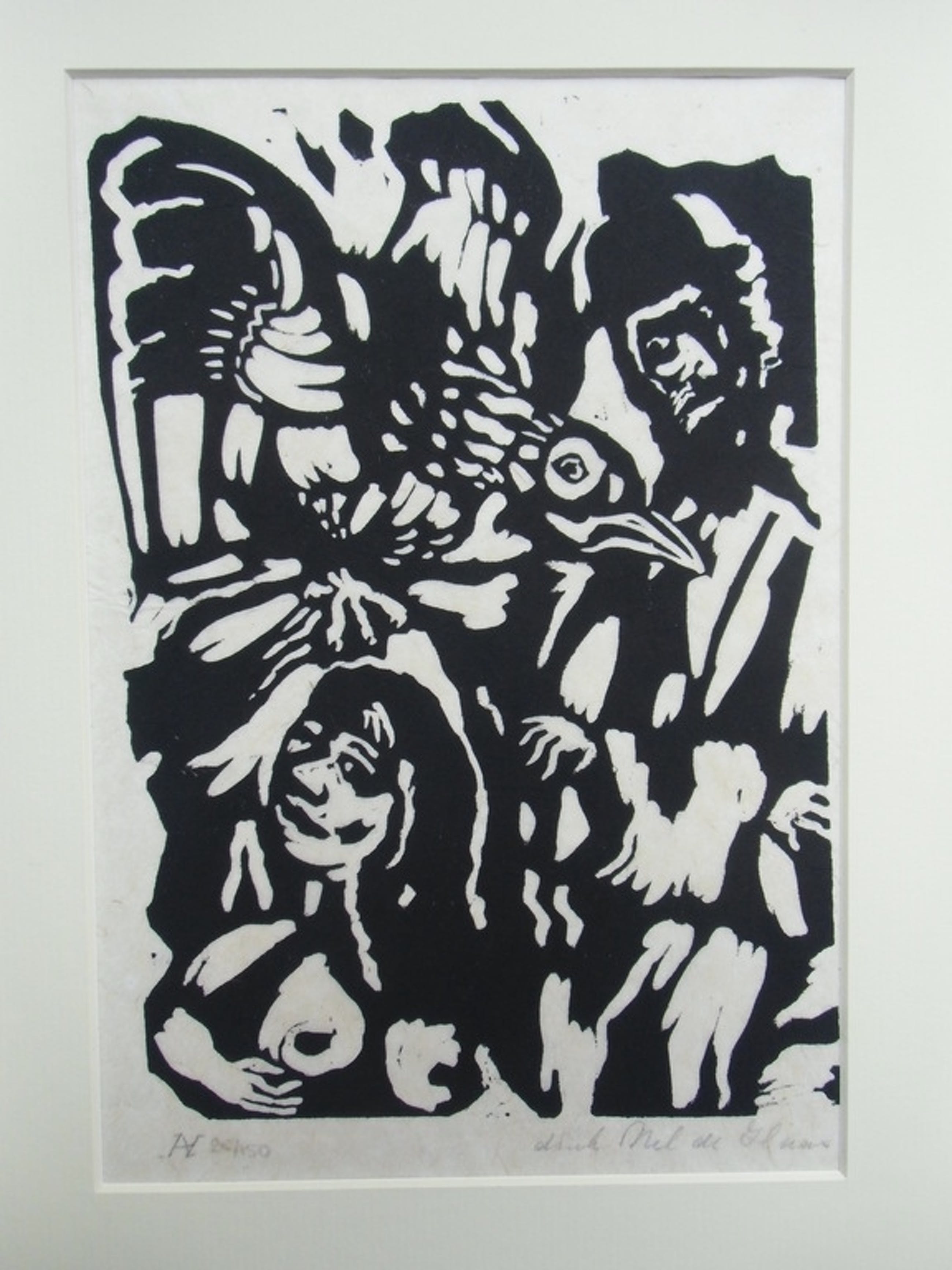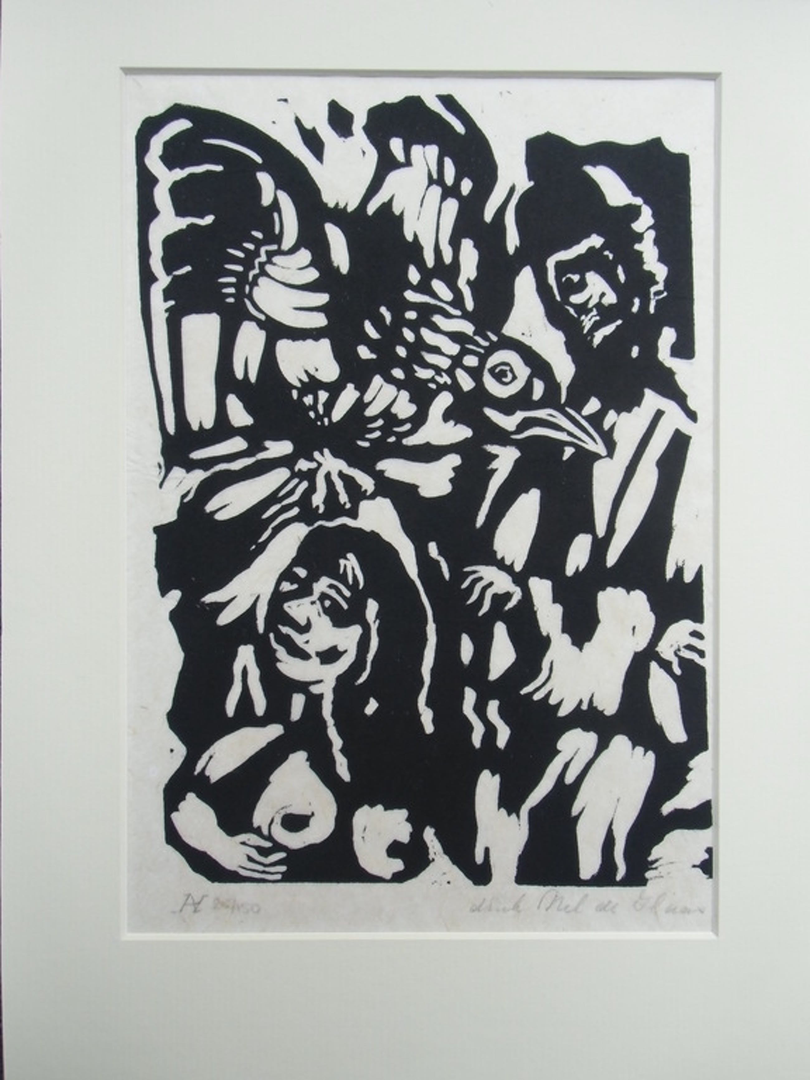 Karakteristieke houtsnede van Aad de Haas. Gedrukt op Japans papier door Nel de Haas. Oplage 20/150. Opgenomen in passepartout met achtervel.