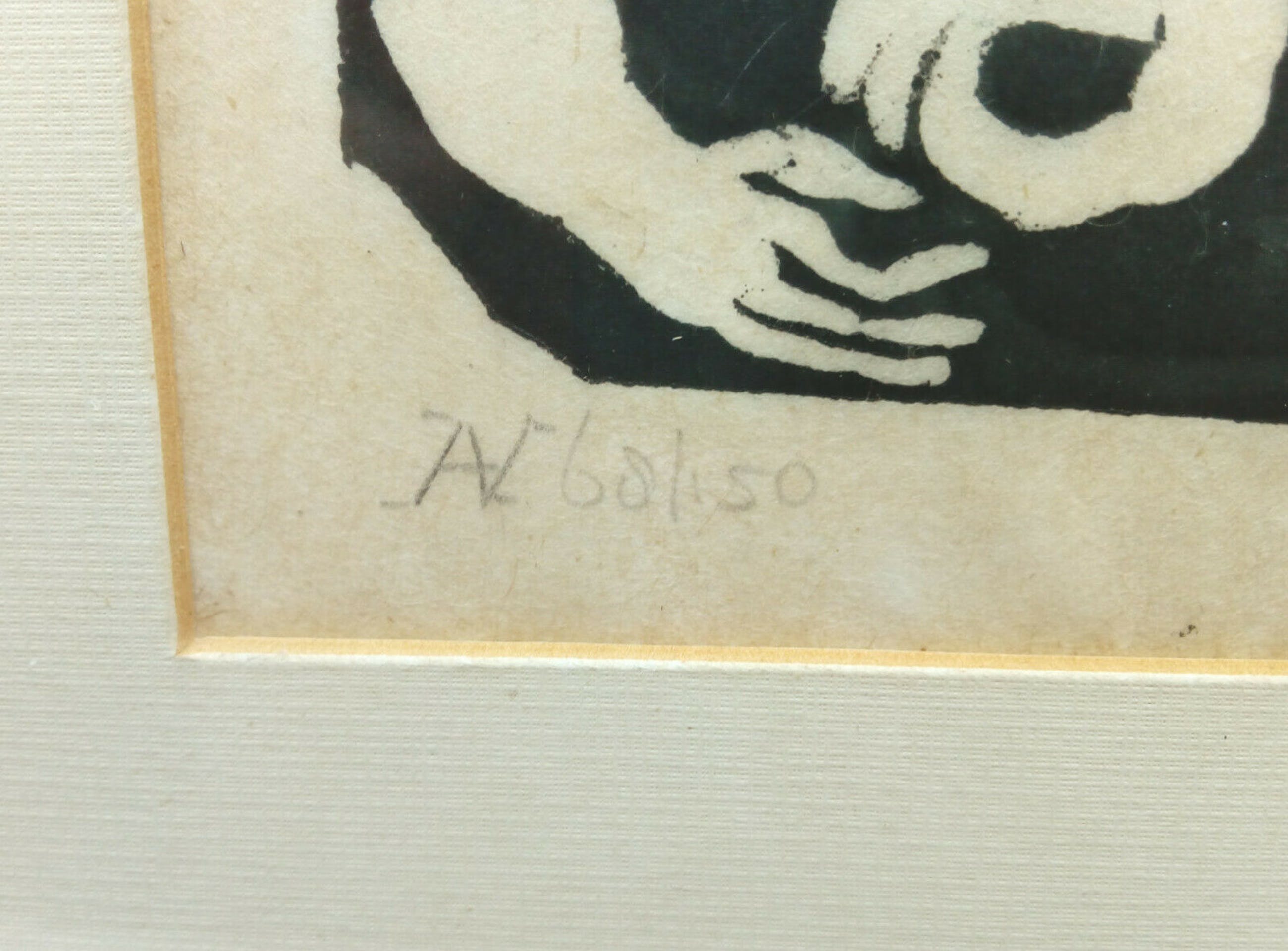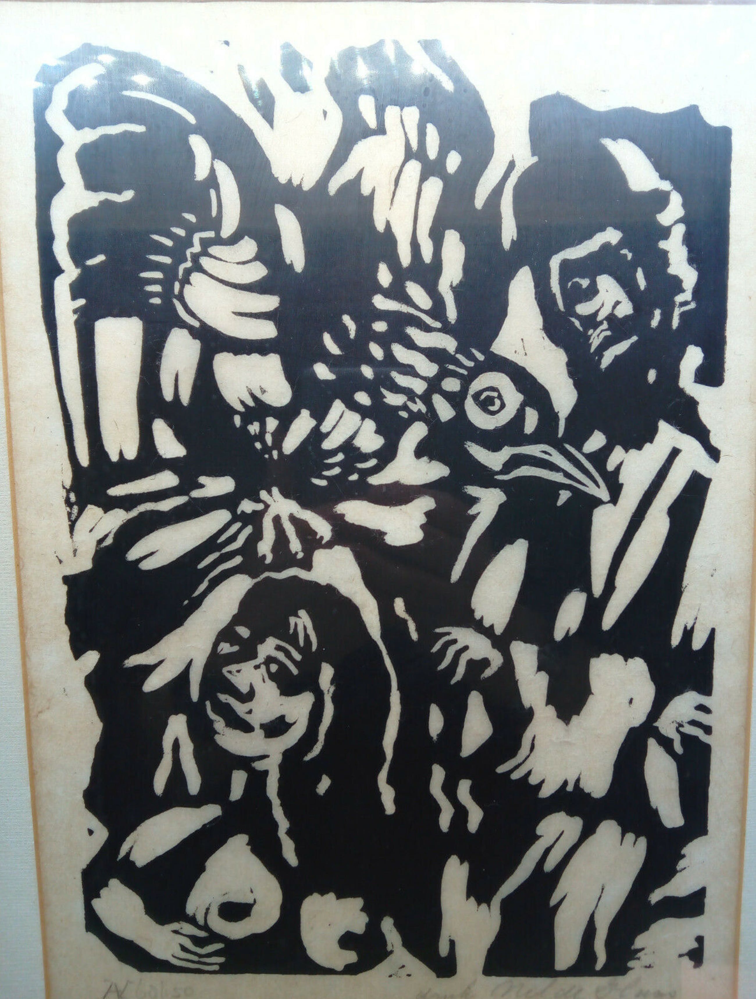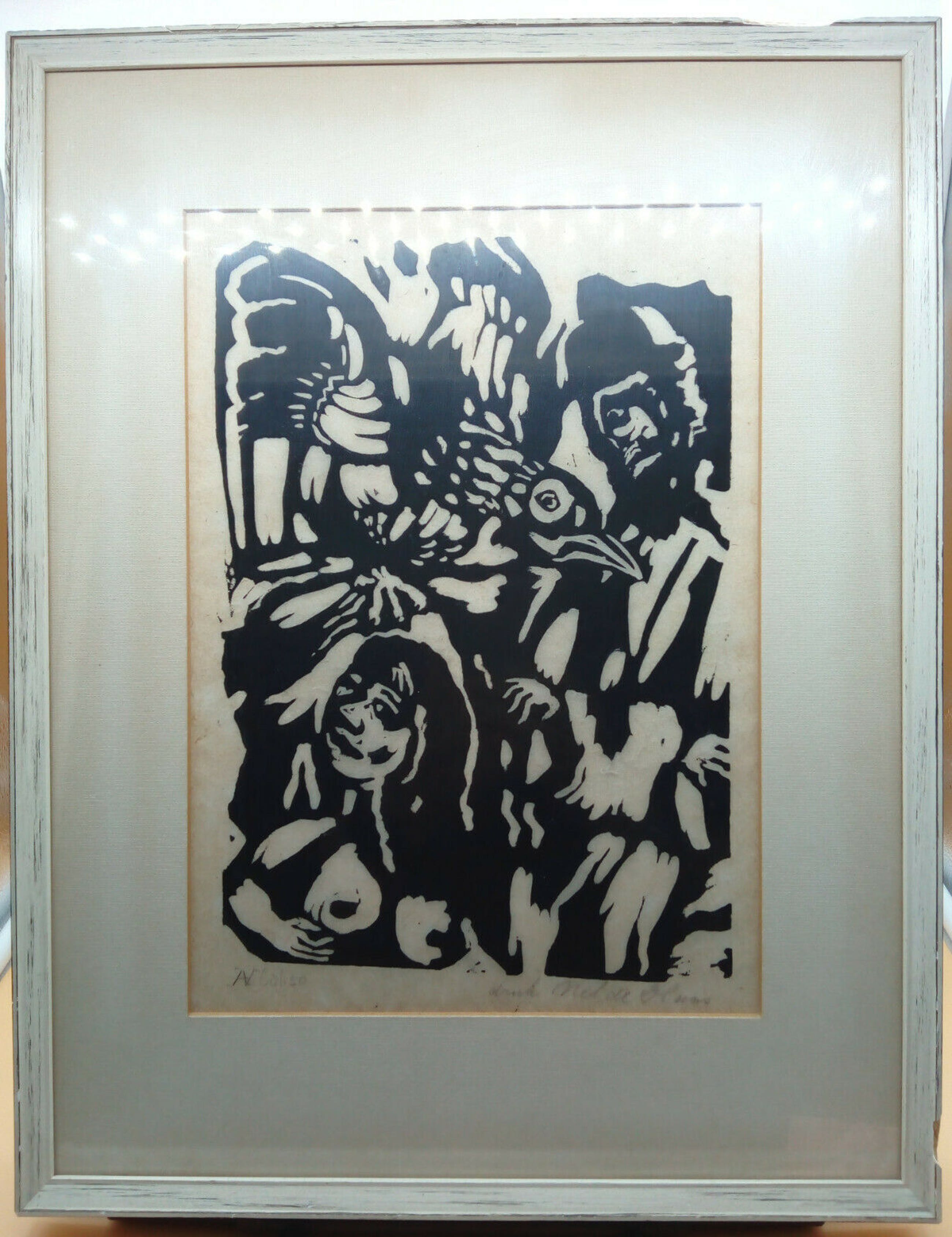 | Dubbel(zelf?)portret met vogel. Kunstenaar: Aad de Haas (1920-1972), druk door zijn vrouw Nel de Haas. Gesigneerd door Nel de Haas. Gelimiteerd: 68/150. Let svp op de onvermijdelijke spiegeling tijdens het fotograferen. Kwaliteitsaanduiding 'Zeer Goed' heeft betrekking op het kunstwerk zelf, niet de lijst. | |||||||||||