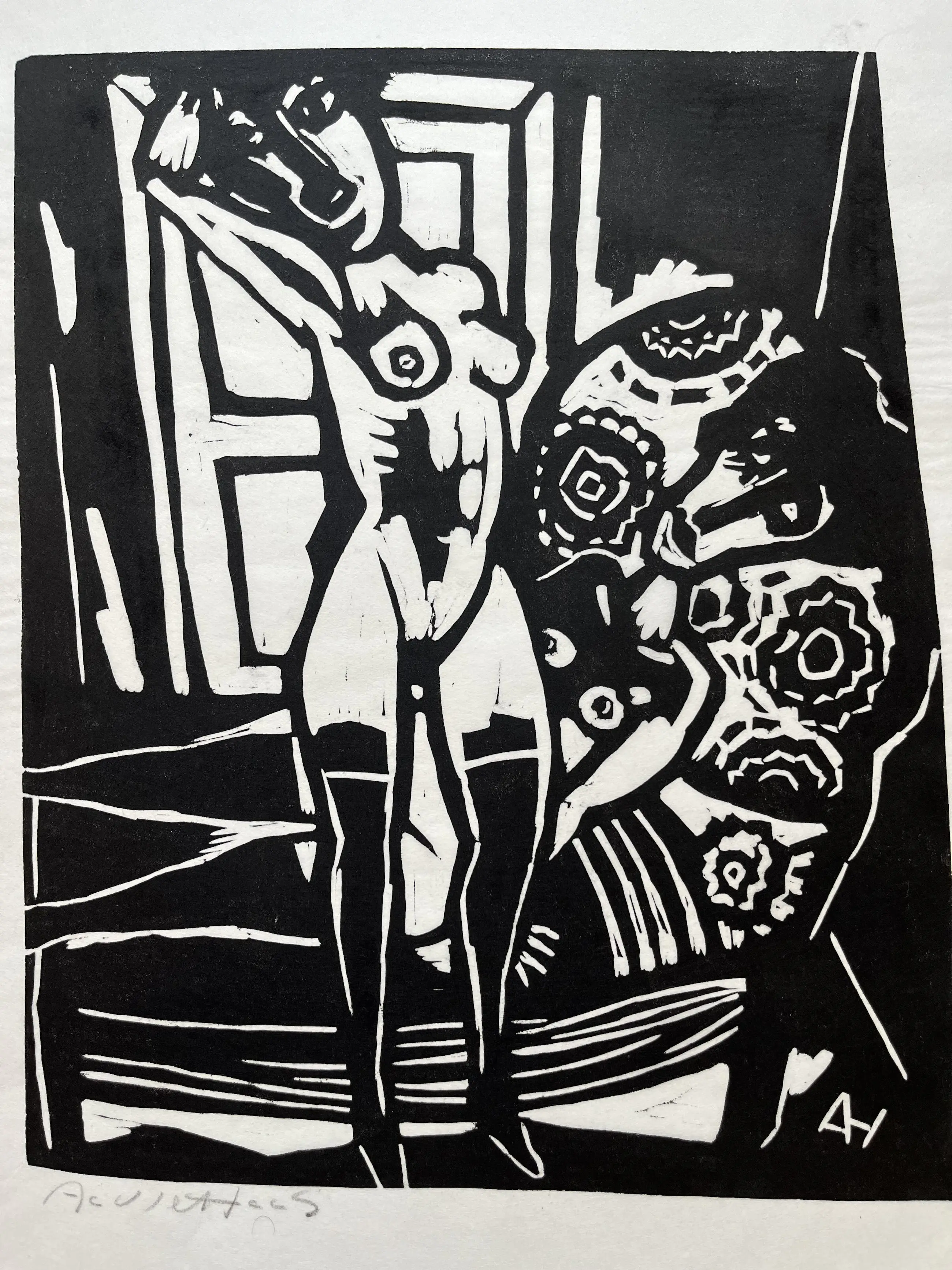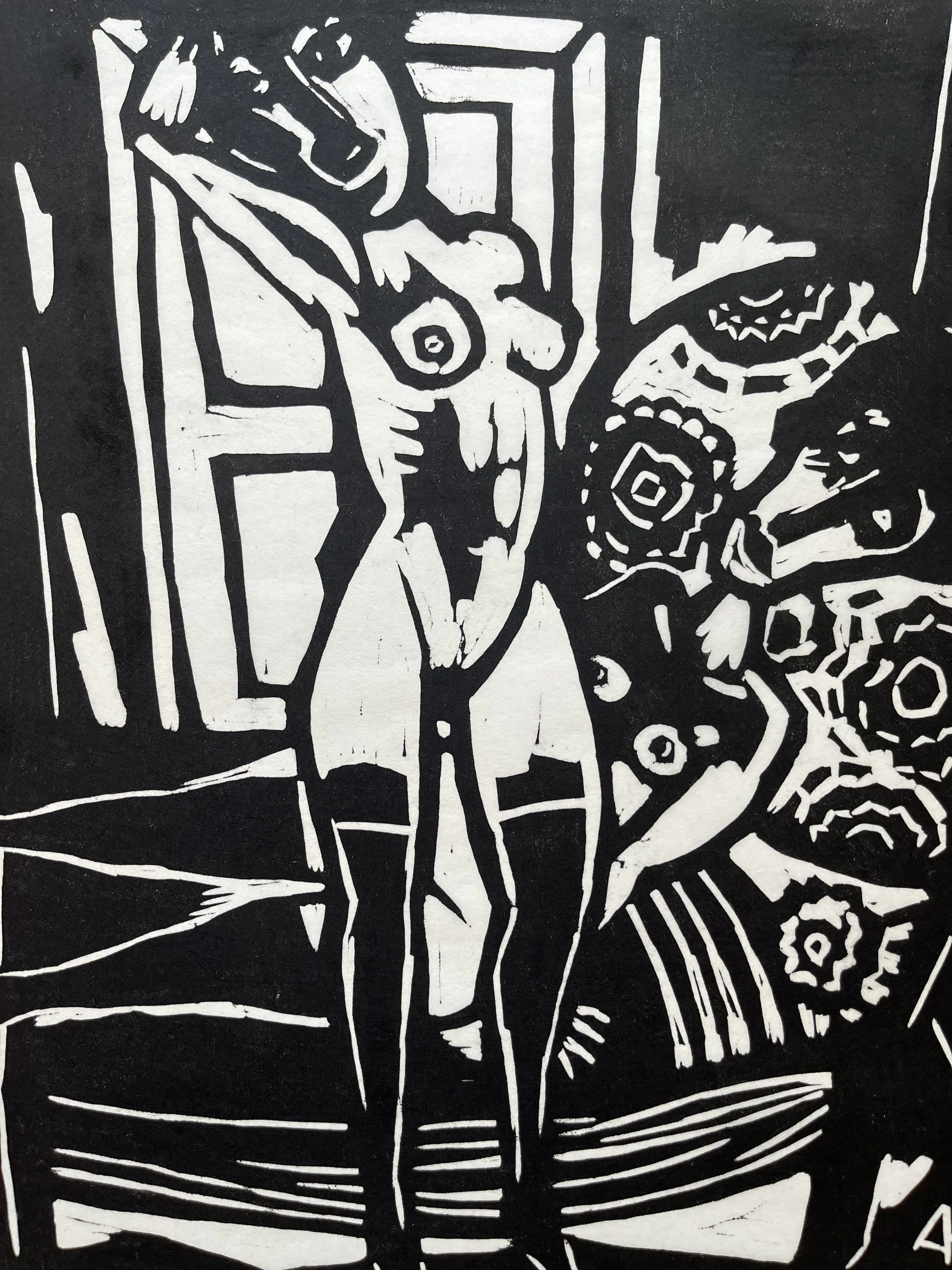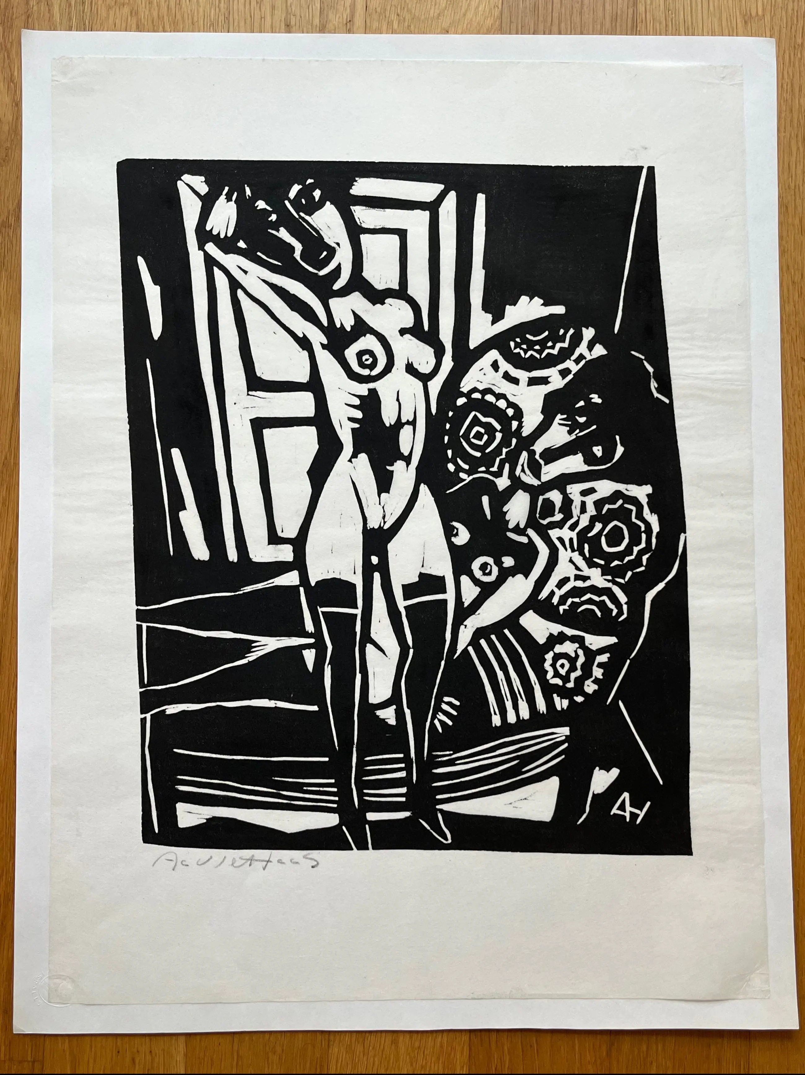 Uniek grafiekblad, althans er staat geen oplagenummers beschreven. Grafiekblad komt uit de goede verzameling van dhr. F. Van Ooijen. Deze had een goede relatie met de kunstenaar en heeft ook veel van zijn grafiek rechtstreeks bij de kunstenaar verworven. De lino is zowel in de druk met monogram gesigneerd en met potlood handgesigneerd. Helaas niet gedateerd. Het blad is aan de hoeken geplakt op wit papier. Op de hoeken zitten dan ook wat “ plakvouwtjes”. Afmeting afbeelding. 45 x 35,5 cm. Blad 61 x 46 cm. Wit papier 64,5 x 50 cm.