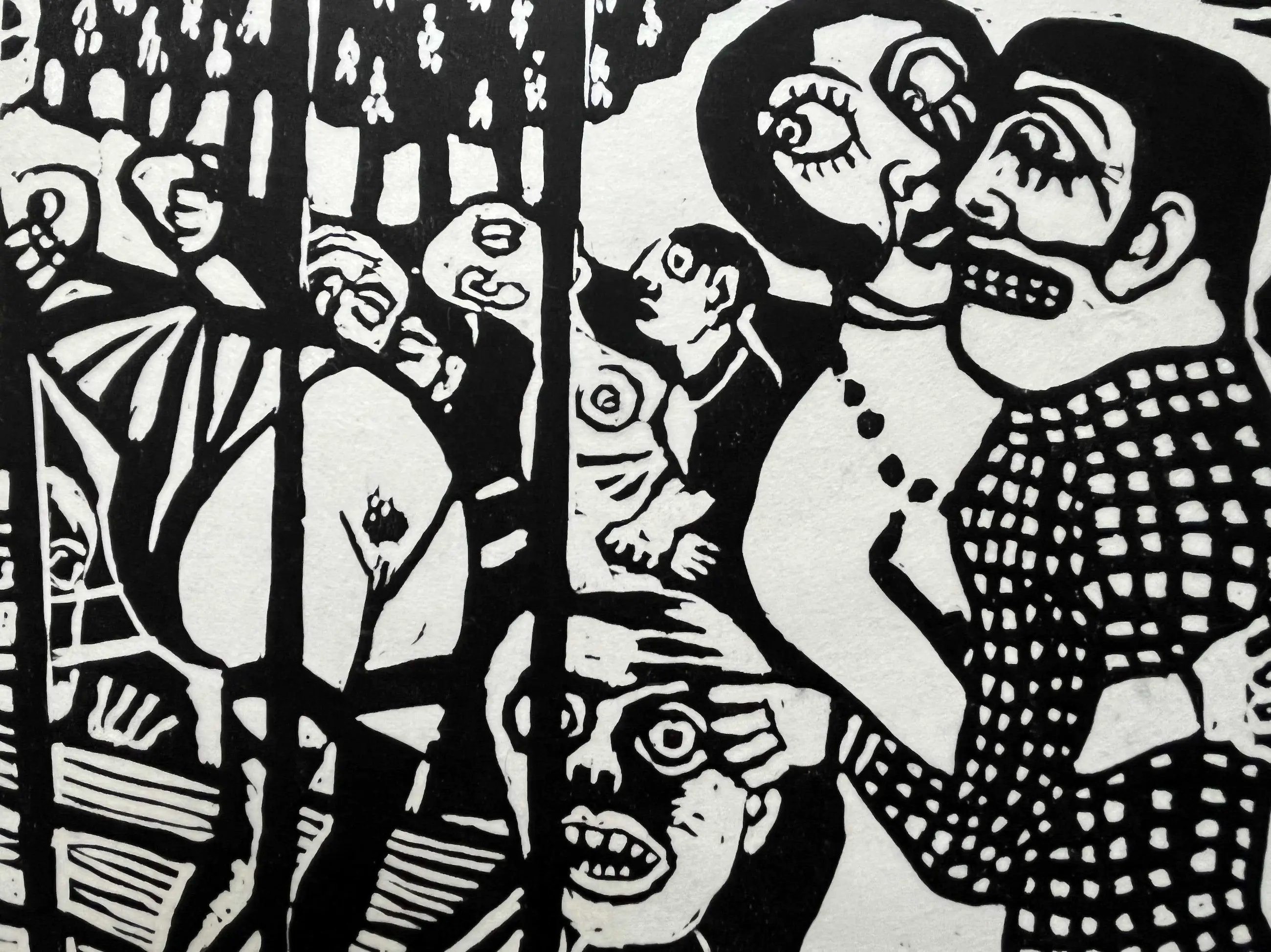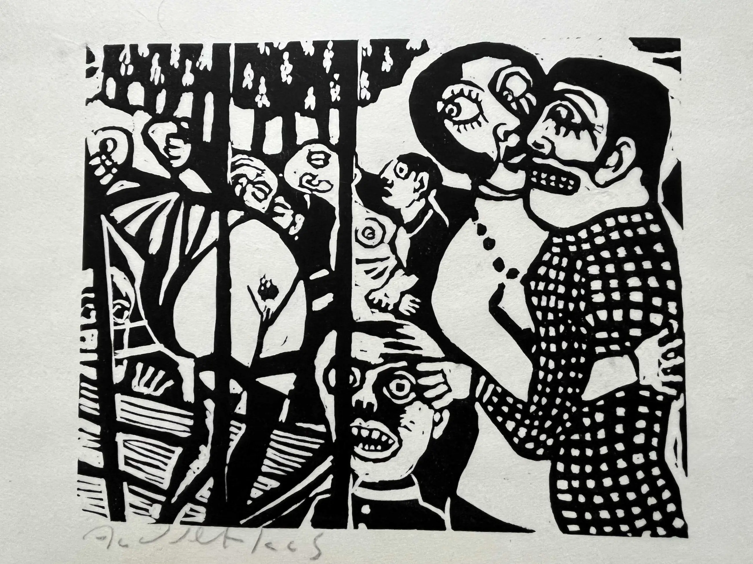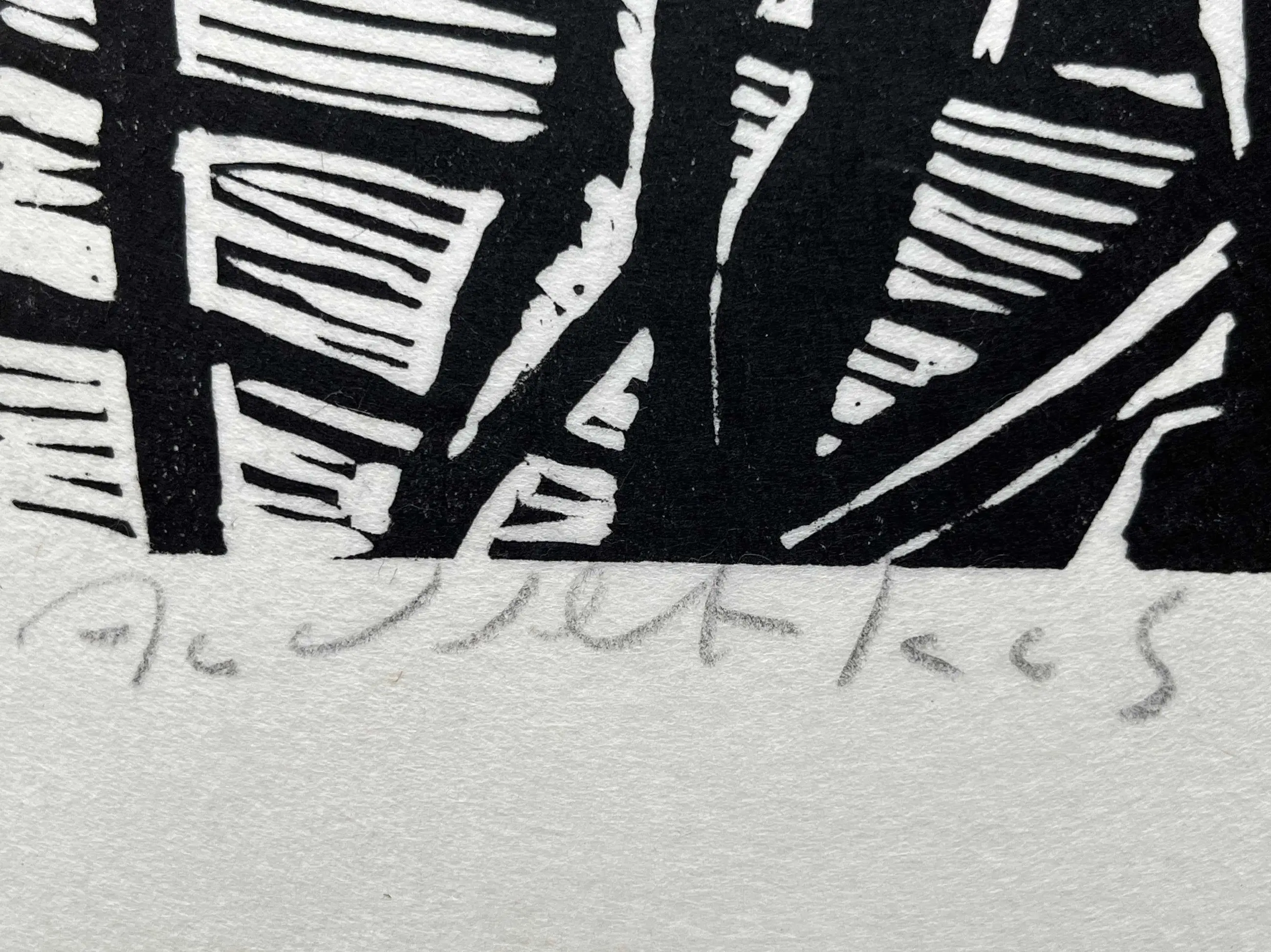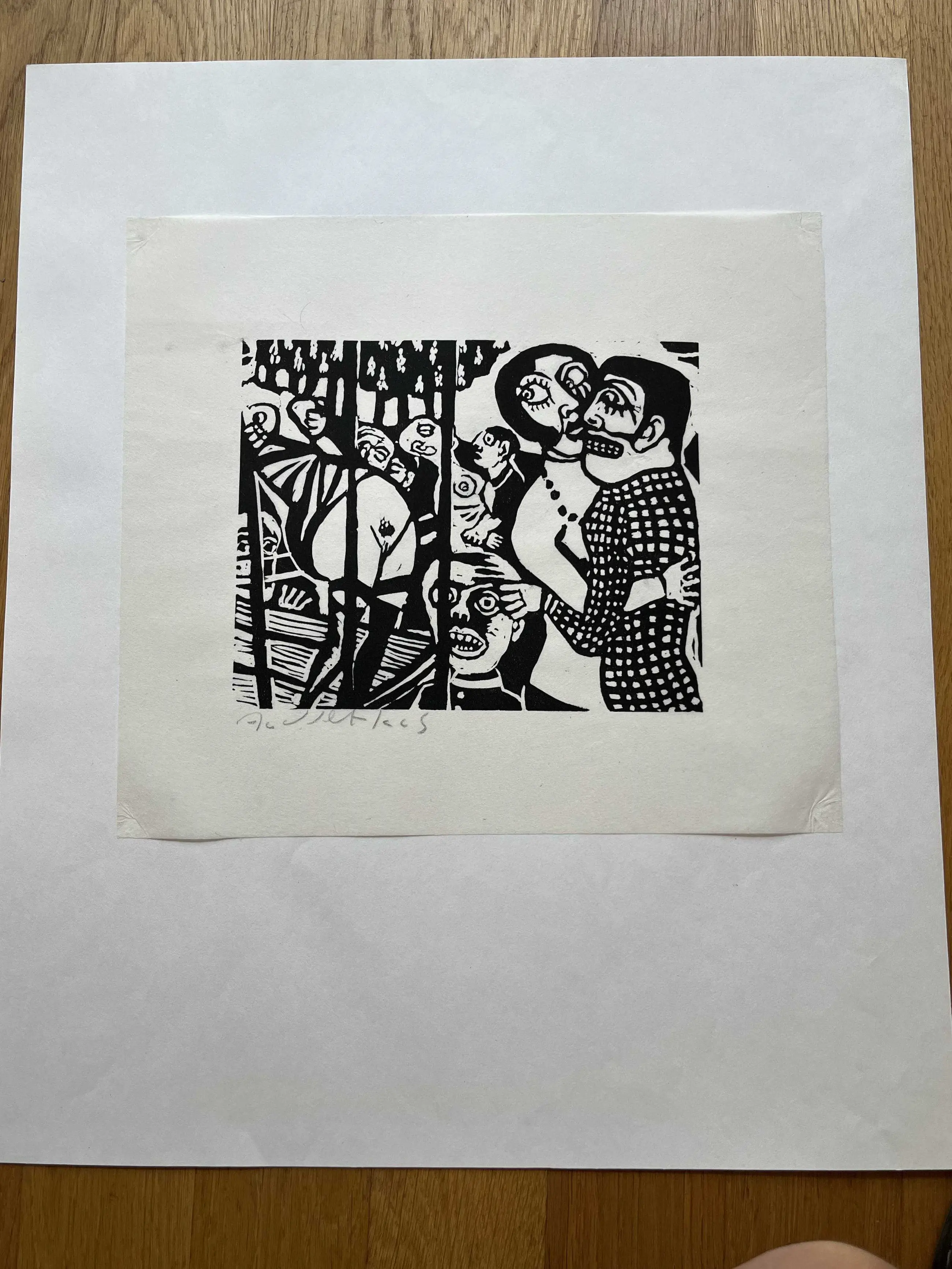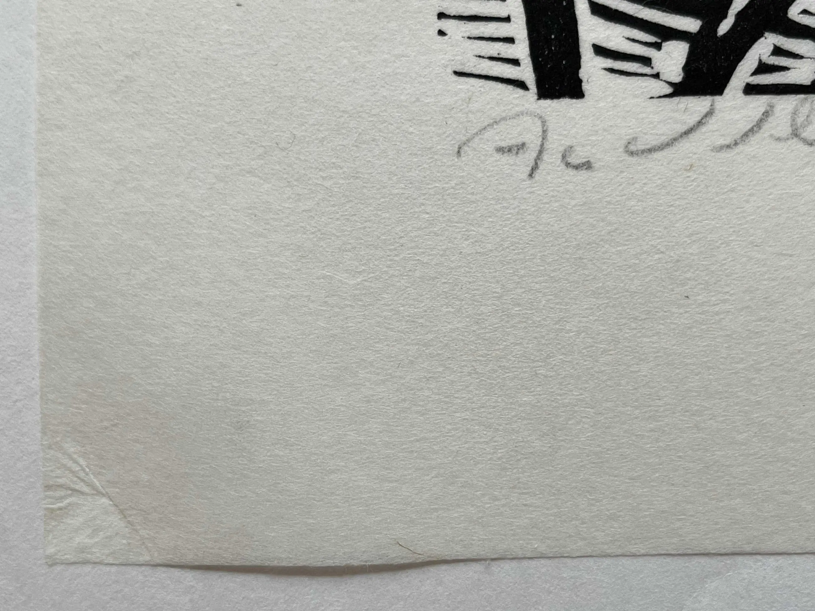 Uniek, karakteristiek grafiekblad op dun japans papier en waarschijnlijk voor de stevigheid op wit papier geplakt. Het blad heeft dan ook op de hoeken wat “plakvouwtjes”. Werk komt uit goede collectie. Afmeting afbeelding 20 x 25 cm. Blad 34 x 38,5 cm. Wit papier 60 x 50 cm.
