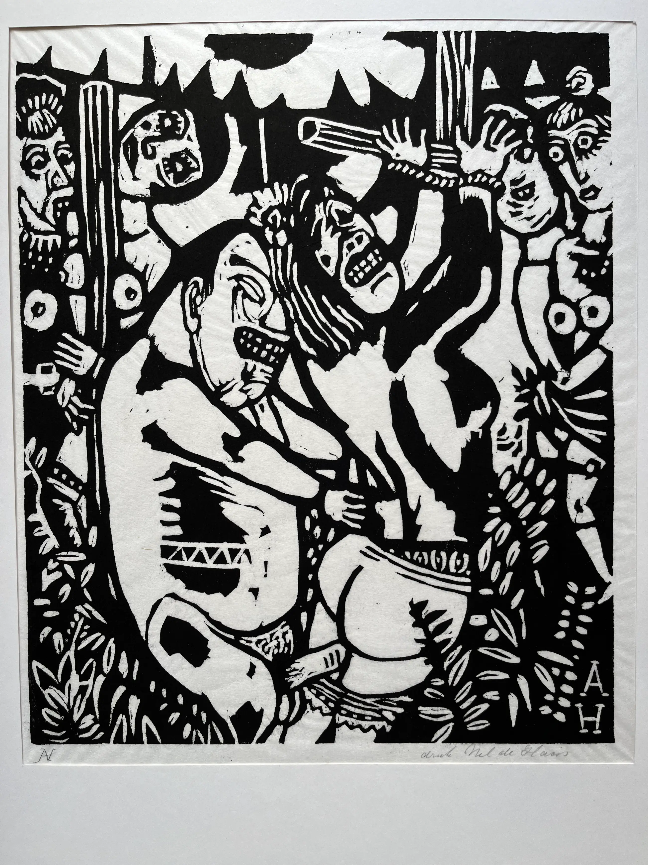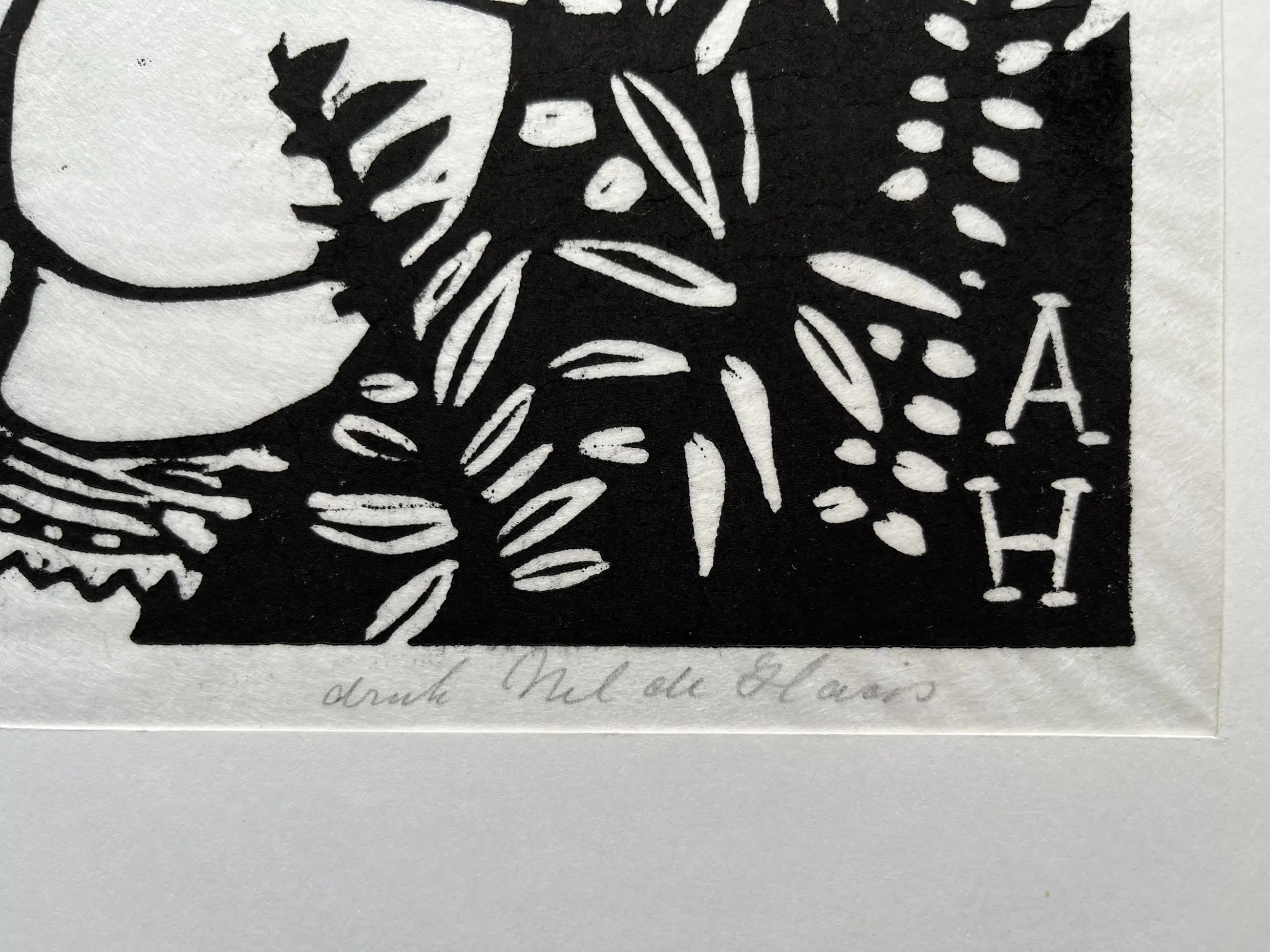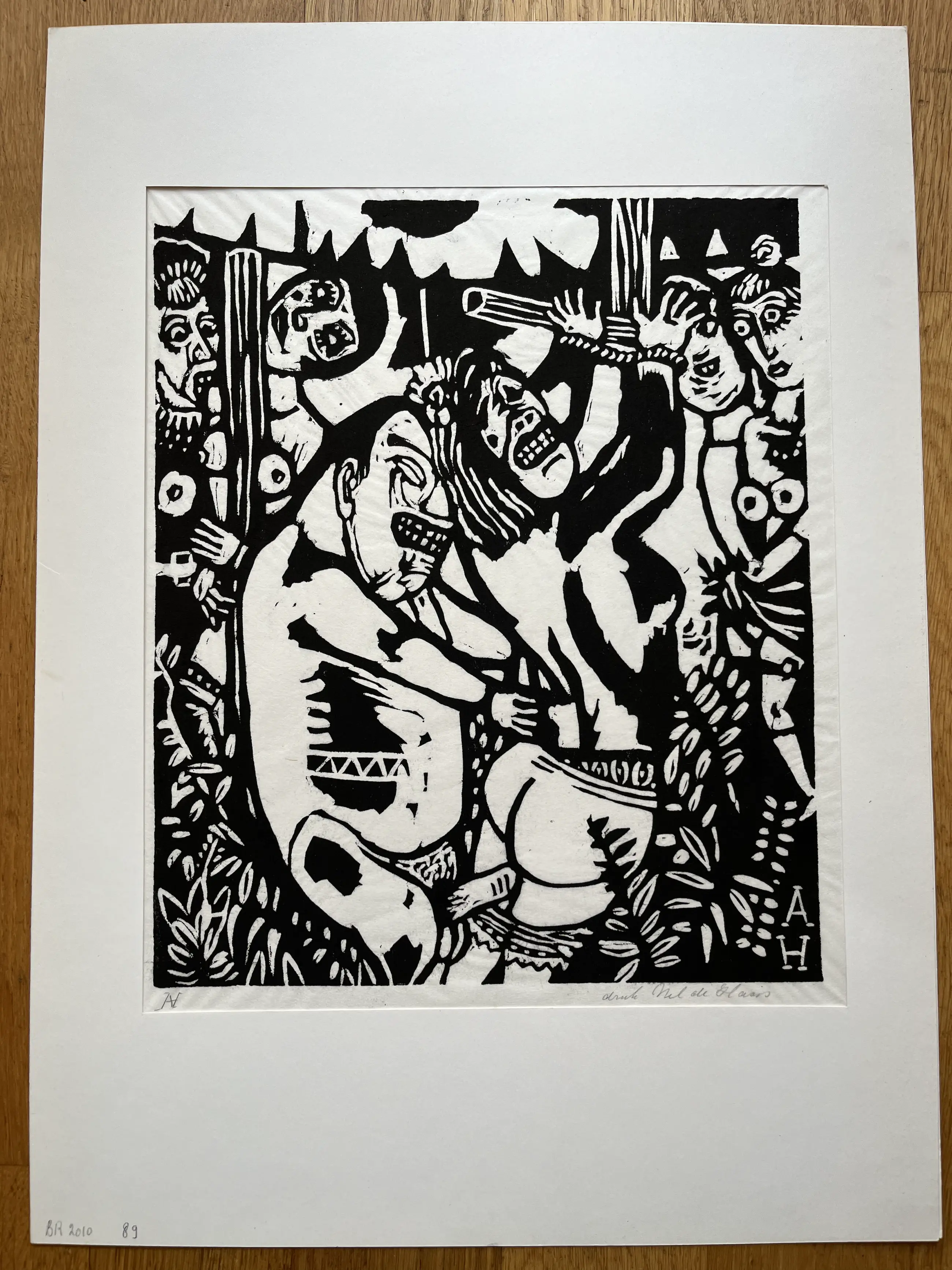 Erotische linosnede op Japans papier. Blad is geplakt in dunne passe partoute. Plakhoekjes vertonen wat rimpels. Gesigneerd door Nel de Haas. Oplage onbekend. Uniek? Afmeting afbeelding 35,5 x 29,5 cm. Blad 48,5 x 38,5 cm. Passe partoute. 55 x 40 cm.