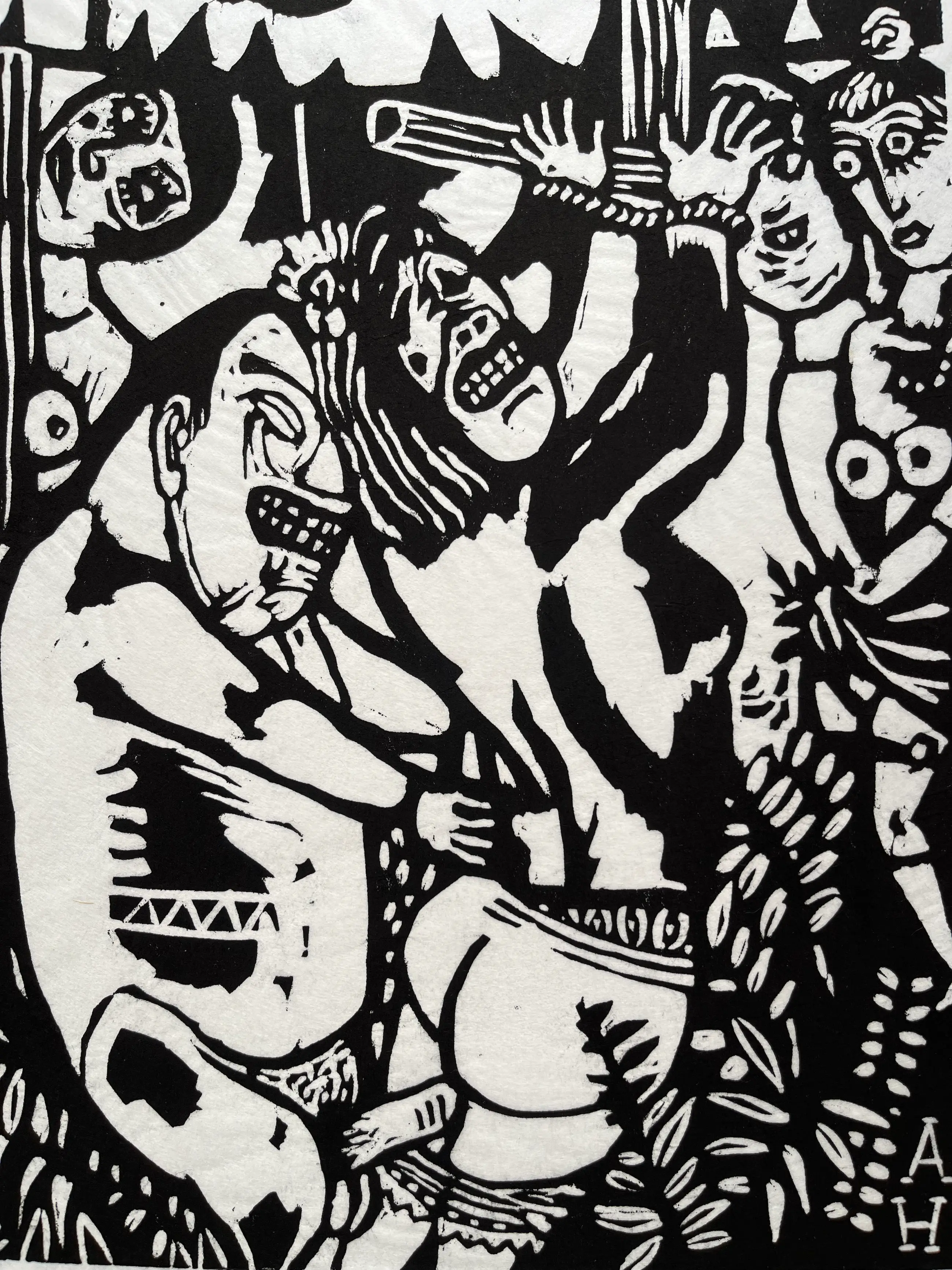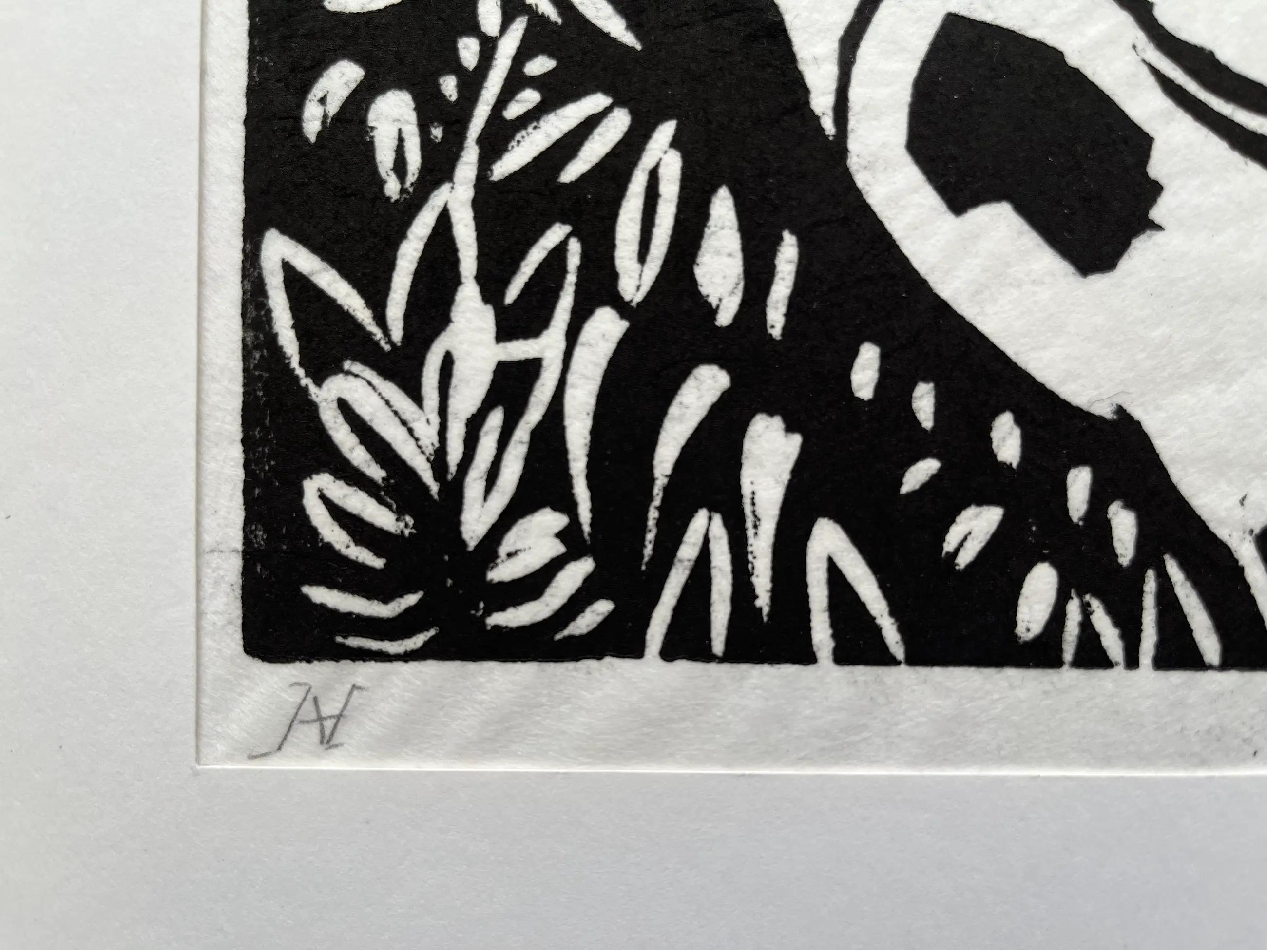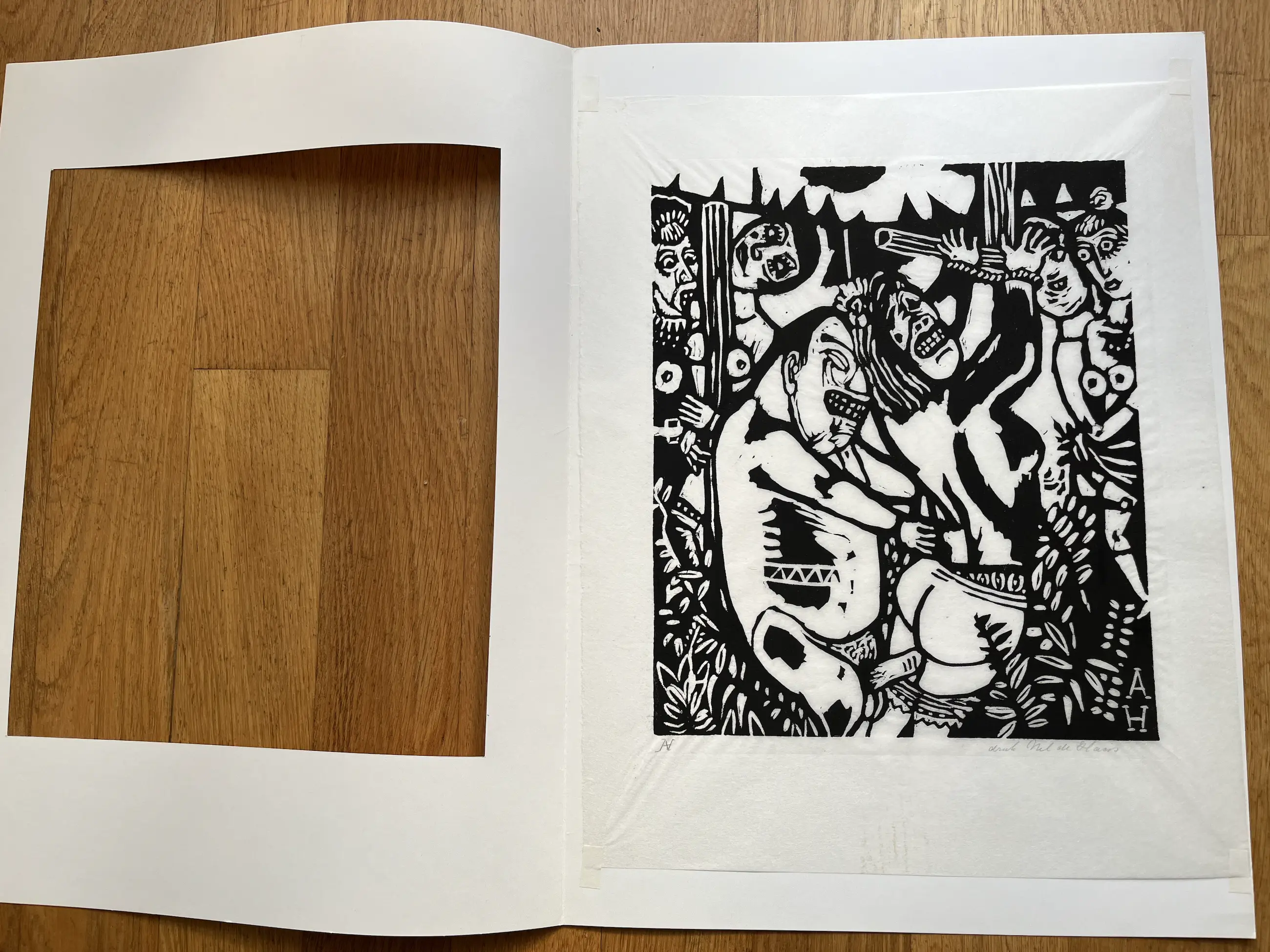 Erotische linosnede op Japans papier. Blad is geplakt in dunne passe partoute. Plakhoekjes vertonen wat rimpels. Gesigneerd door Nel de Haas. Oplage onbekend. Uniek? Afmeting afbeelding 35,5 x 29,5 cm. Blad 48,5 x 38,5 cm. Passe partoute. 55 x 40 cm.