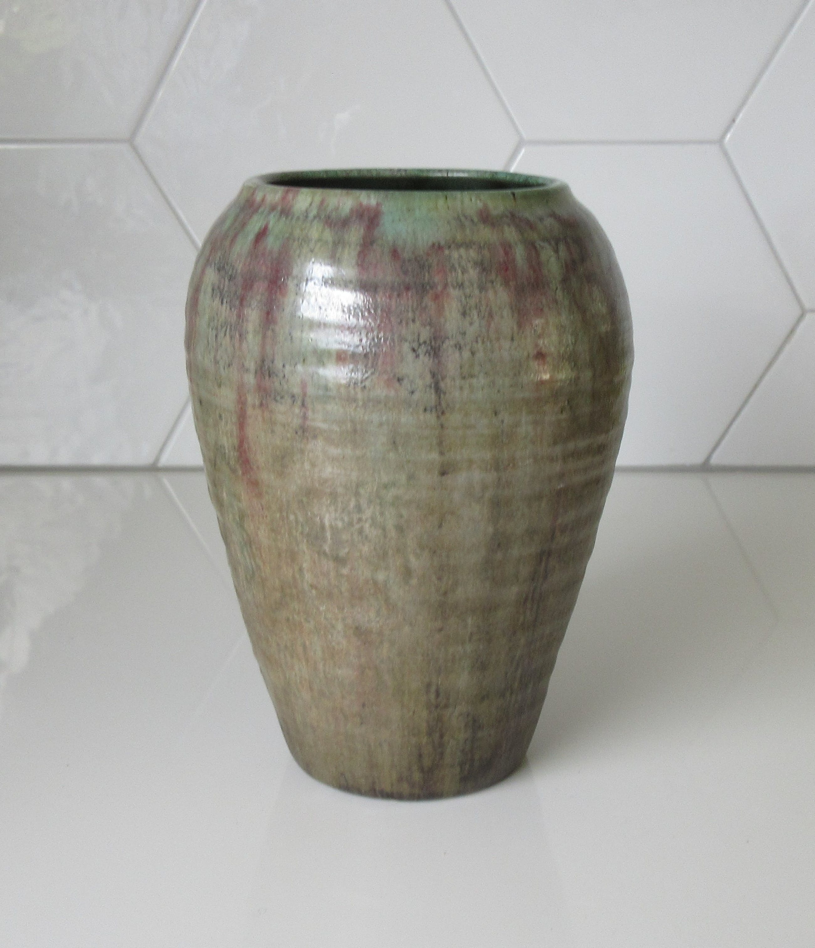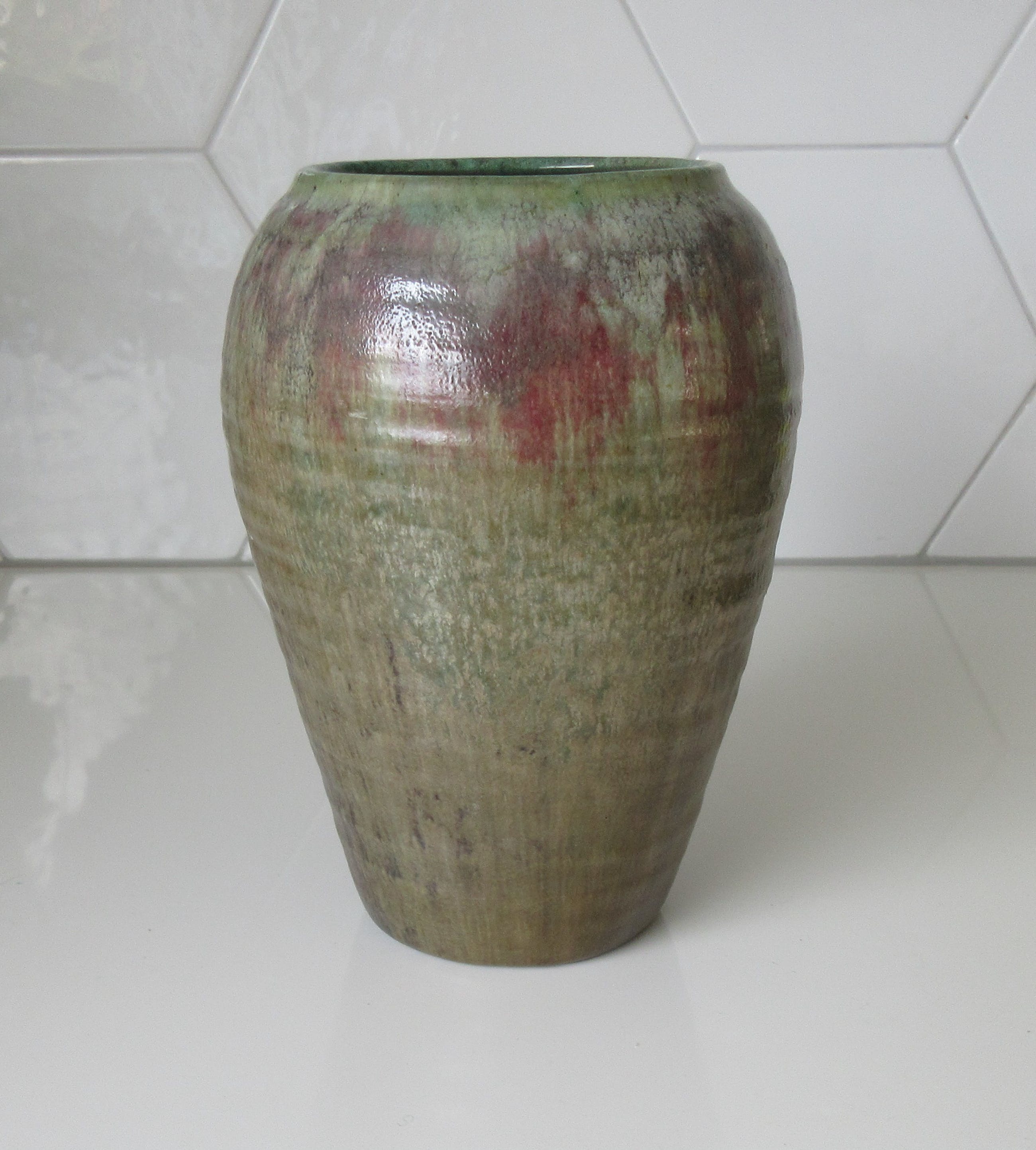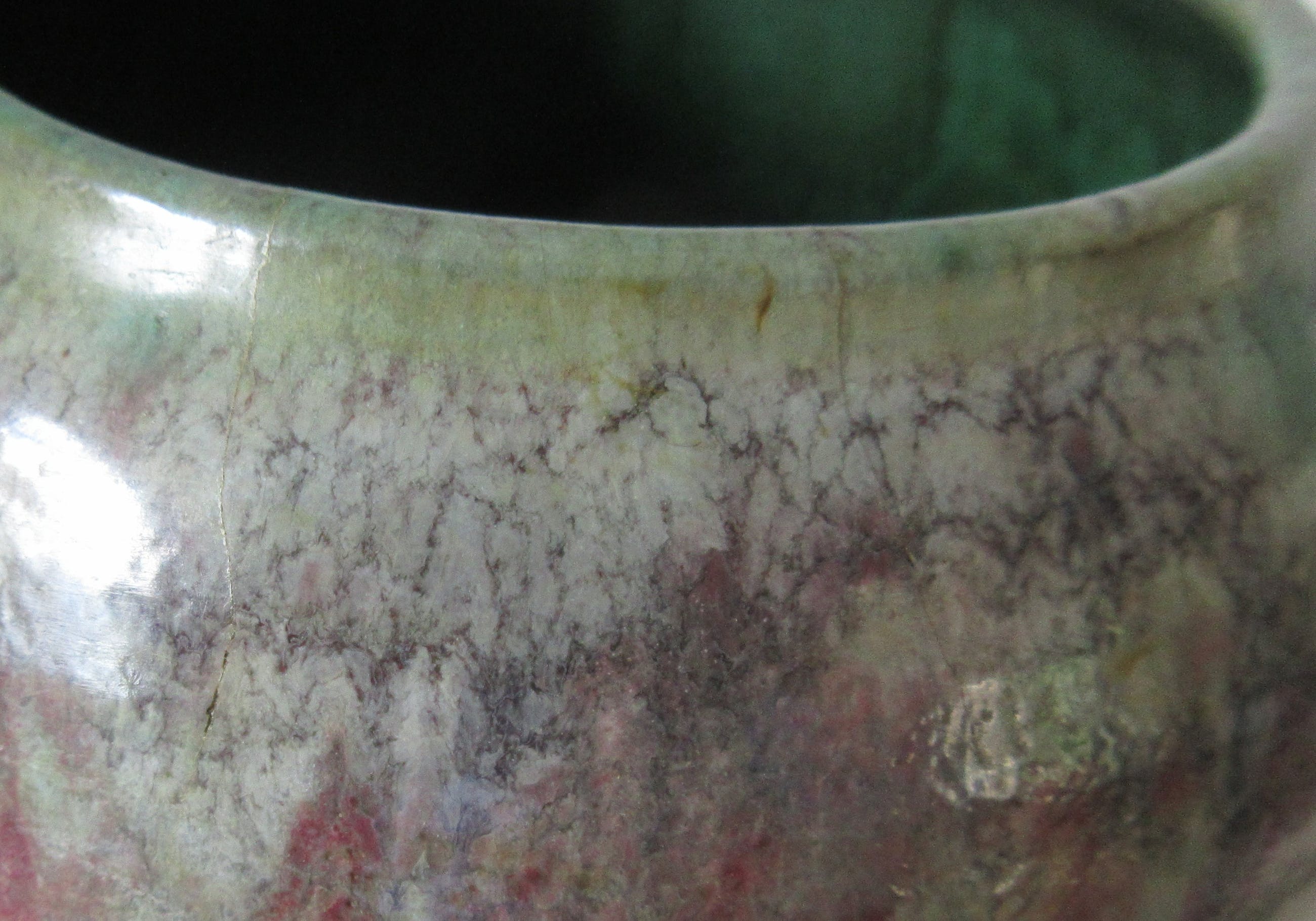 Art nouveau met prachtig stroomglazuur in de kleuren; zilver, grijs, groen, lila, roodpaars en zandkleur. Helaas heeft de vaas op de bovenrand drie haarlijnen.