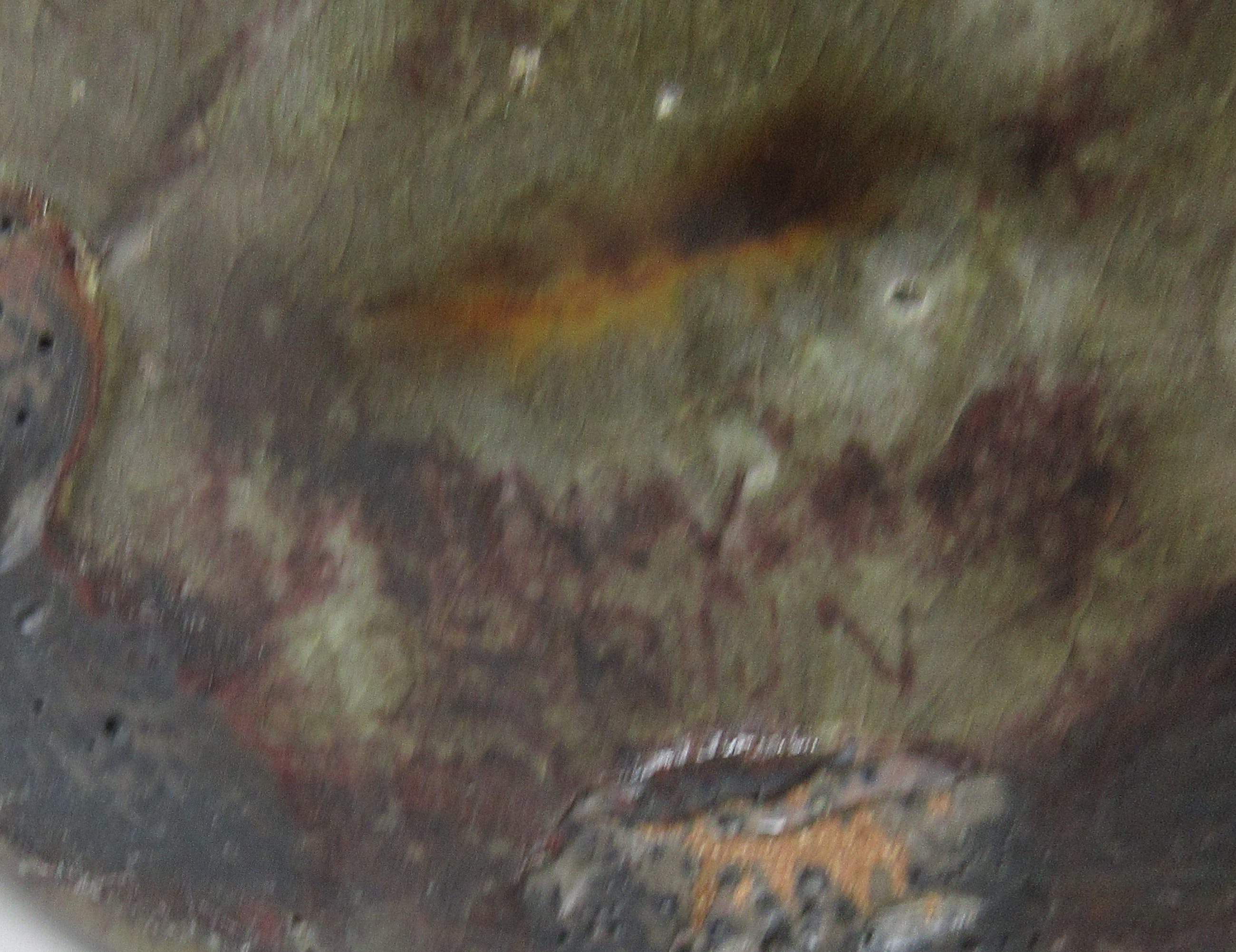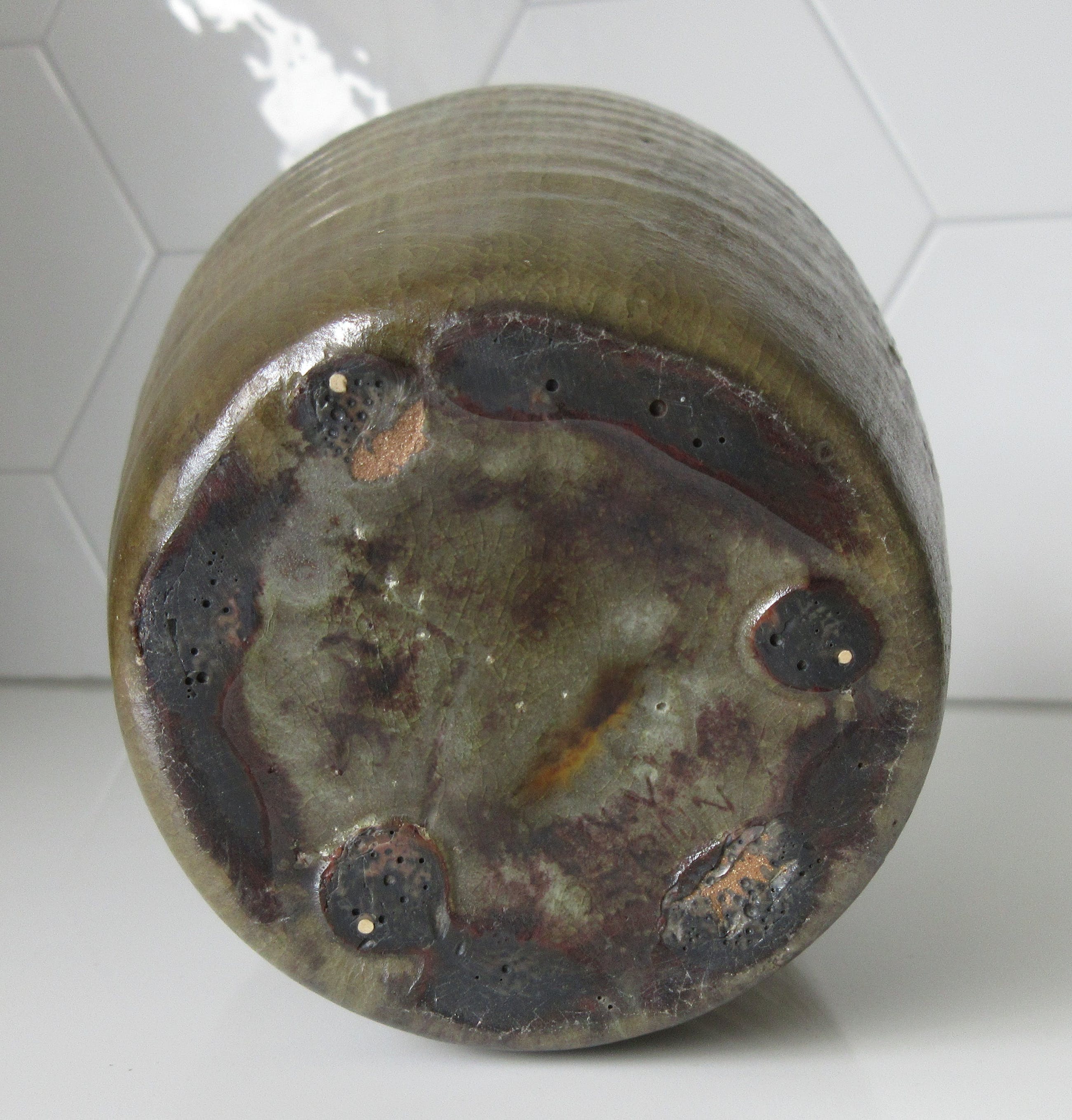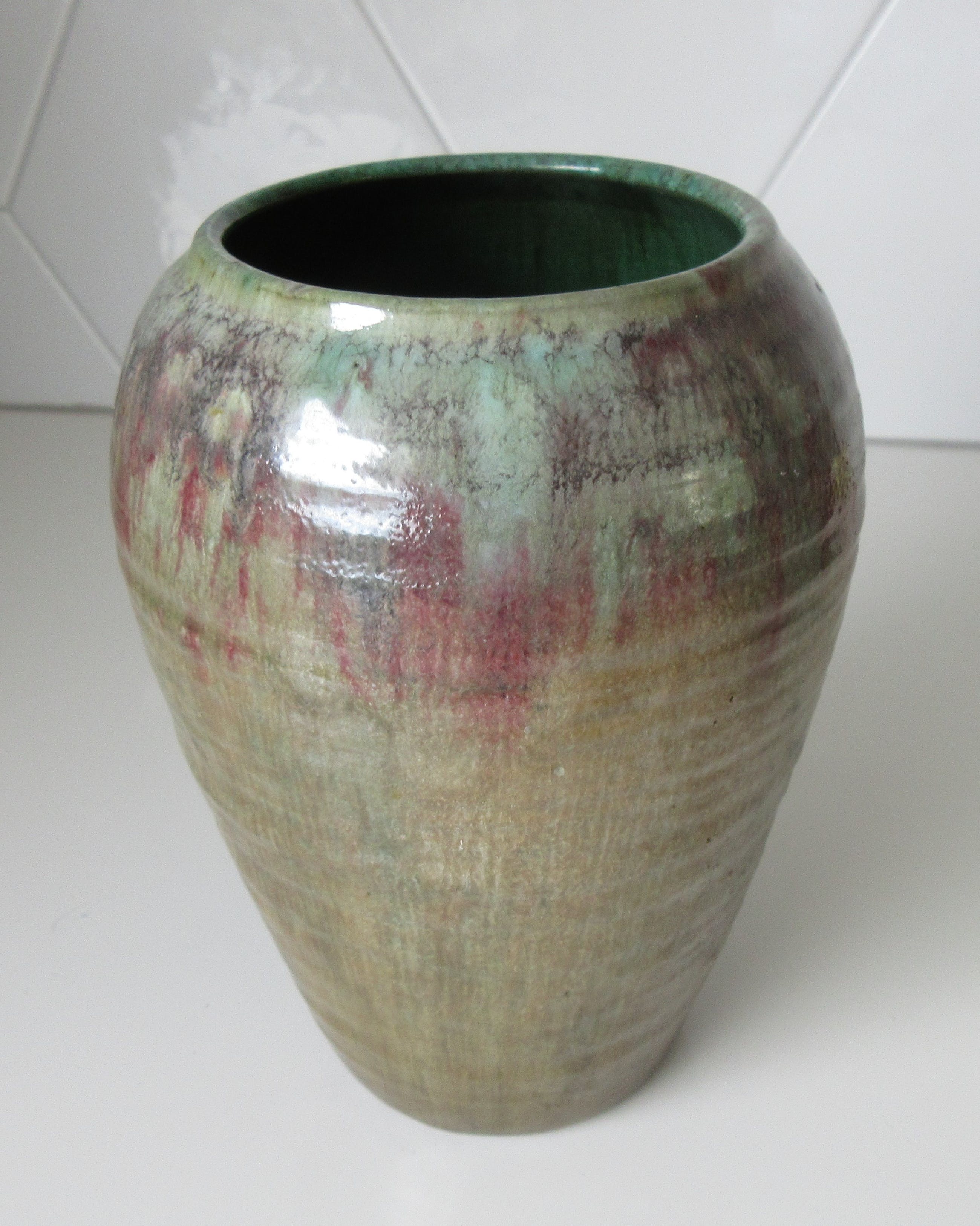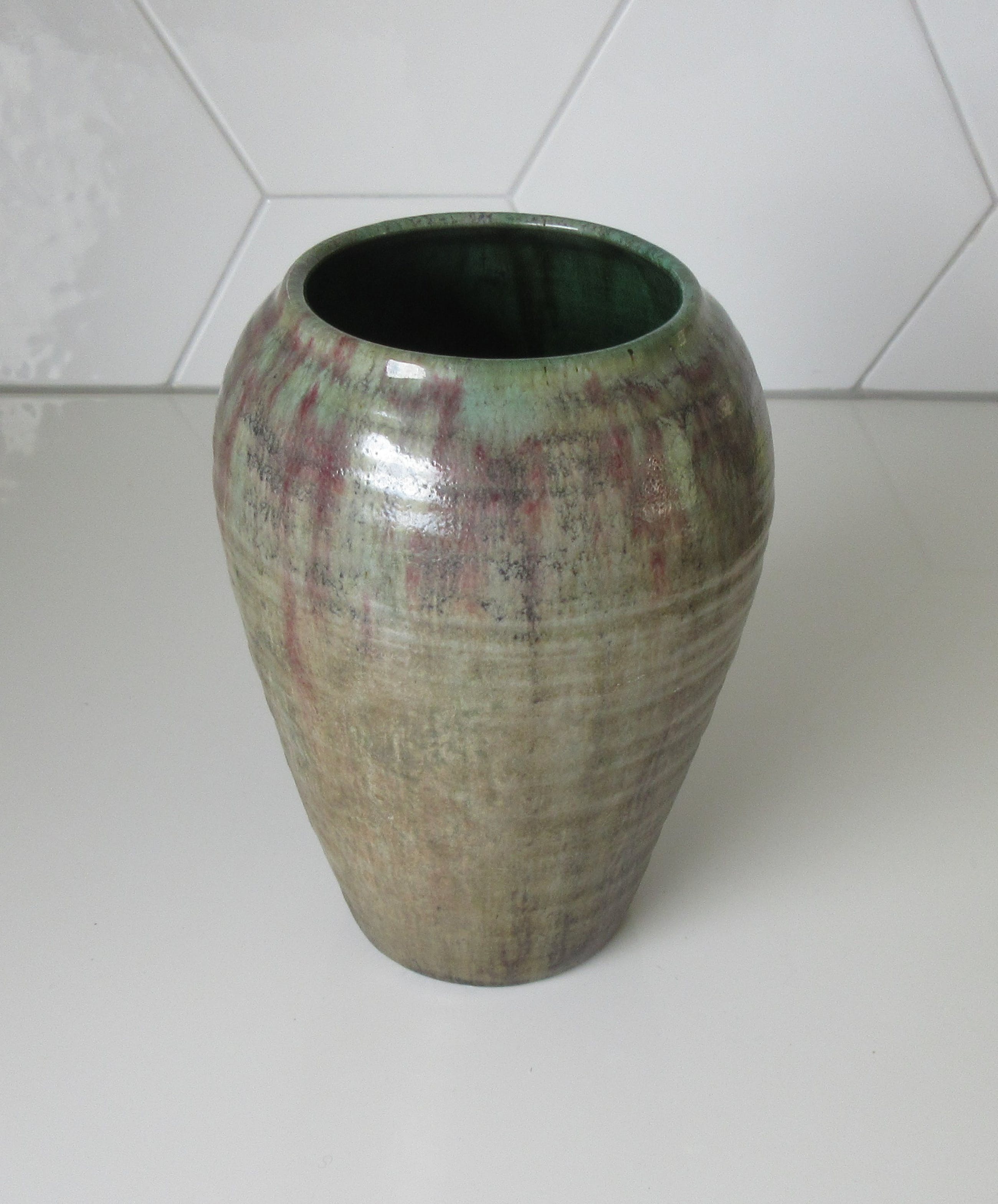 Art nouveau met prachtig stroomglazuur in de kleuren; zilver, grijs, groen, lila, roodpaars en zandkleur. Helaas heeft de vaas op de bovenrand drie haarlijnen.