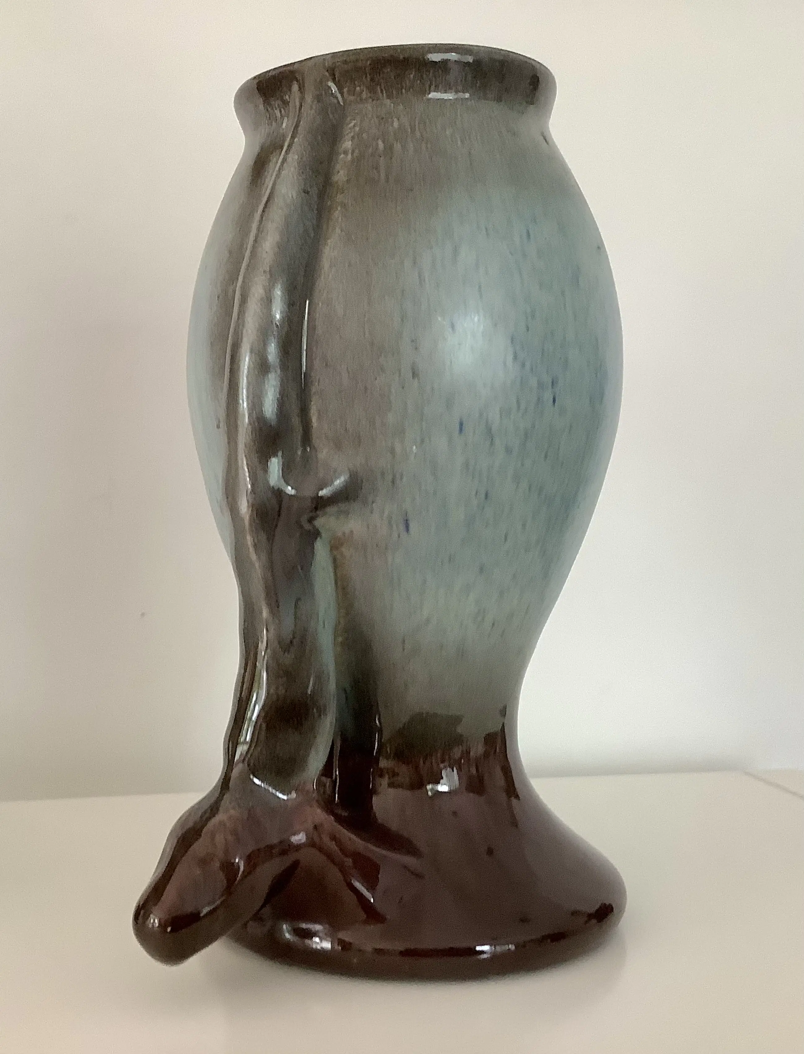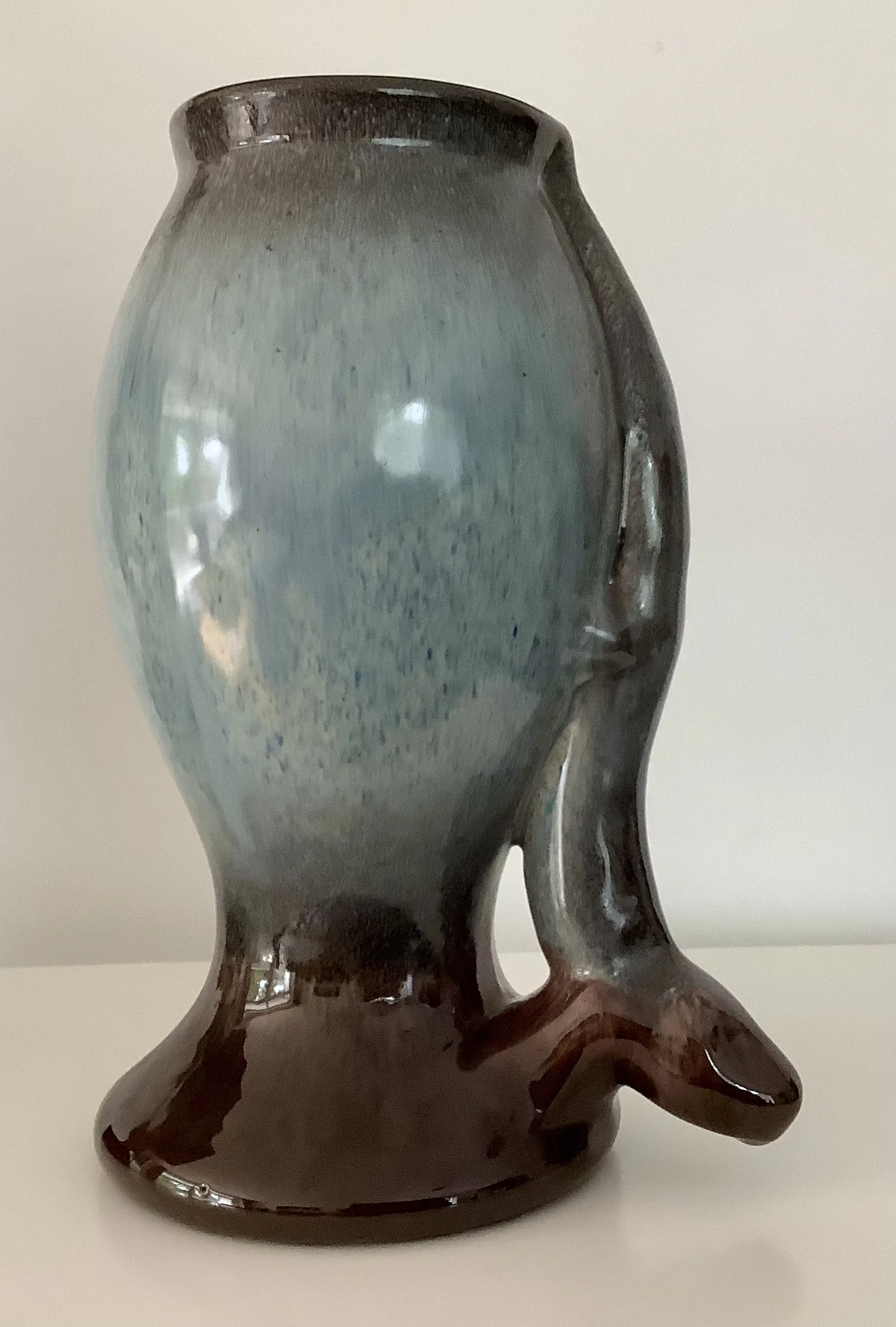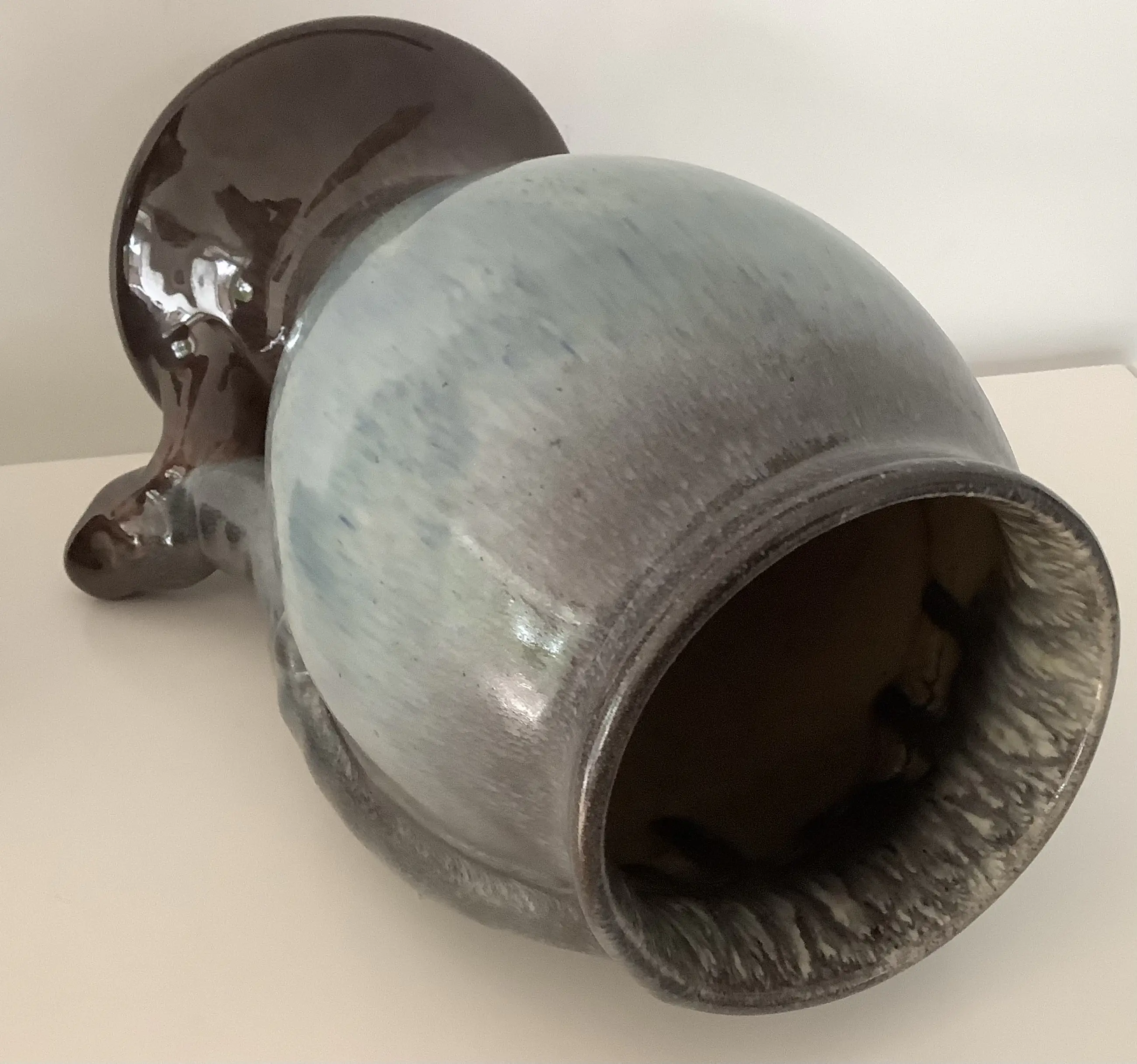 Fraaie kleurstelling, glans en mat glazuur. Oor in de vorm van een paling. Signed all over.