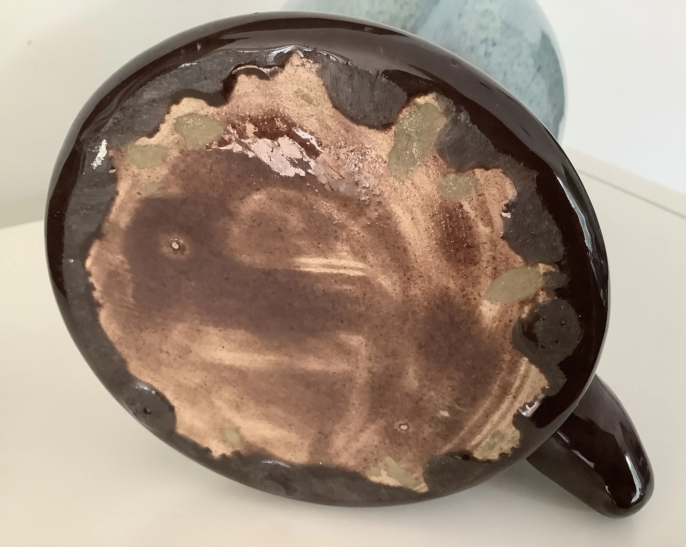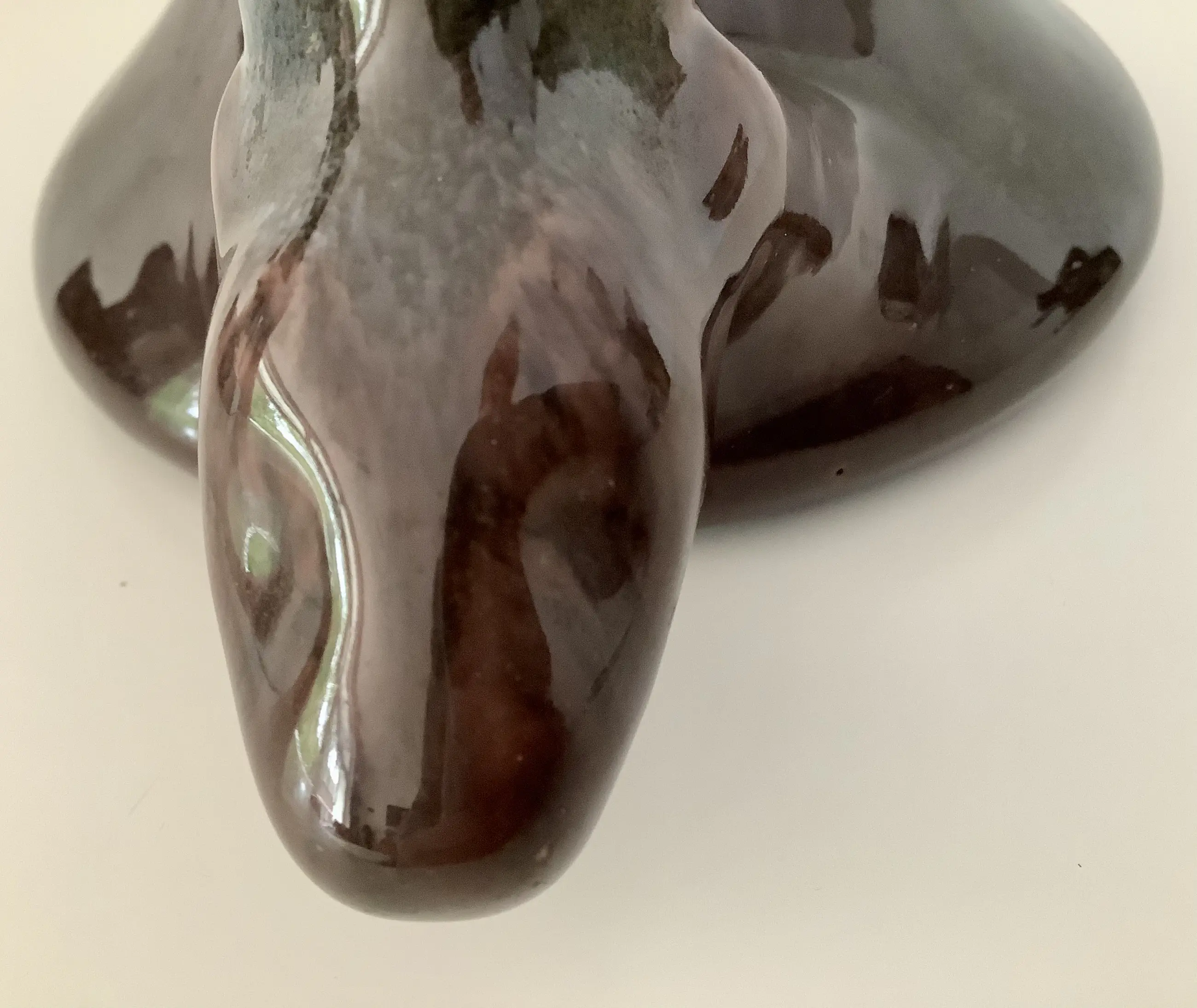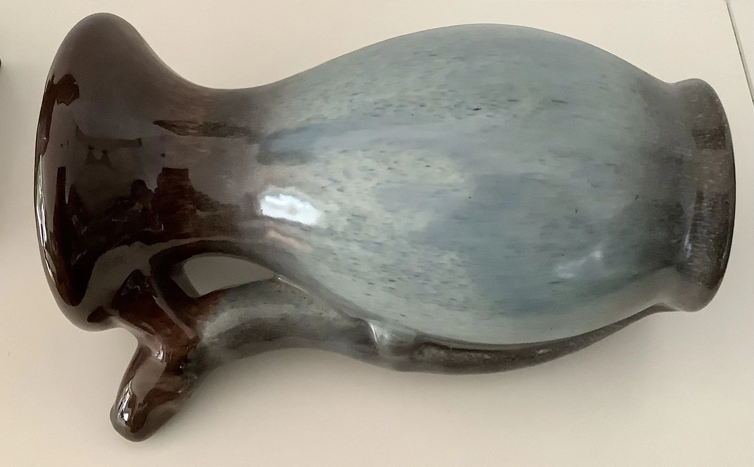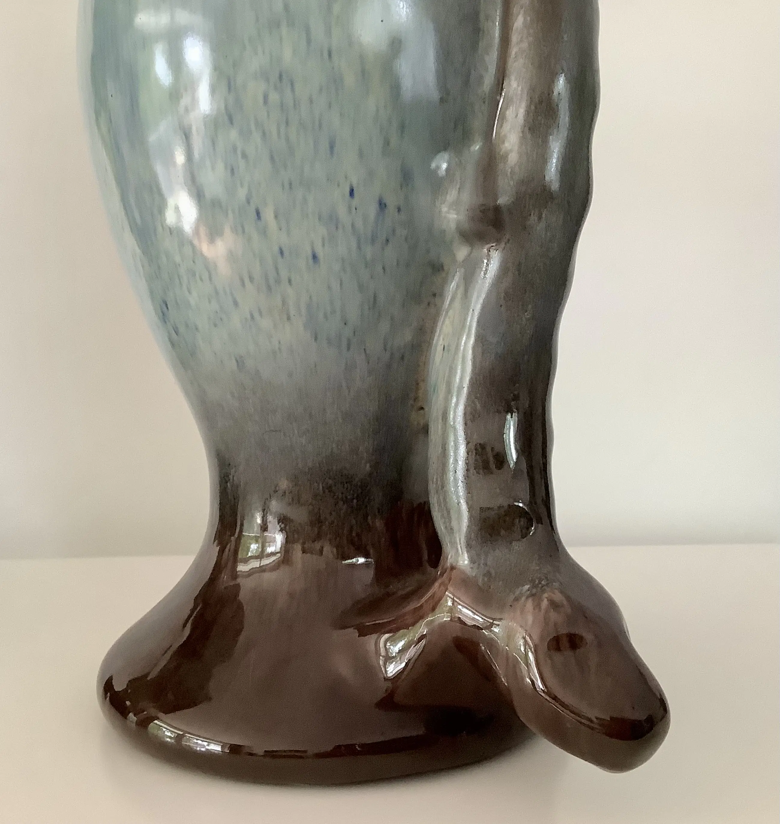 Fraaie kleurstelling, glans en mat glazuur. Oor in de vorm van een paling. Signed all over.