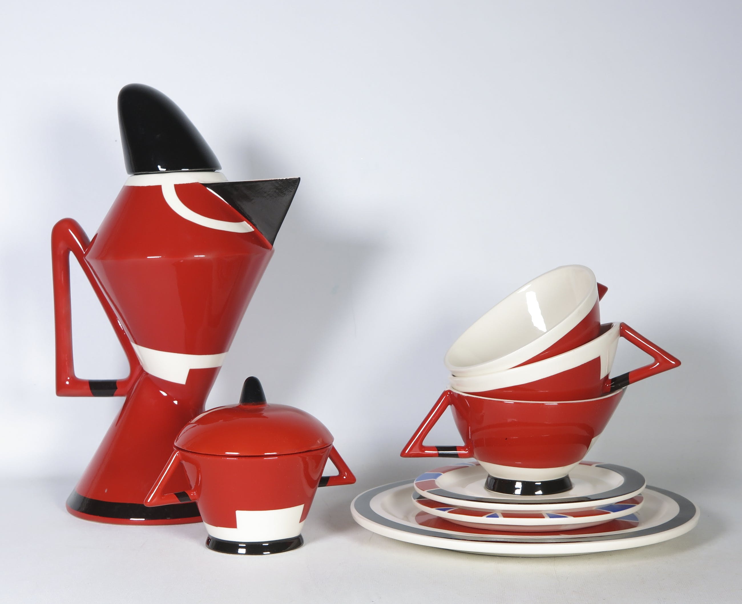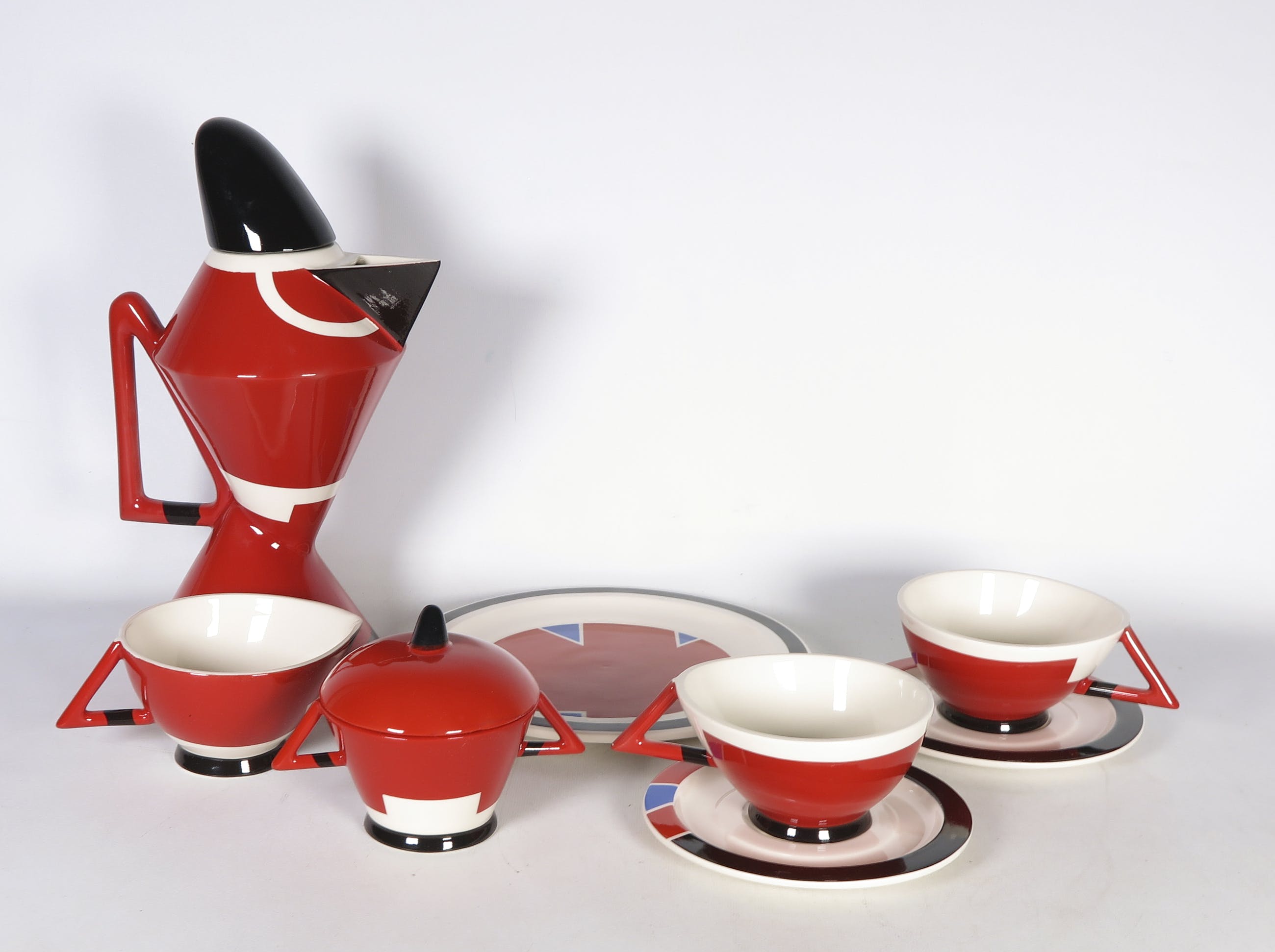 8-delig theeservies uitgevoerd in geglazuurd steengoed. Dit servies voor twee personen bevat 1 theepot met deksel, twee theekopjes met schotels, één melkkannetje, één suikerpotje en één bord. Alle items zijn op onderzijde gemerkt met: 'Parsons School of Design New-York City', en merkteken van Villeroy & Boch. Gelimiteerde oplage van 50.
