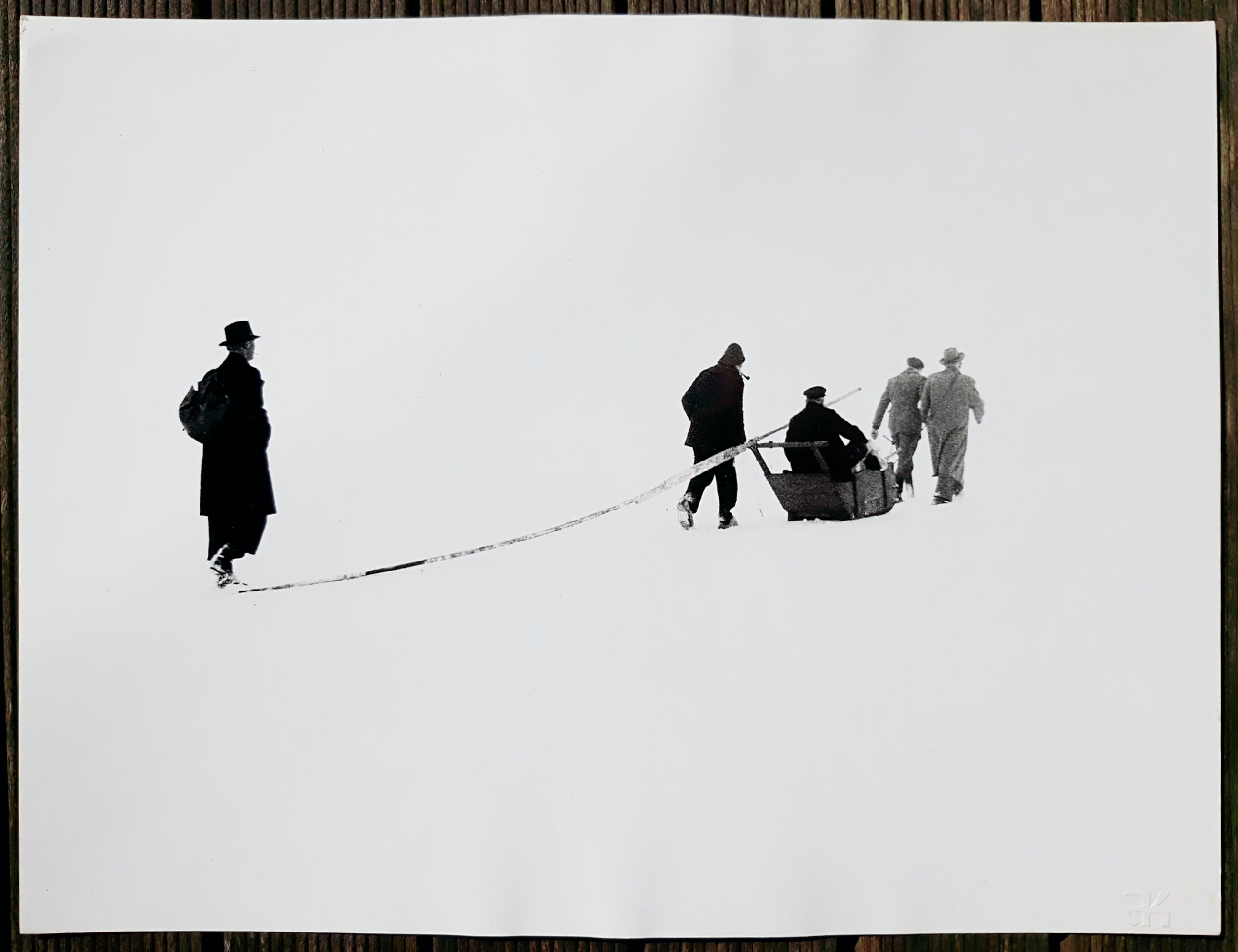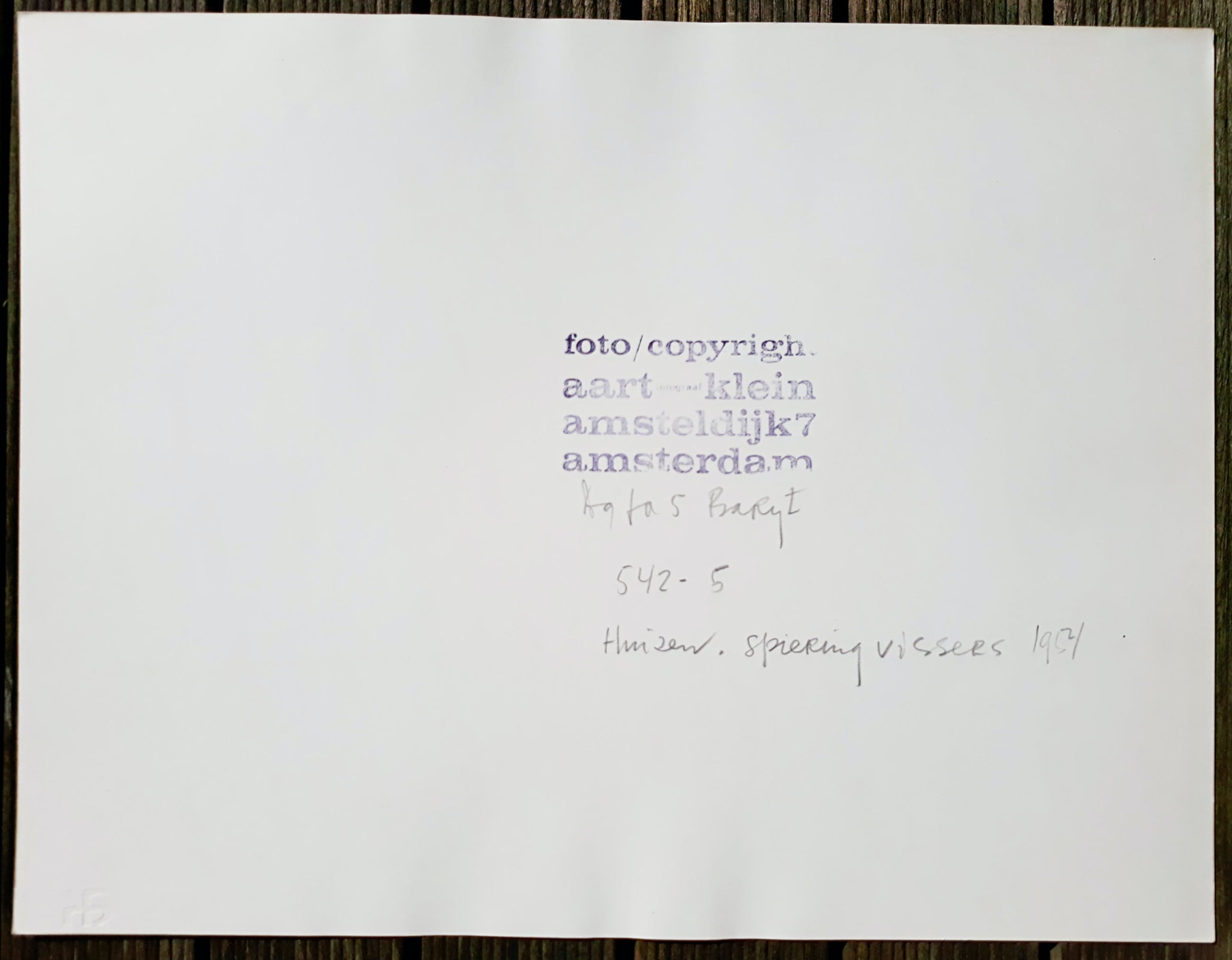 Bekende, karakteristieke foto van Aart Klein uit 1954. Gelatinezilverdruk, ongesigneerd maar met preegstempel in de hoek rechtsonder en studiostempel in verso. Een latere print, achterop door Klein zelf met potlood gedateerd, gesitueerd, ge-antidateerd en van archiefcode voorzien. In zeer goede conditie.
