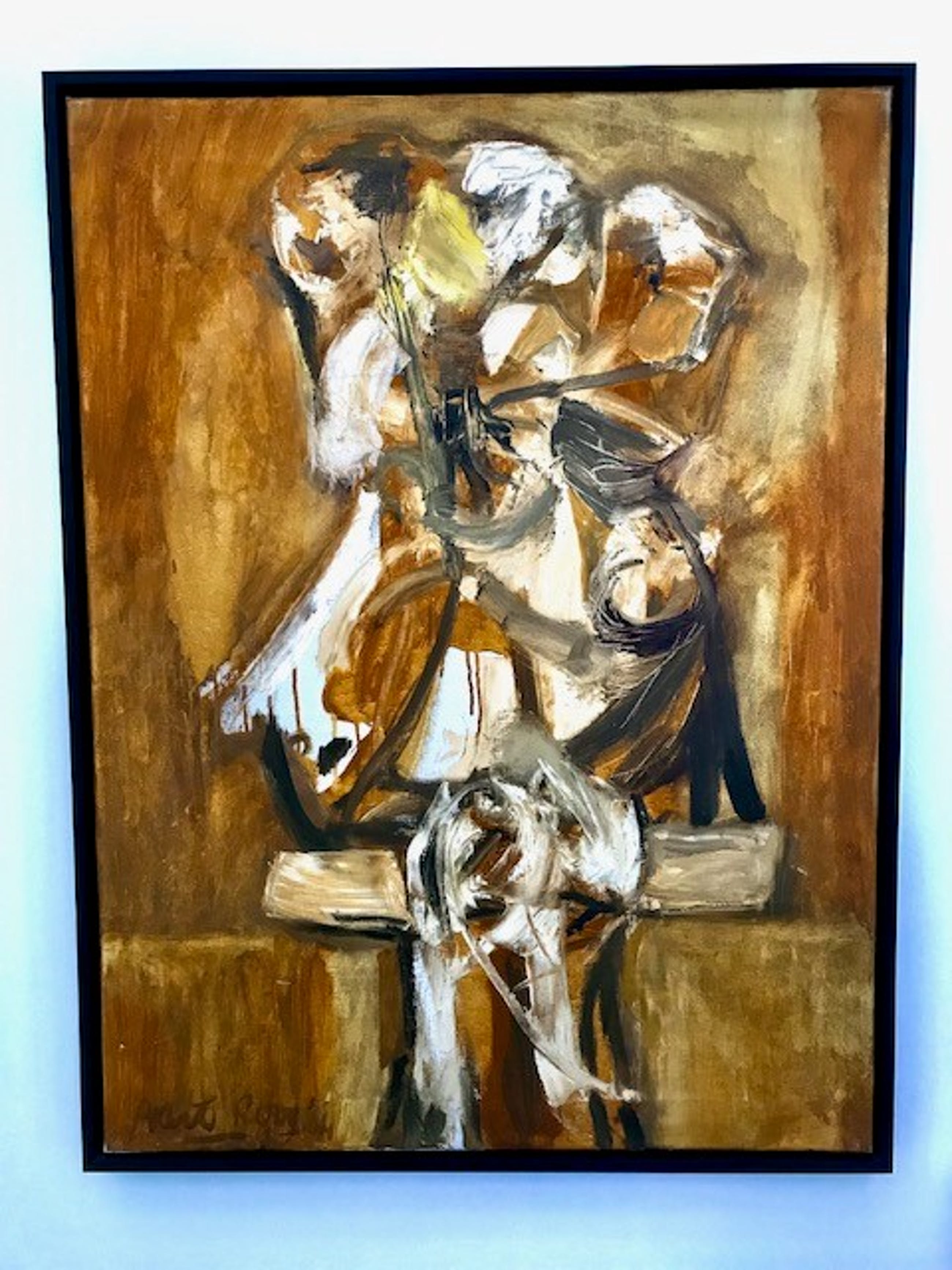 Te koop: schilderij van Aart Roos. Titel op achterzijde spieraam: "figuur in oker" Zijn stijl behoort tot het abstract expressionisme. Werk van Aart roos bevindt zich o.a. in de collectie van het Rijksmuseum Amsterdam, Rijkscollectie en de Gemeente Amsterdam.
