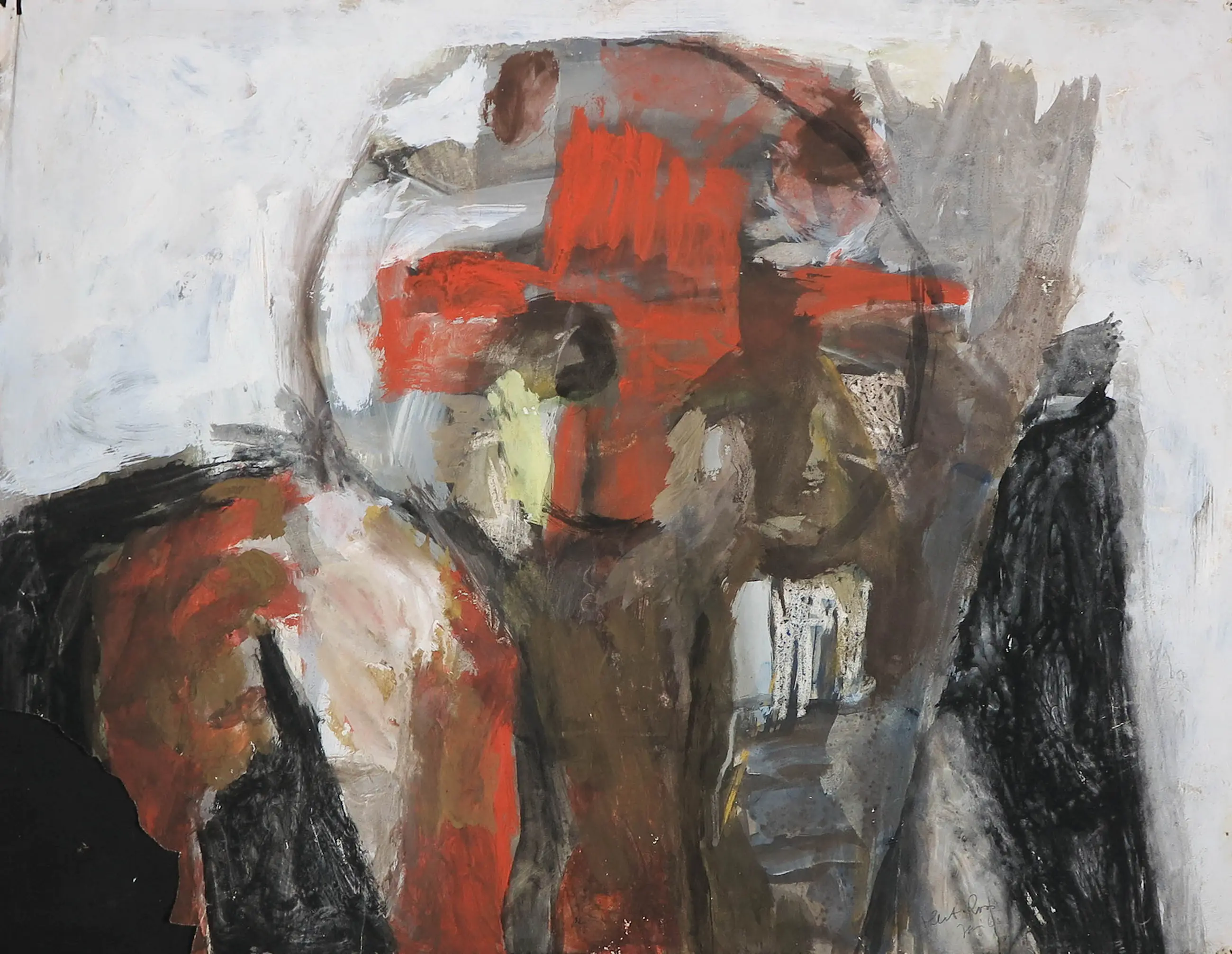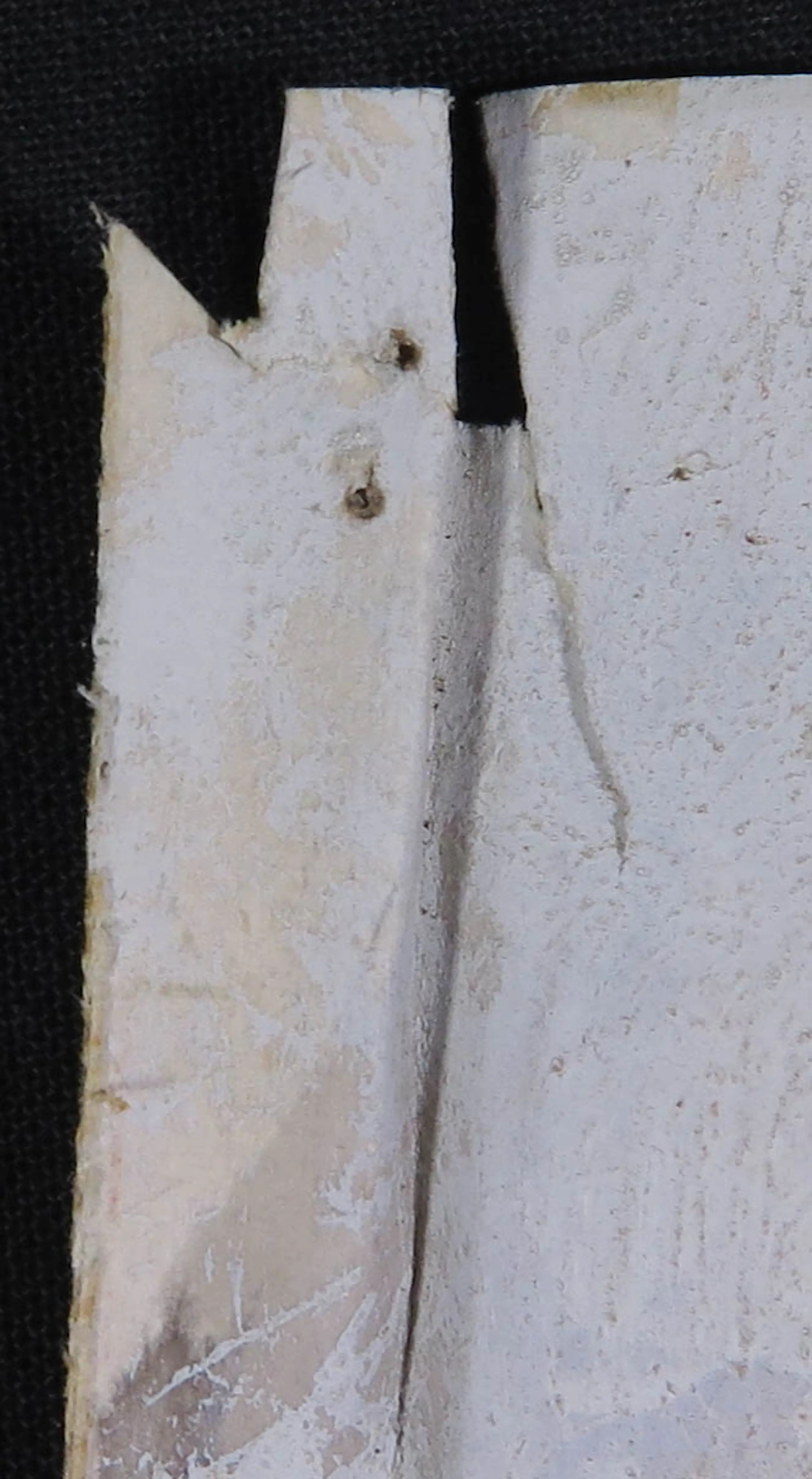 Het werk is beschadigd. Links onderin is een deel van het papier afgescheurd. Tevens bevat het papier in de linkerbovenhoek een vouw. Daarnaast zijn in alle hoeken kleine gaatjes zichtbaar. Zie de detailfoto's voor een indruk van de huidige staat van het werk.