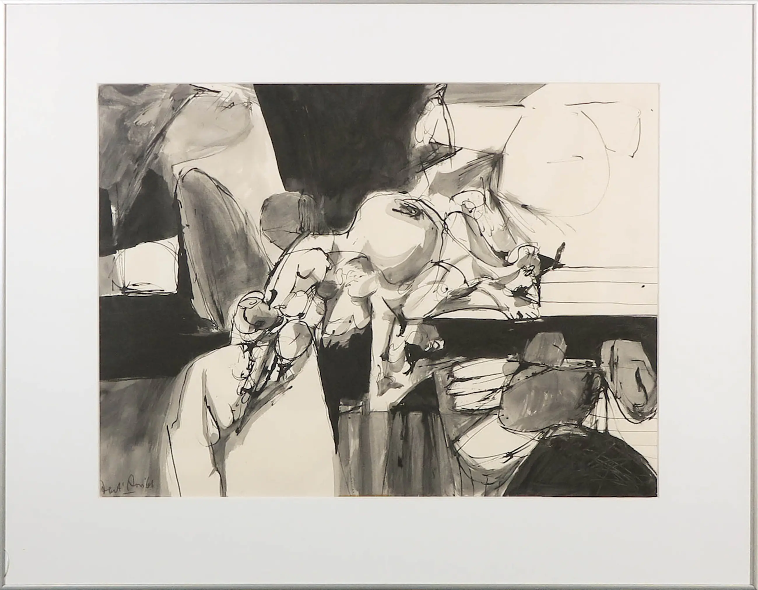 Gouache op papier door kunstenaar Aart Roos. Let op: de glasplaat is linksonder beschadigd. Het werk wordt geleverd met een monografie van de kunstenaar, zie foto's.