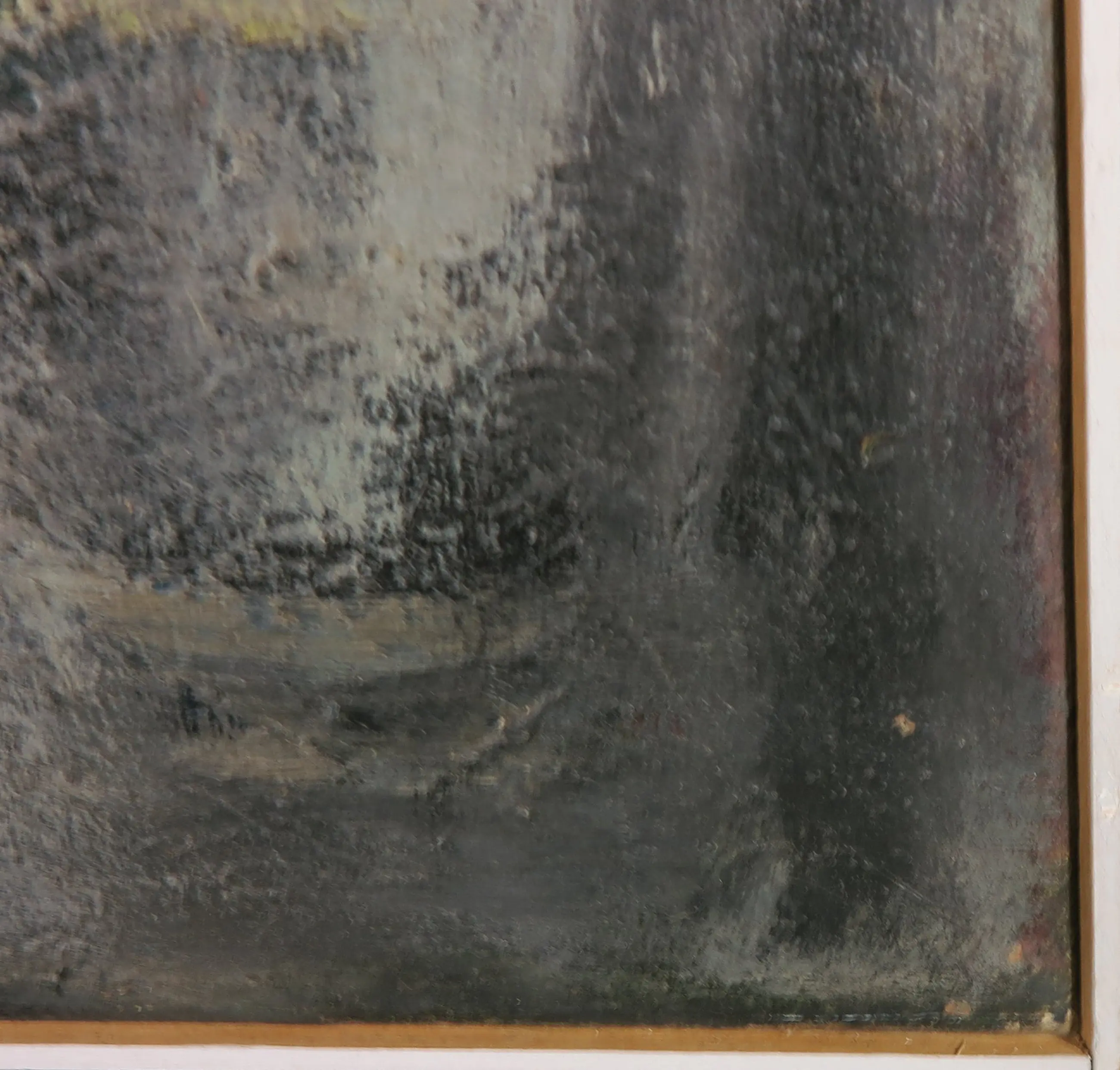 Er zijn wat langere lijnen met craquelévorming zichtbaar, met name links boven in de compositie. In de linker benedenhoek zit een klein plekje met verfverlies.