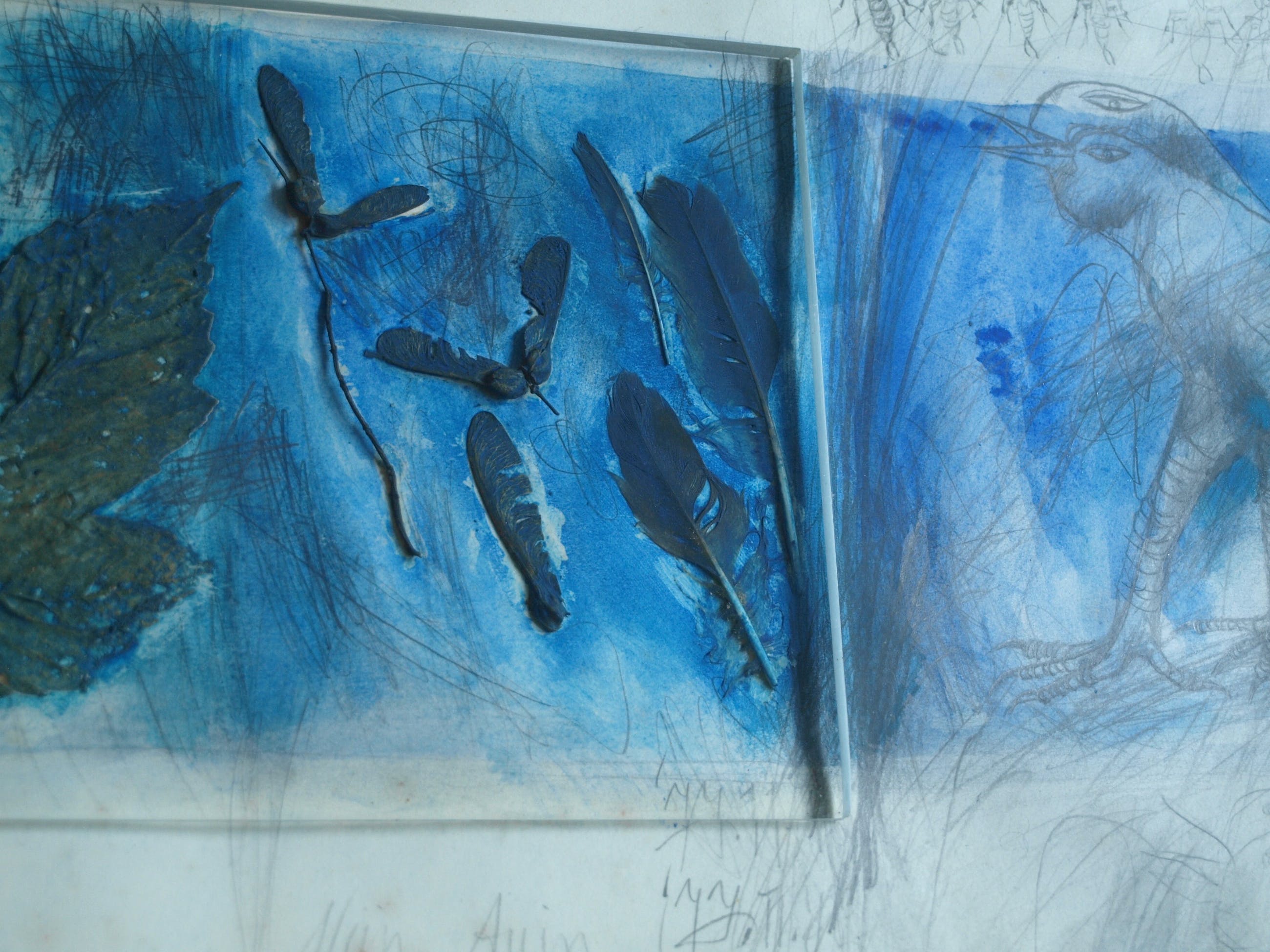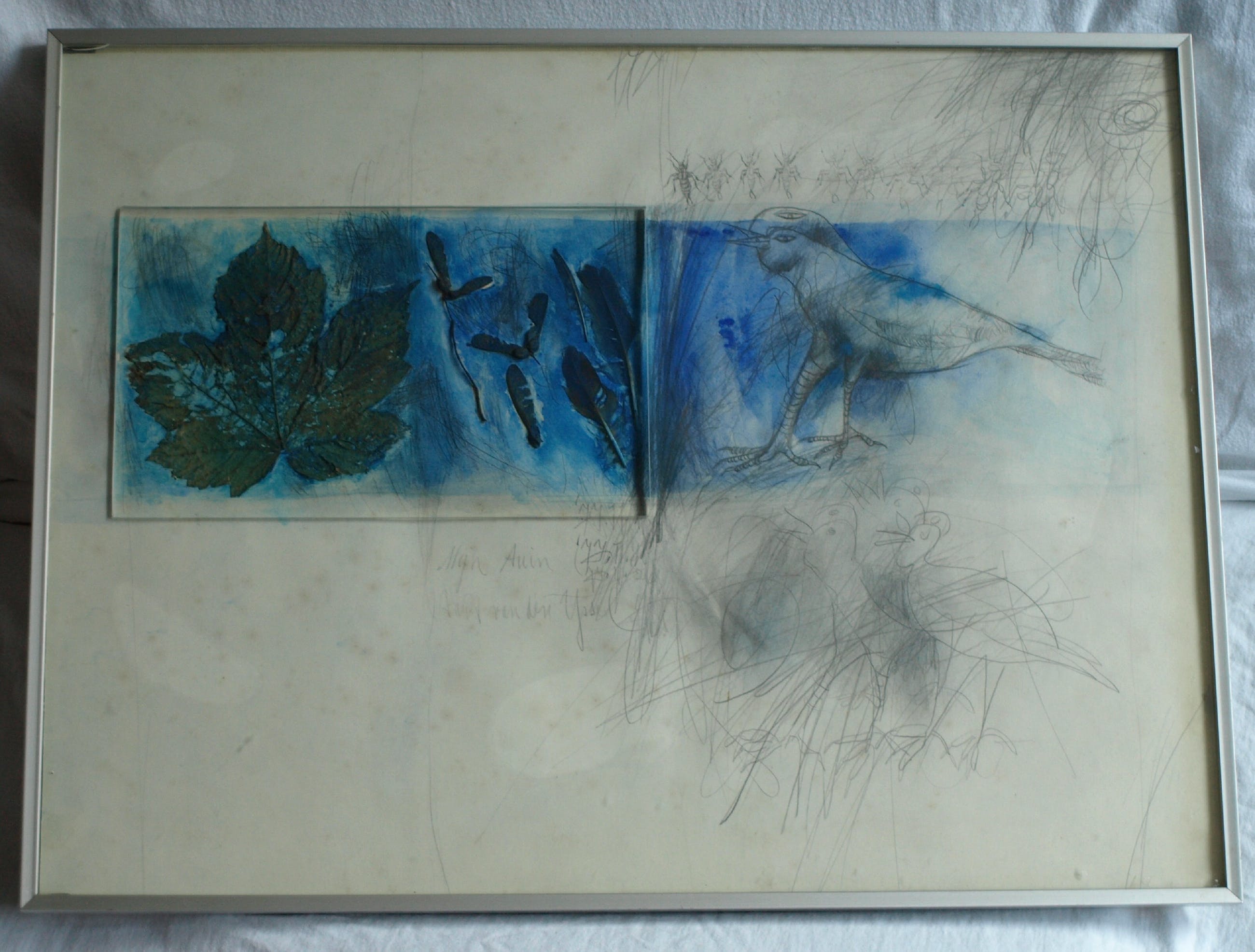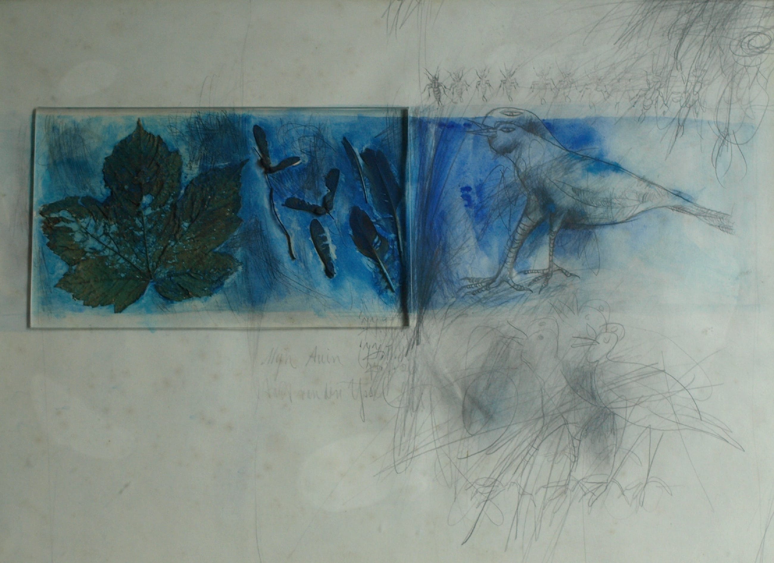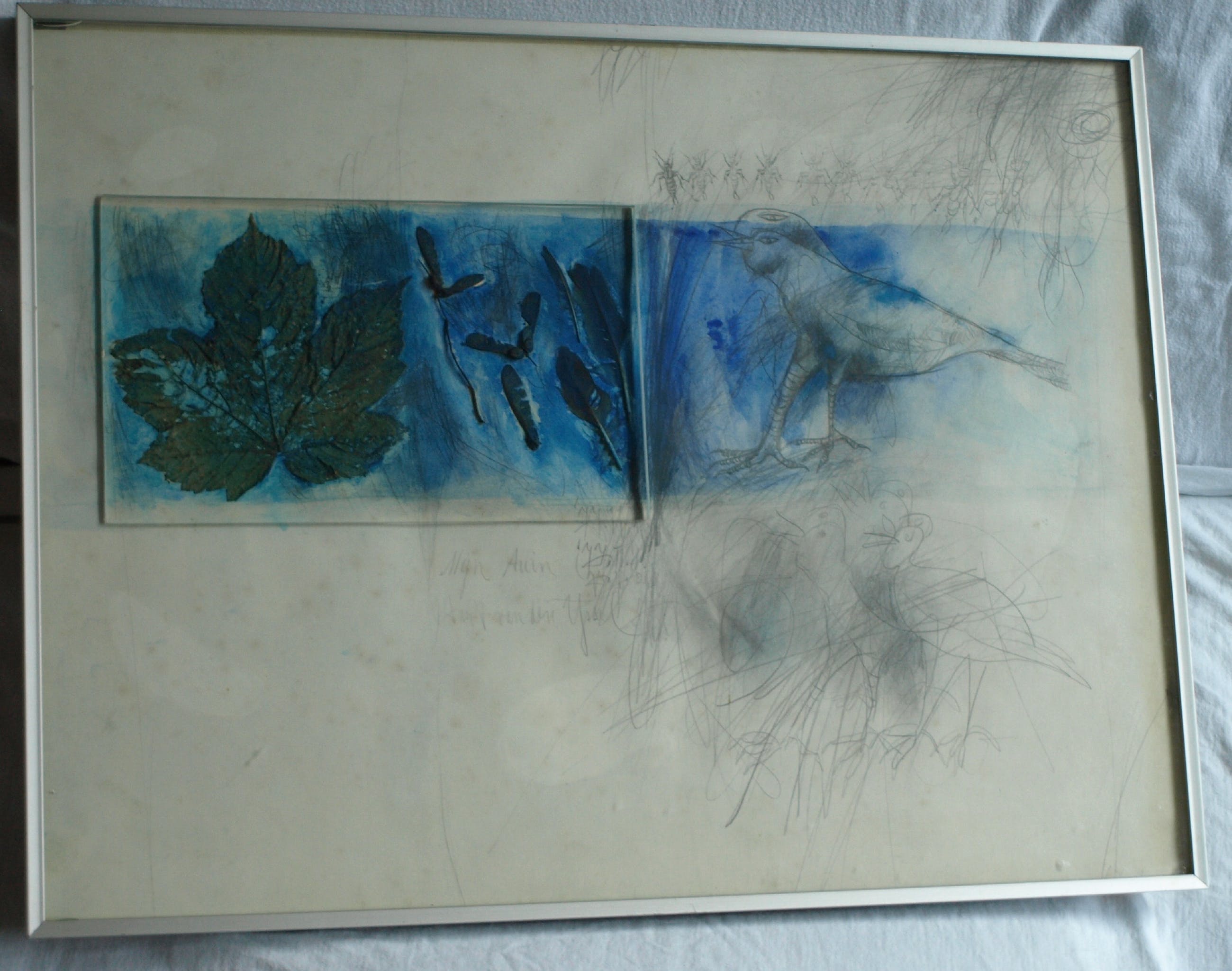 Een bijzondere combinatie van een collage met bladeren, een potloodtekening en acrylverf.