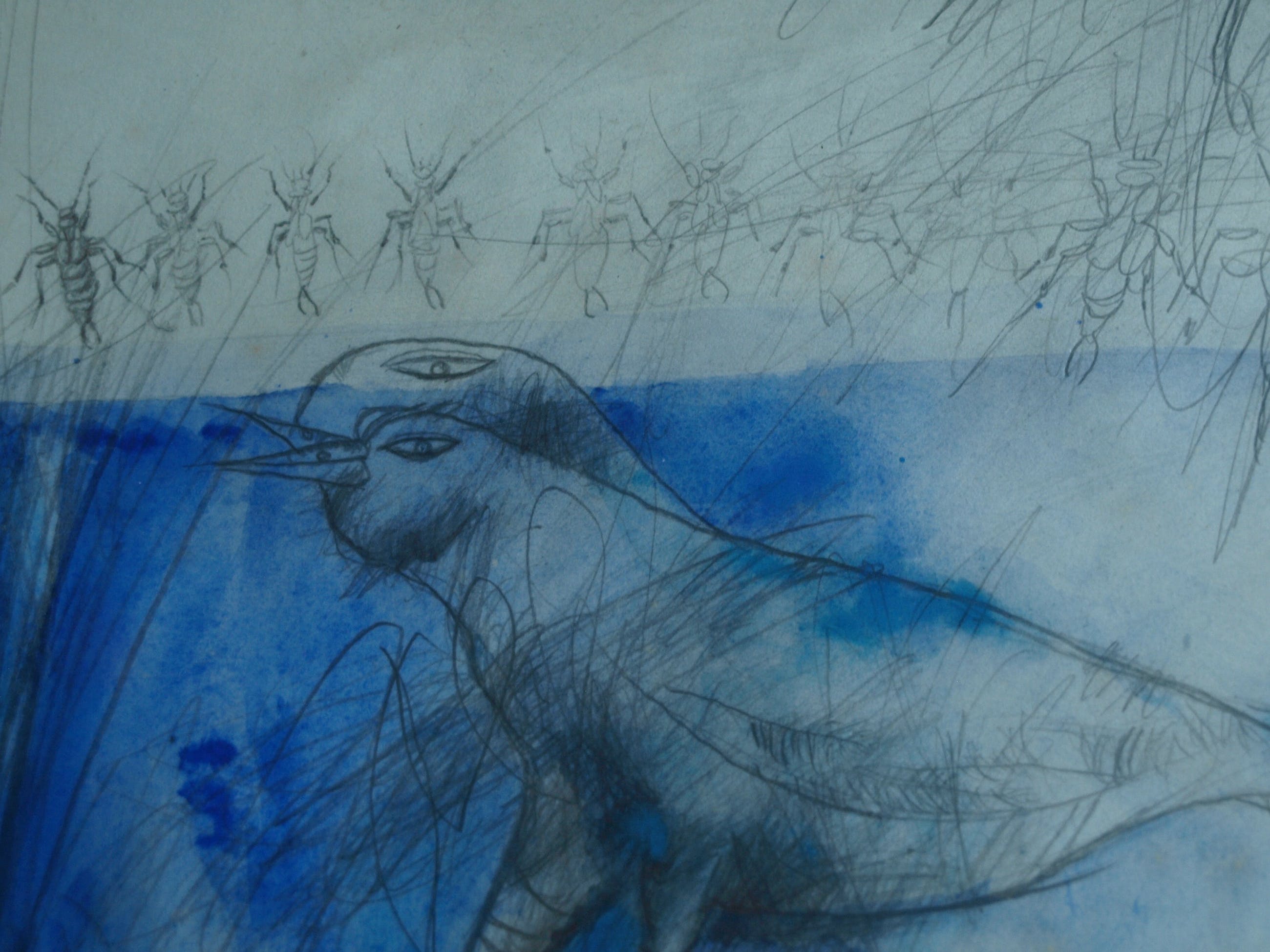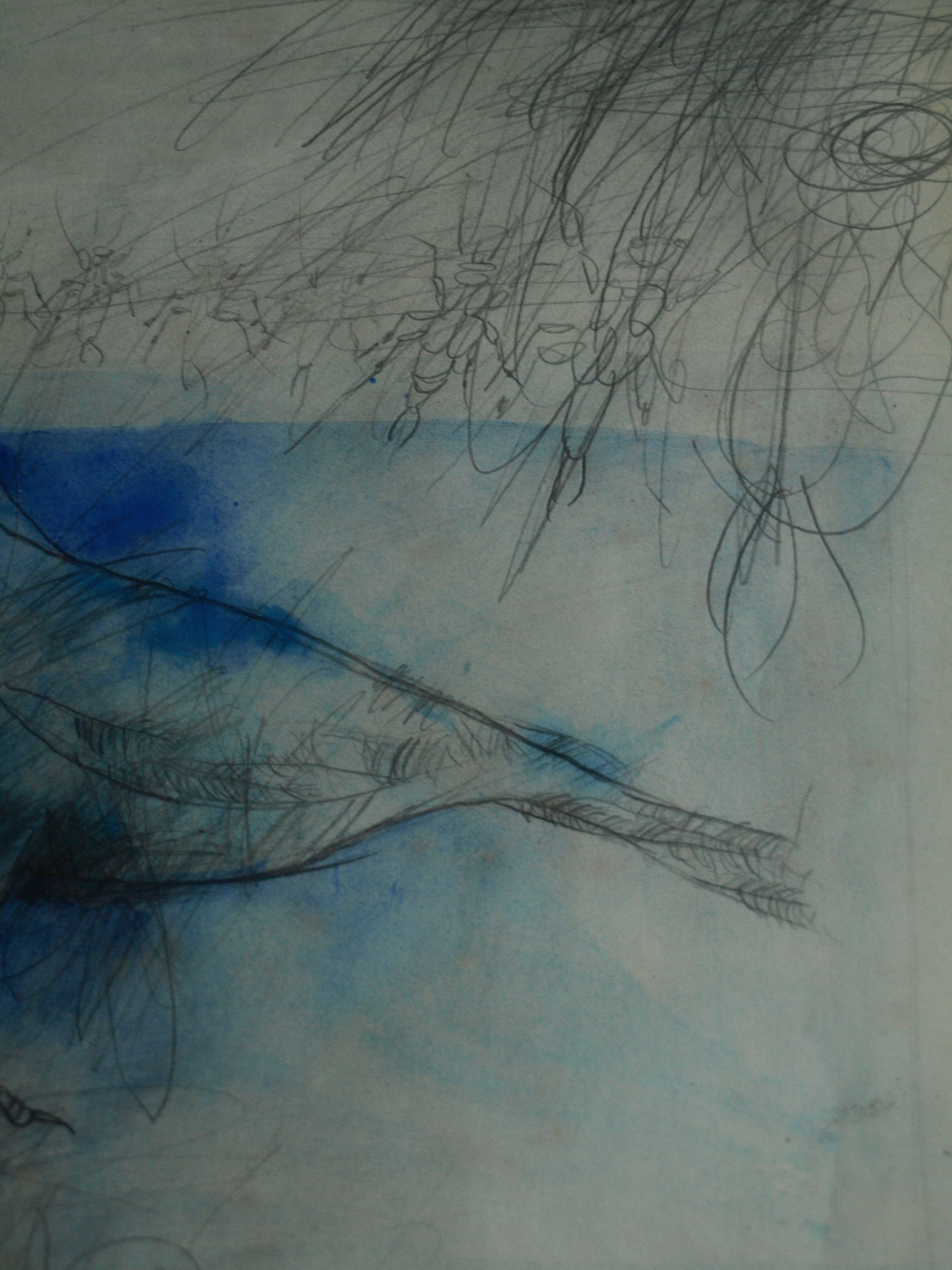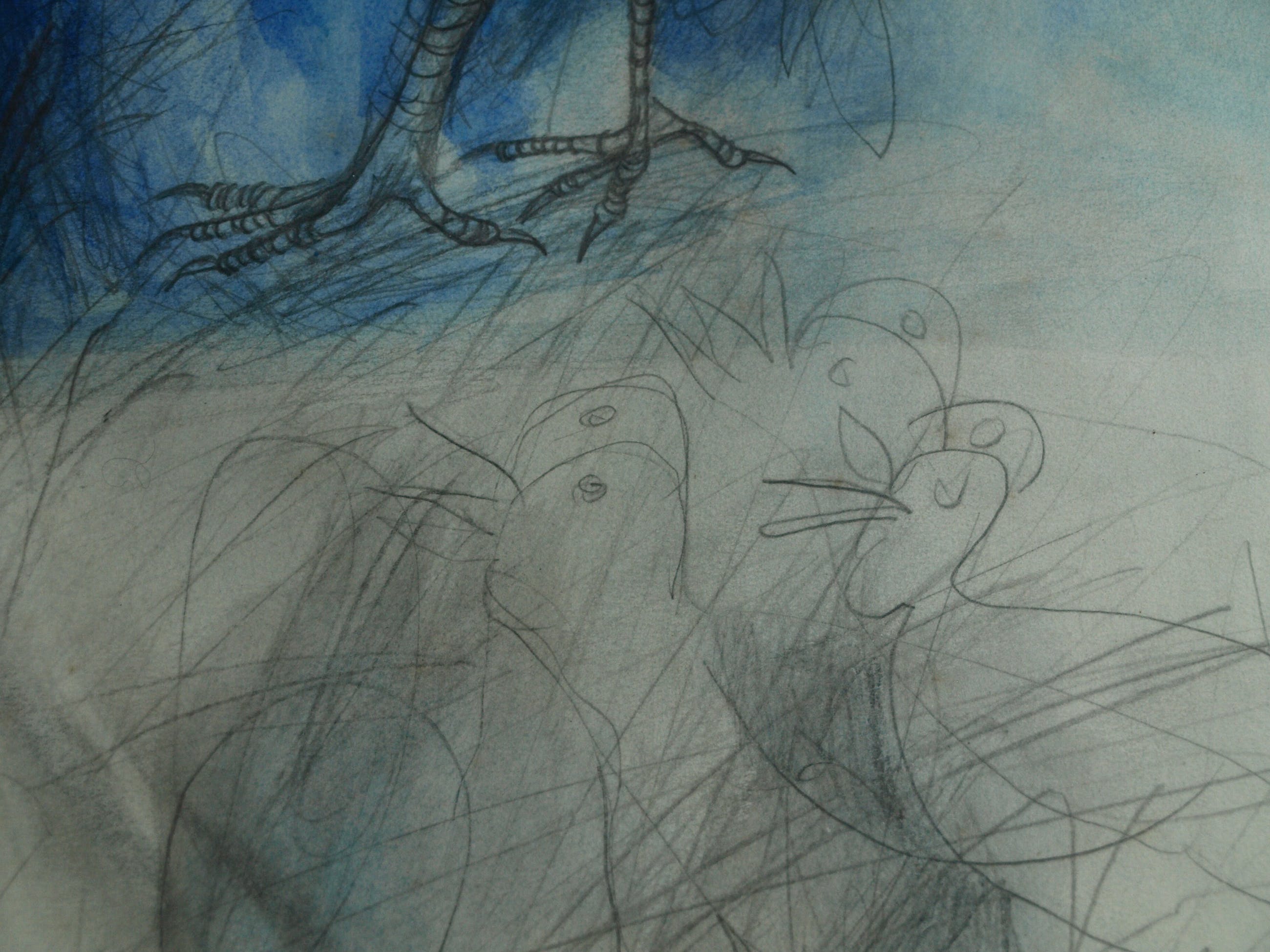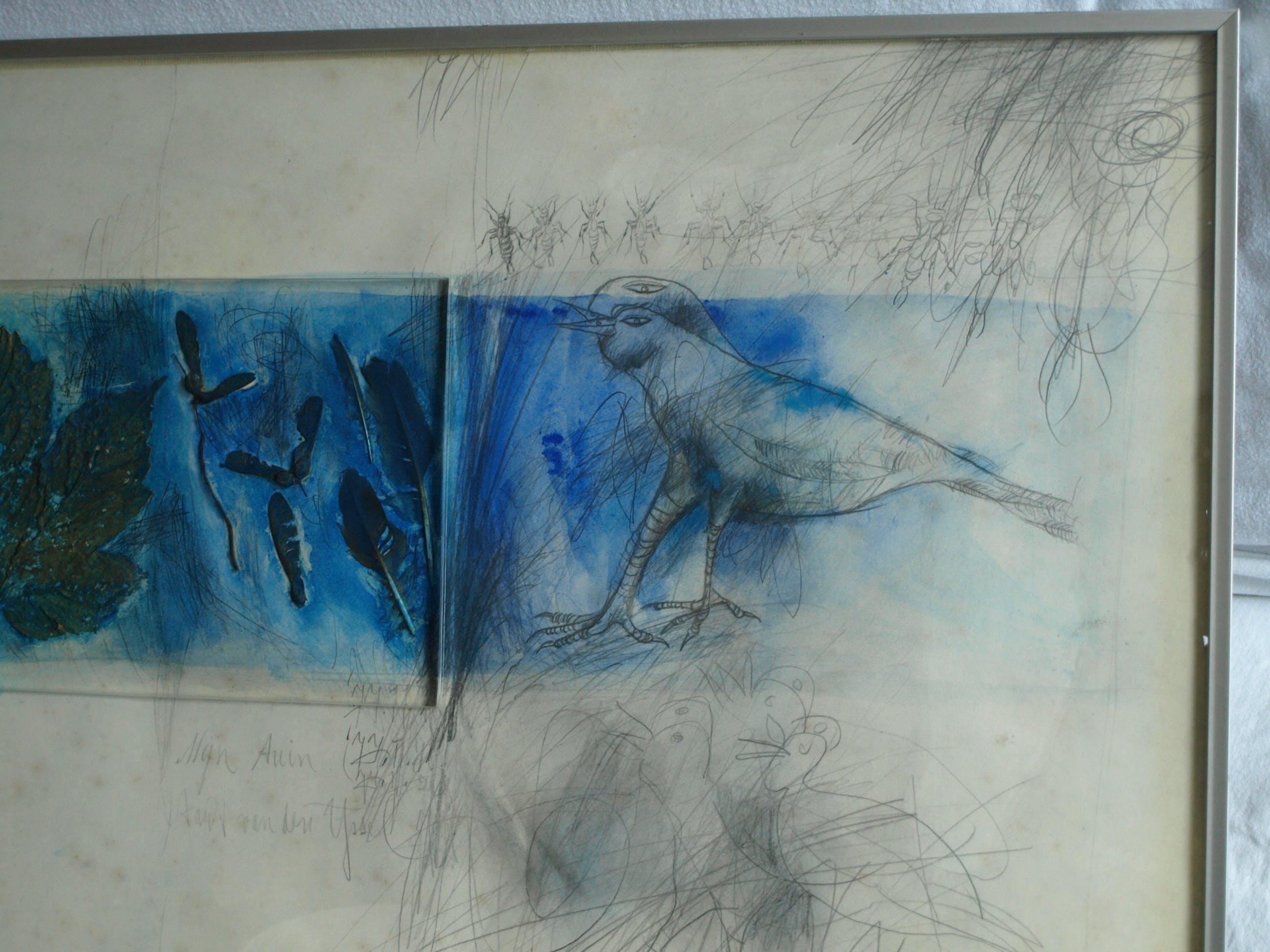 Een bijzondere combinatie van een collage met bladeren, een potloodtekening en acrylverf.