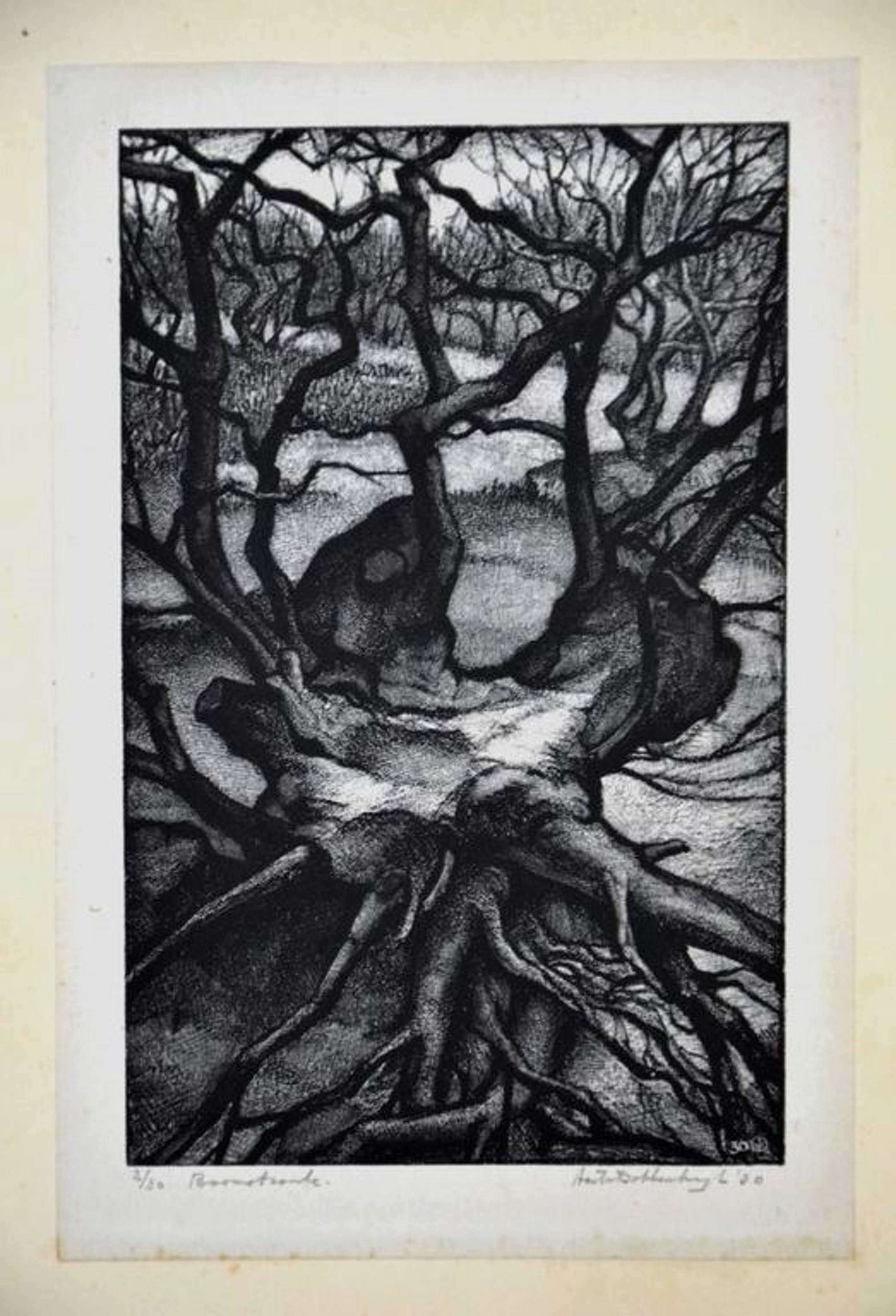2 litho's van Aart van Dobbenburgh: Boomstronk en de geboorte van zoon Arnold.