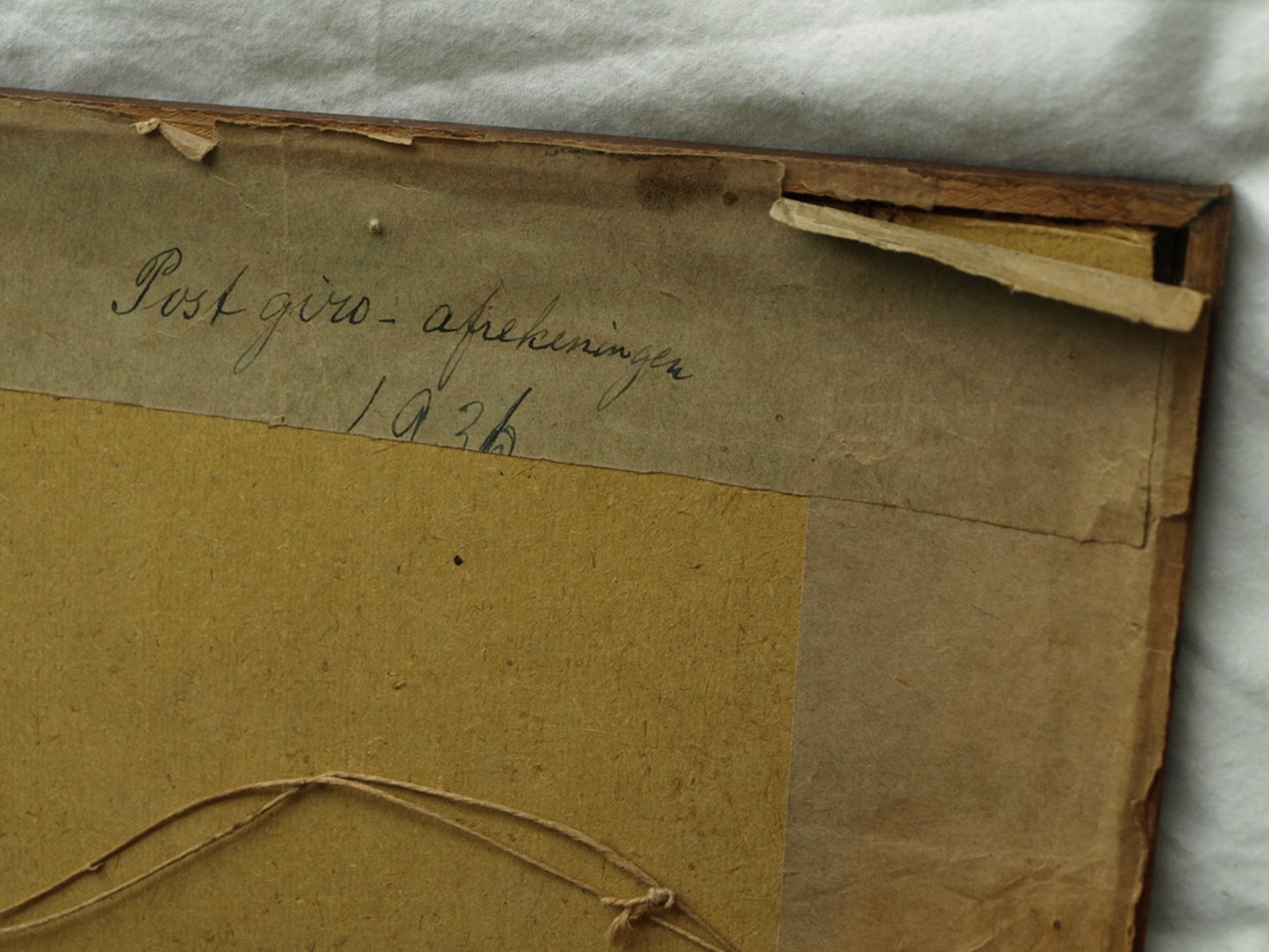Conditie: Het papier van de litho is wat ‘vergeeld’. De lijst heeft slijtplekken en de papieren achterkant is gescheurd aan de randen.