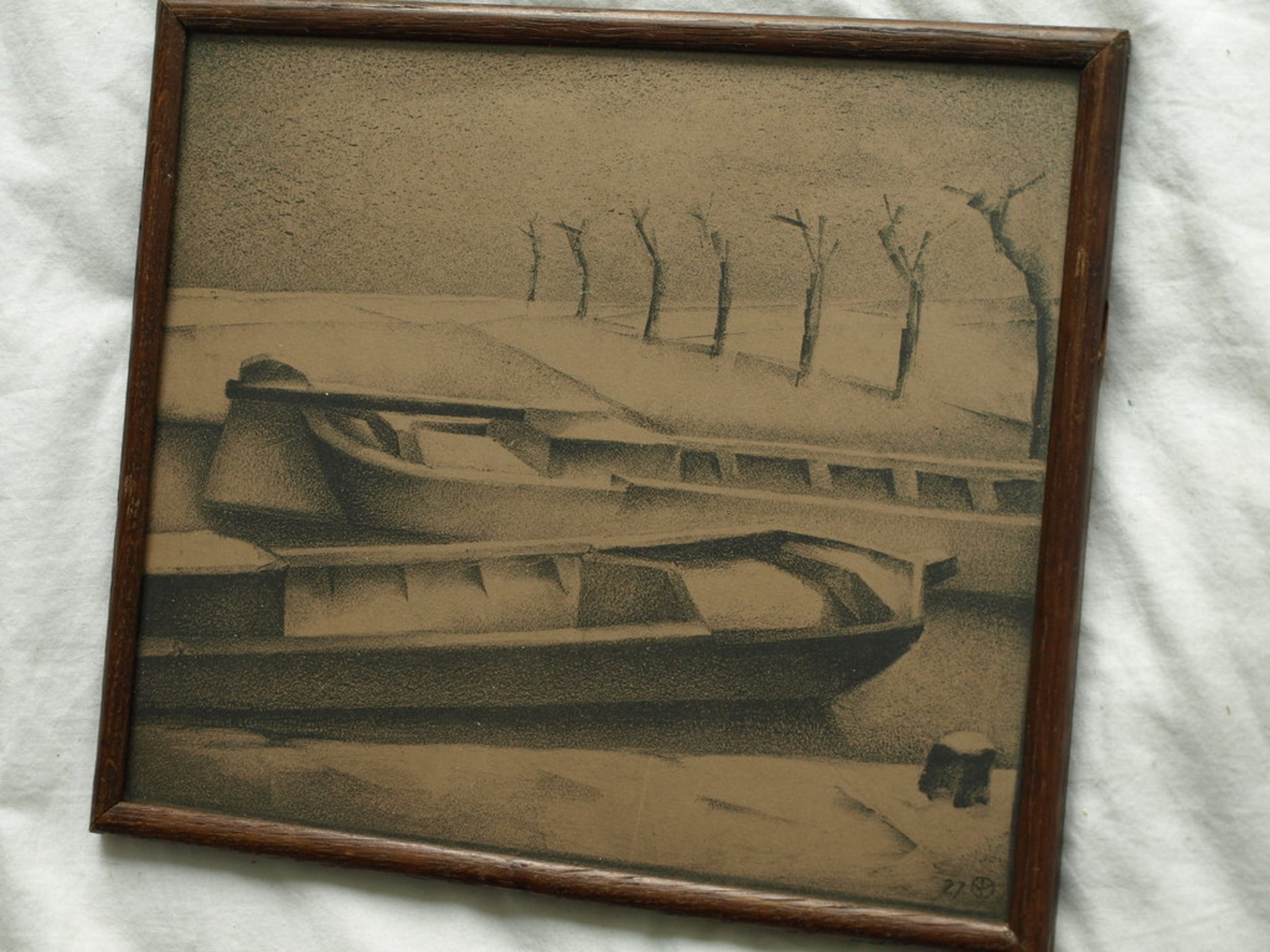 Een bijzondere, ‘vroege’ litho uit 1927 van de Nederlandse kunstenaar Aart van Dobbenburgh met een bijna ‘abstracte’ voorstelling van 2 bootjes in het water.