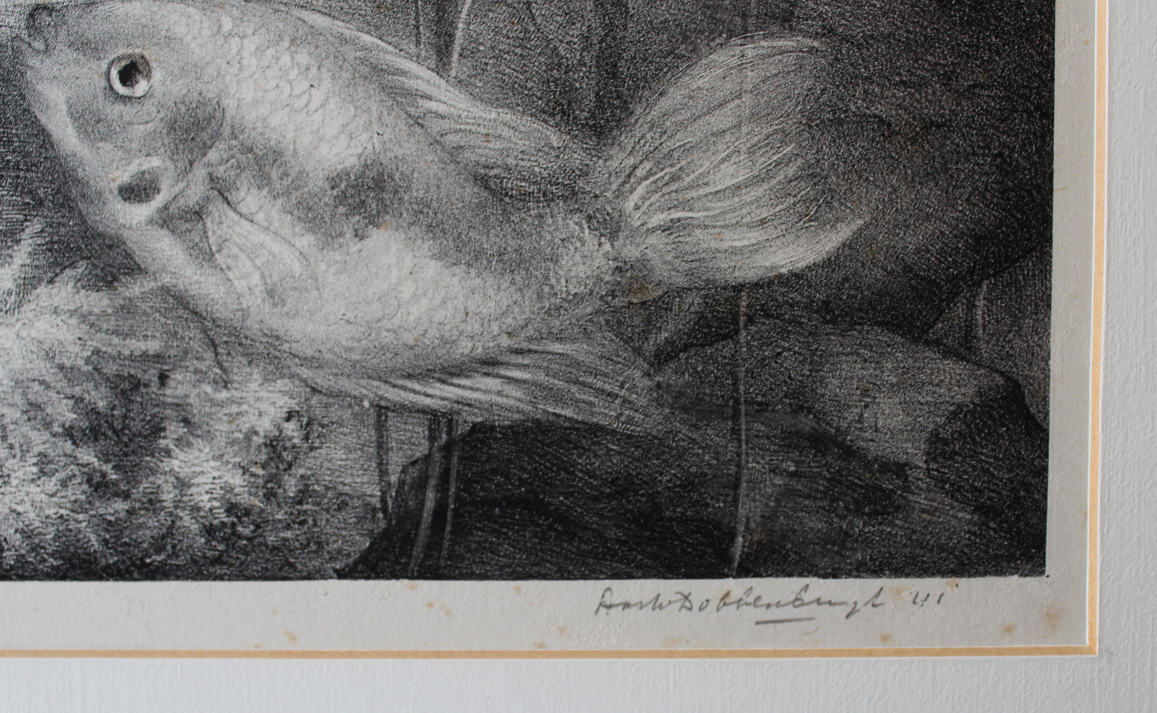Litho uit 1941. Mooie litho met vissen in een aquarium. Zeer sfeervol. Kleine ouderdomssporen.