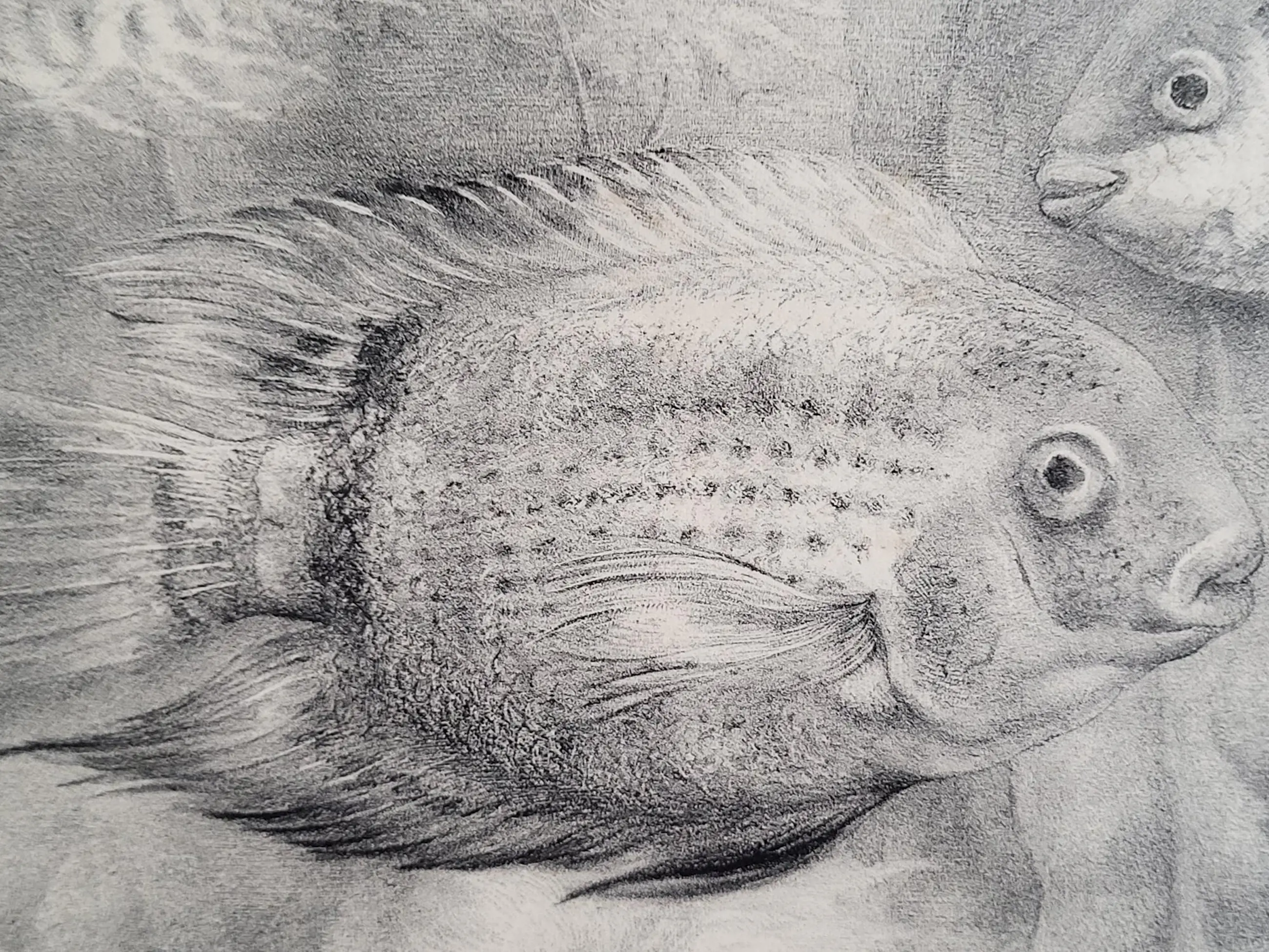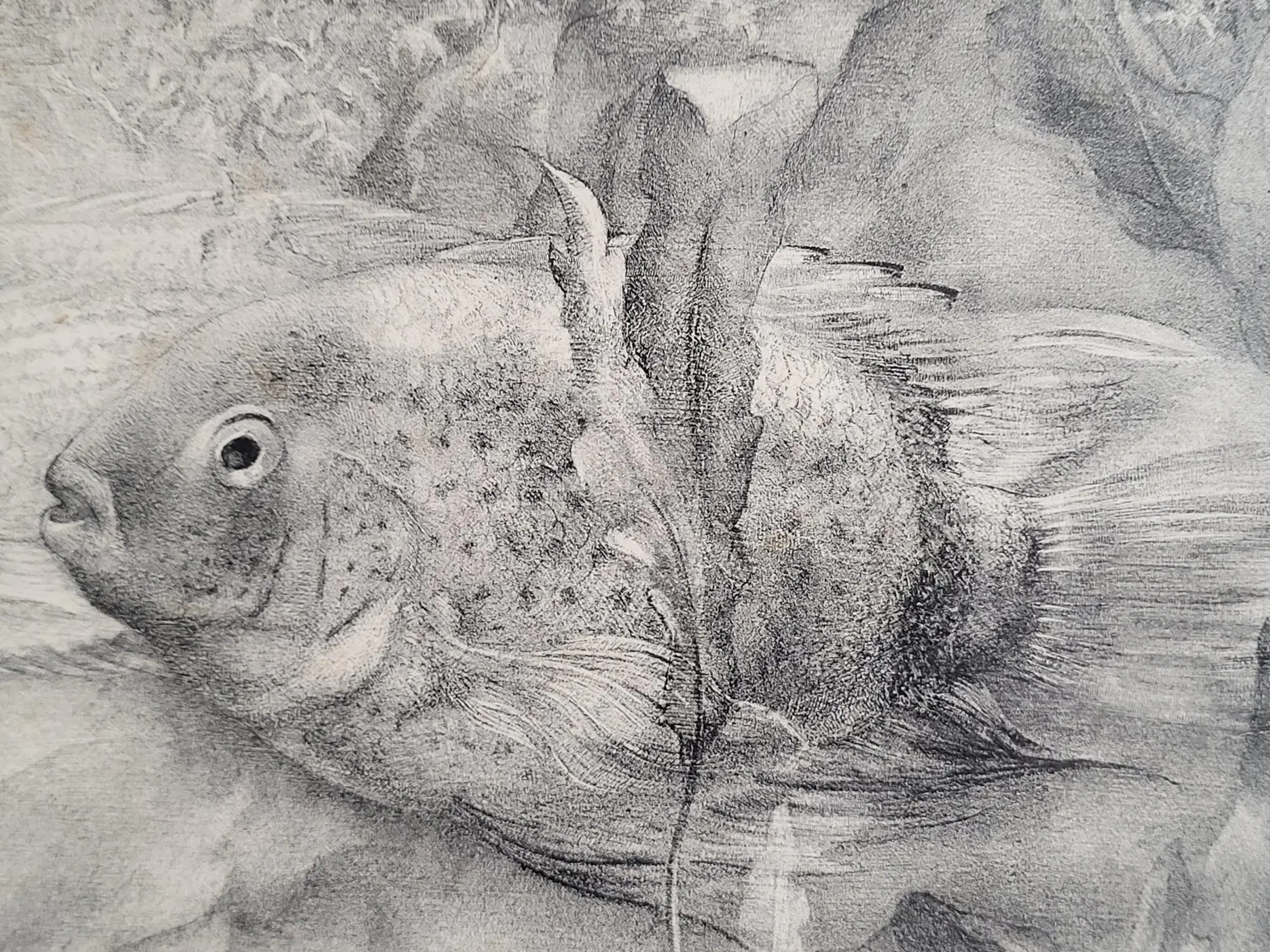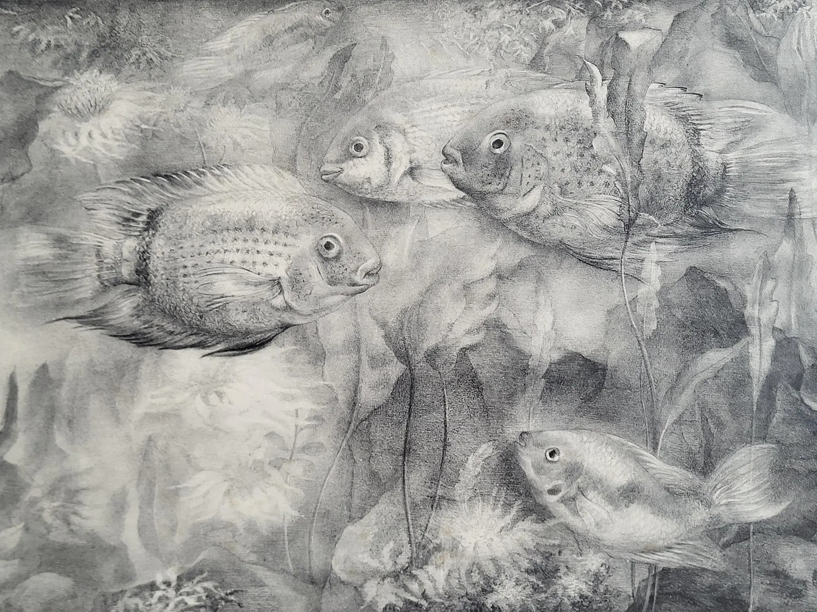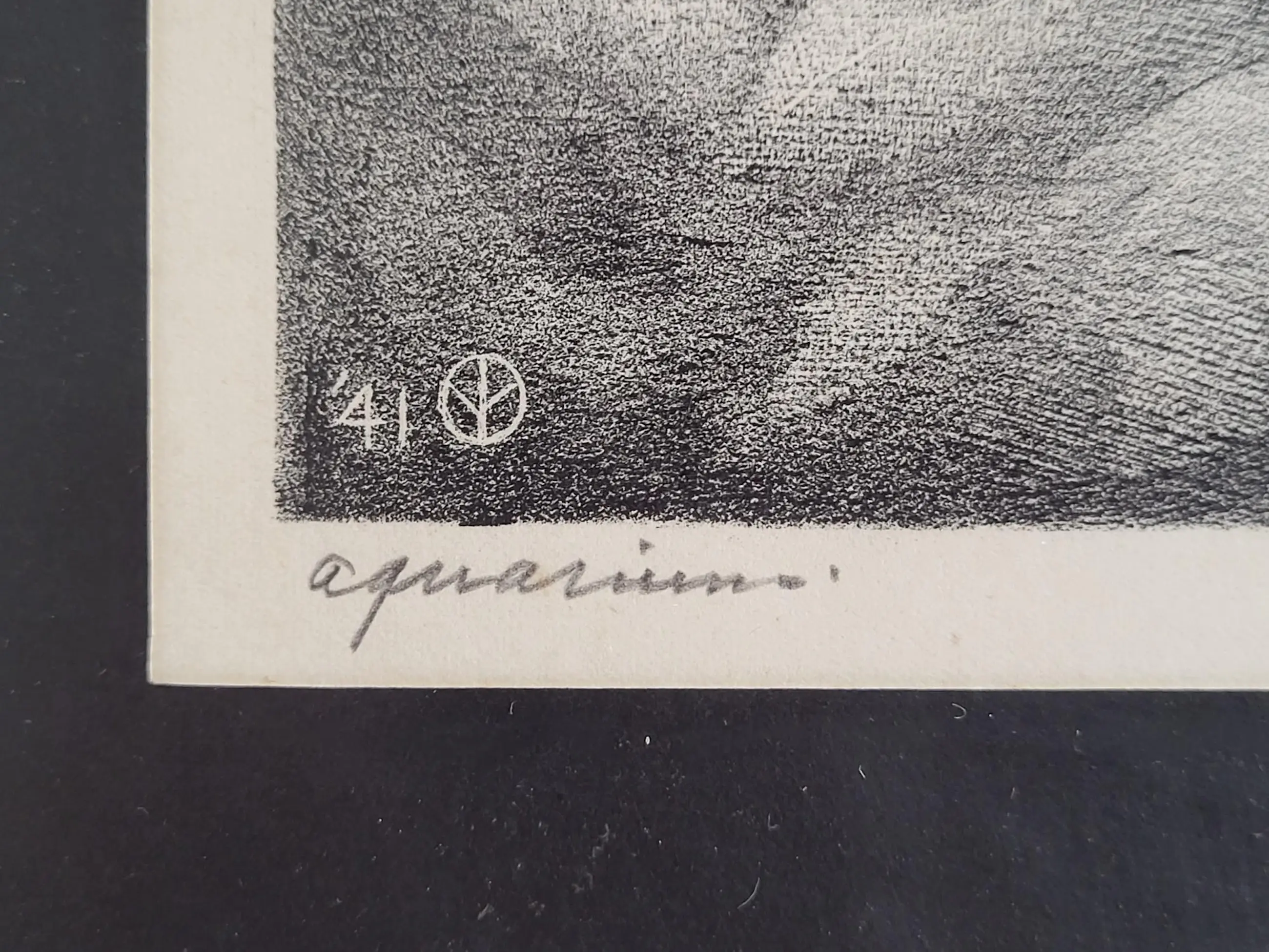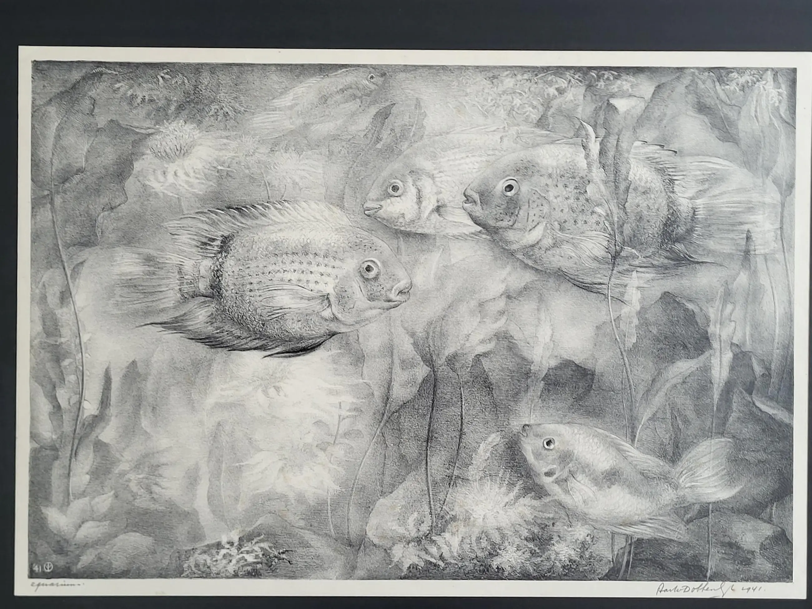 Werk is fraai ingelijst achter ontspiegeld glas.
