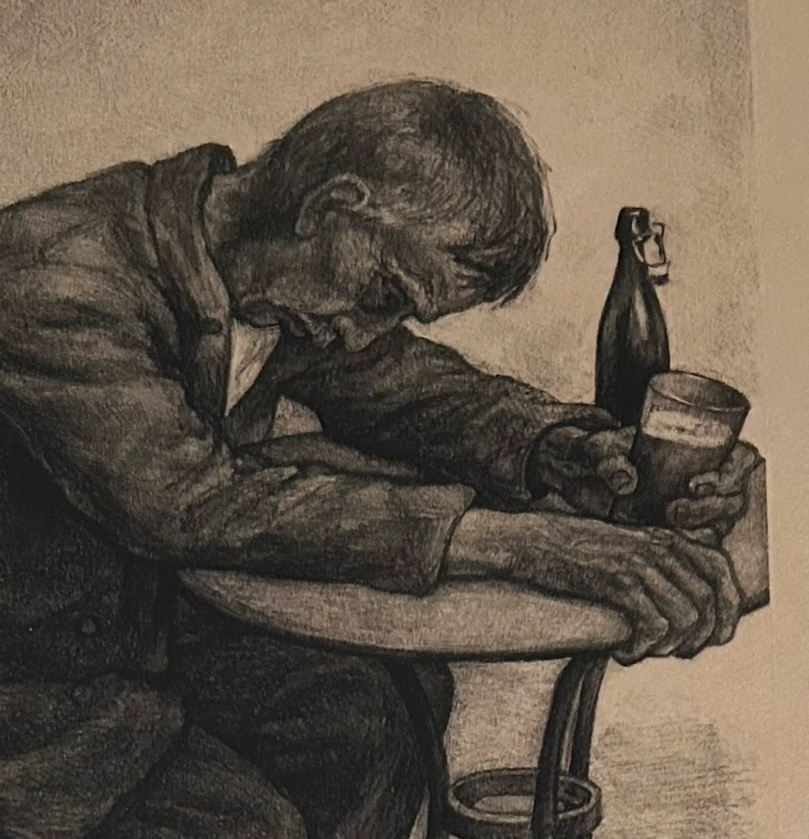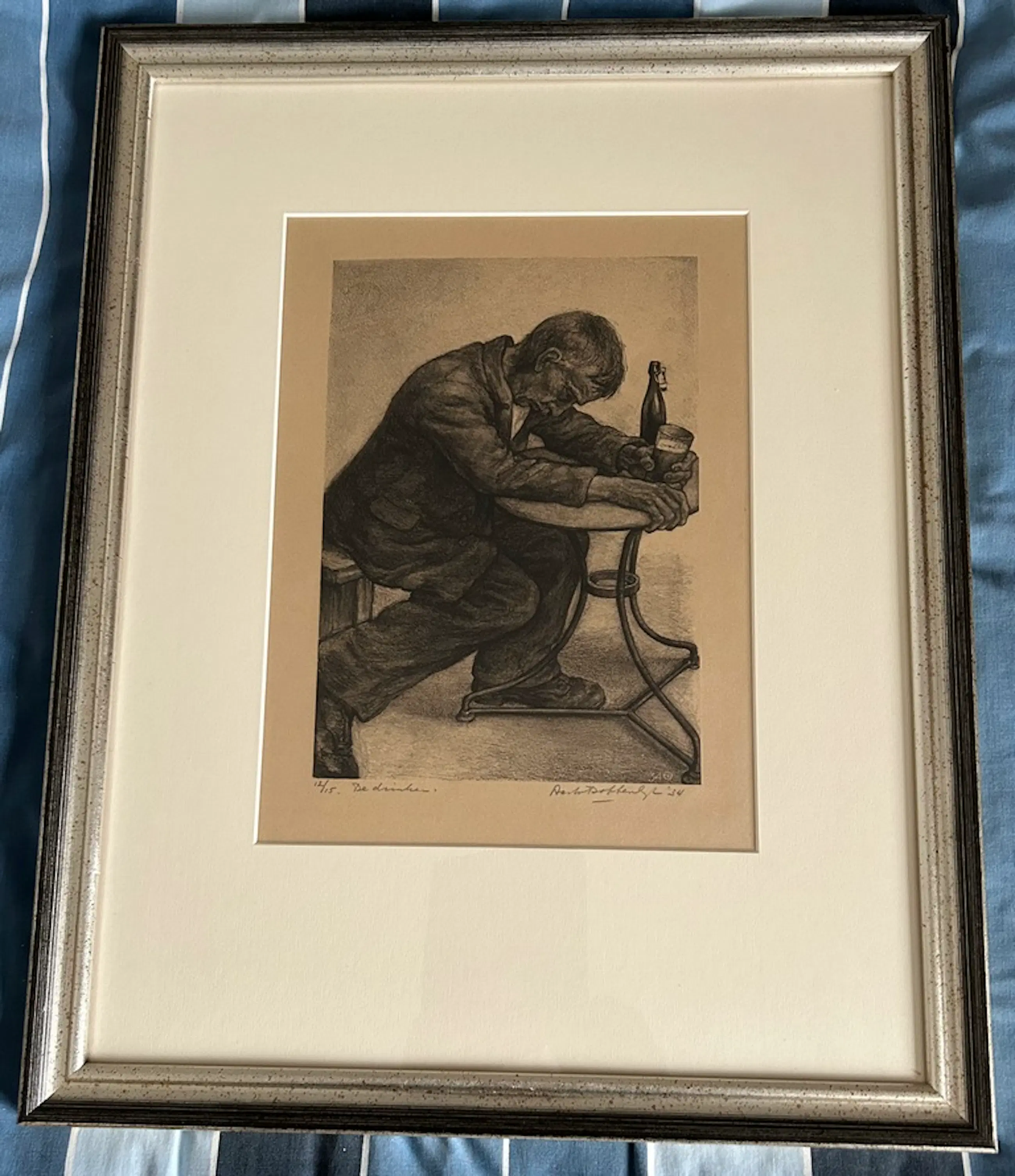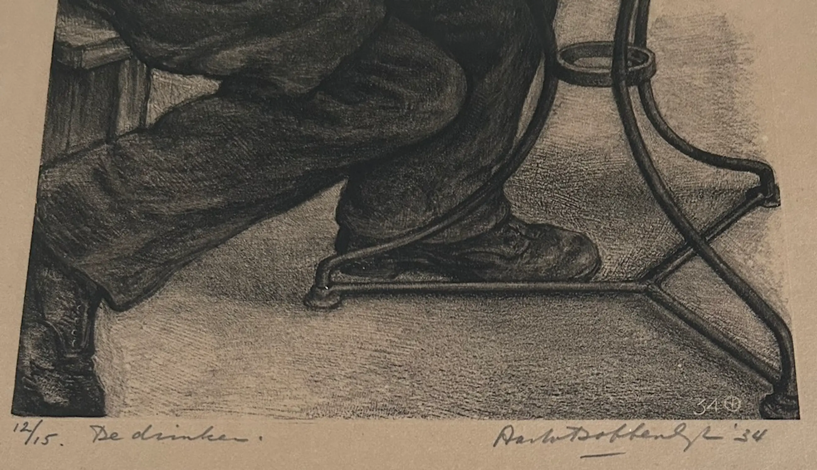 Litho van Aart van Dobbenburgh. Titel: De drinker. Oplage: 12/15. Het werk is onderaan met potlood gesigneerd en genummerd door de kunstenaar. De oplage is klein: slechts 15 stuks! Het werk is in 1935 door de kunstenaar uitgewerkt tot een grote poster tegen alcoholverslaving.