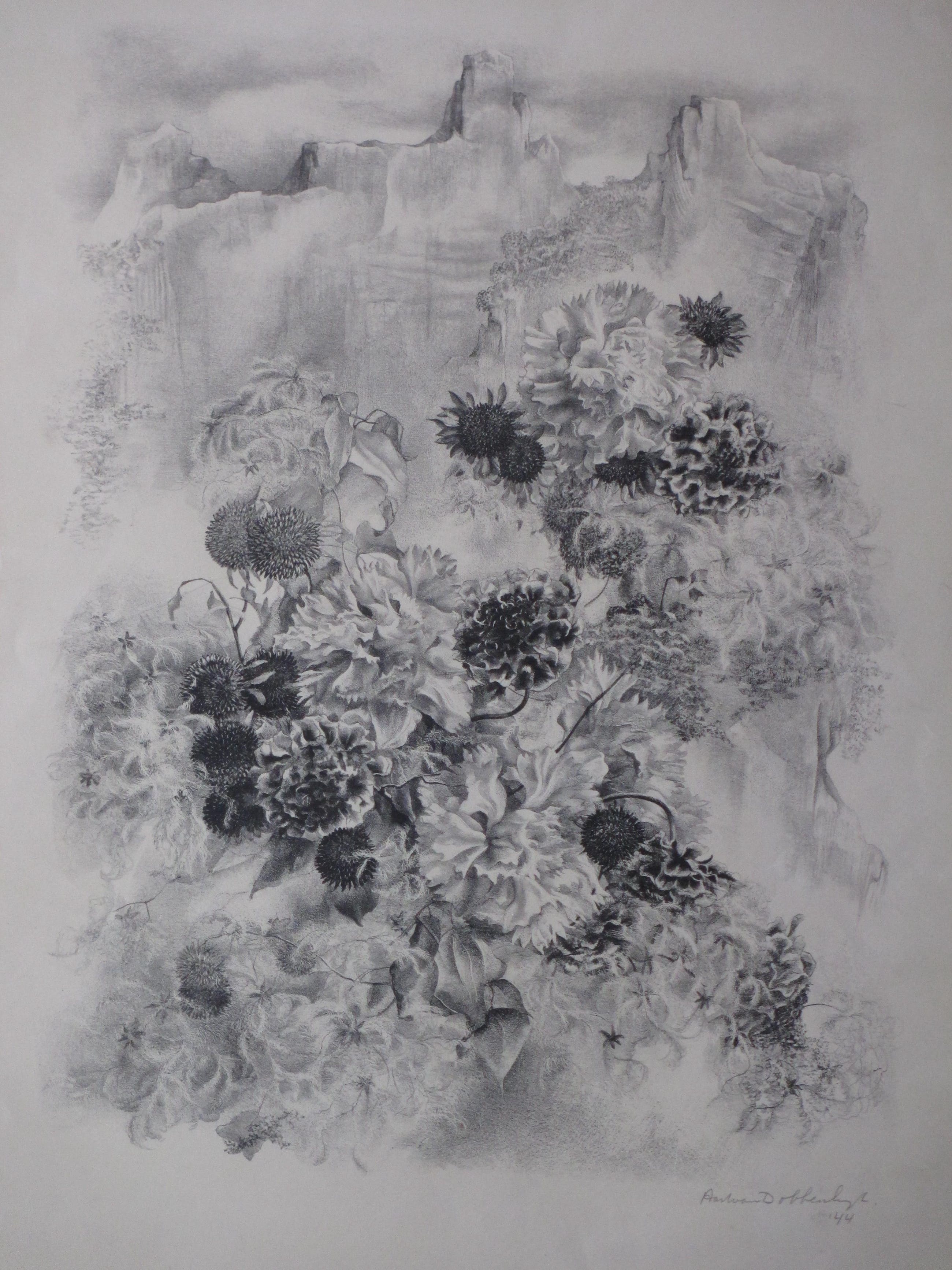 Litho door Aart van DobbenburghVoorstelling van distels in een bergachtig landschapLosbladig, beeldmaat 42x31, bladmaat 64x48Gesigneerd en gedateerd in potlood r.o. ' Aart van Dobbenburgh ' 44' Authenticiteit volledig gegarandeerd