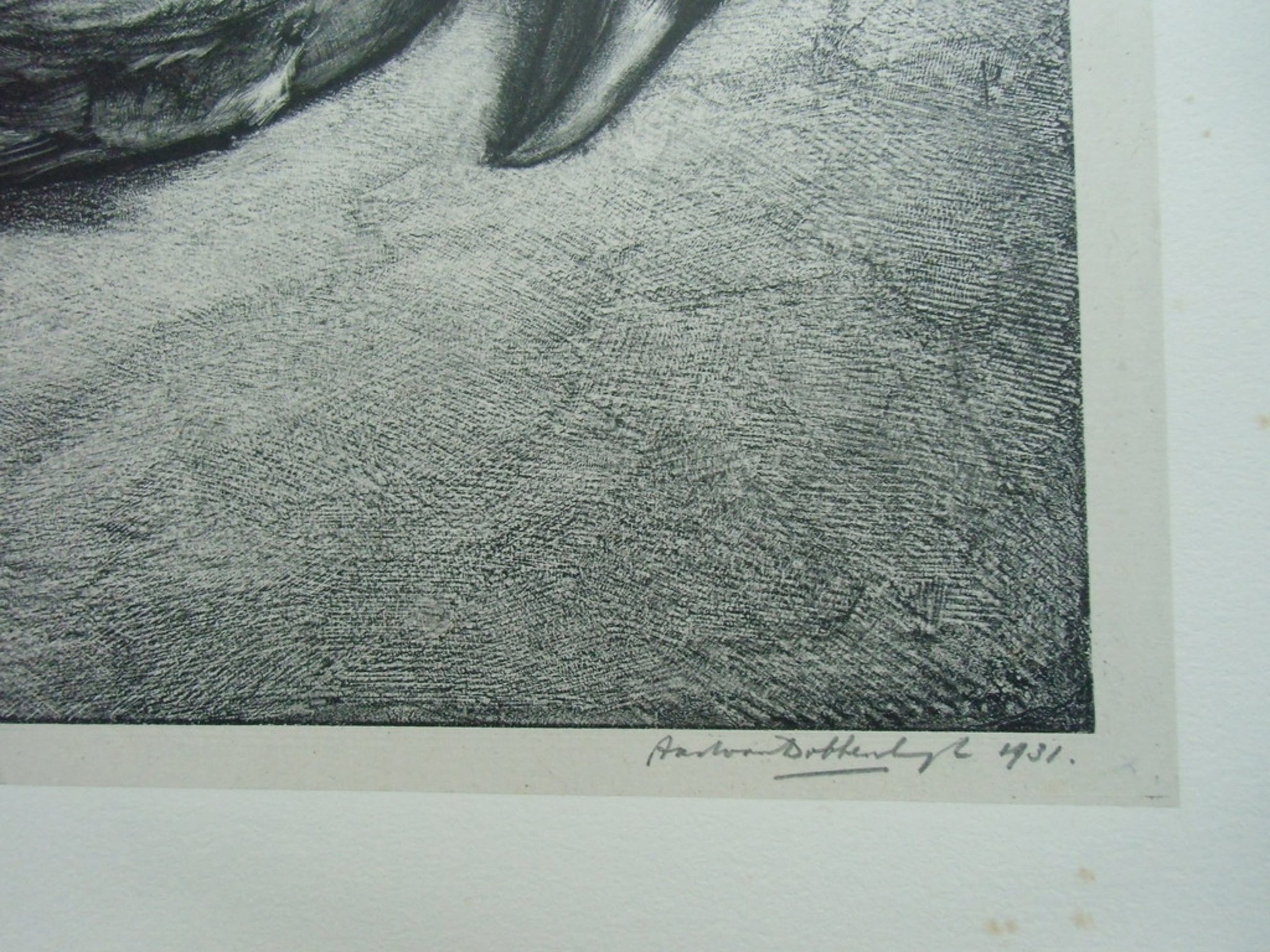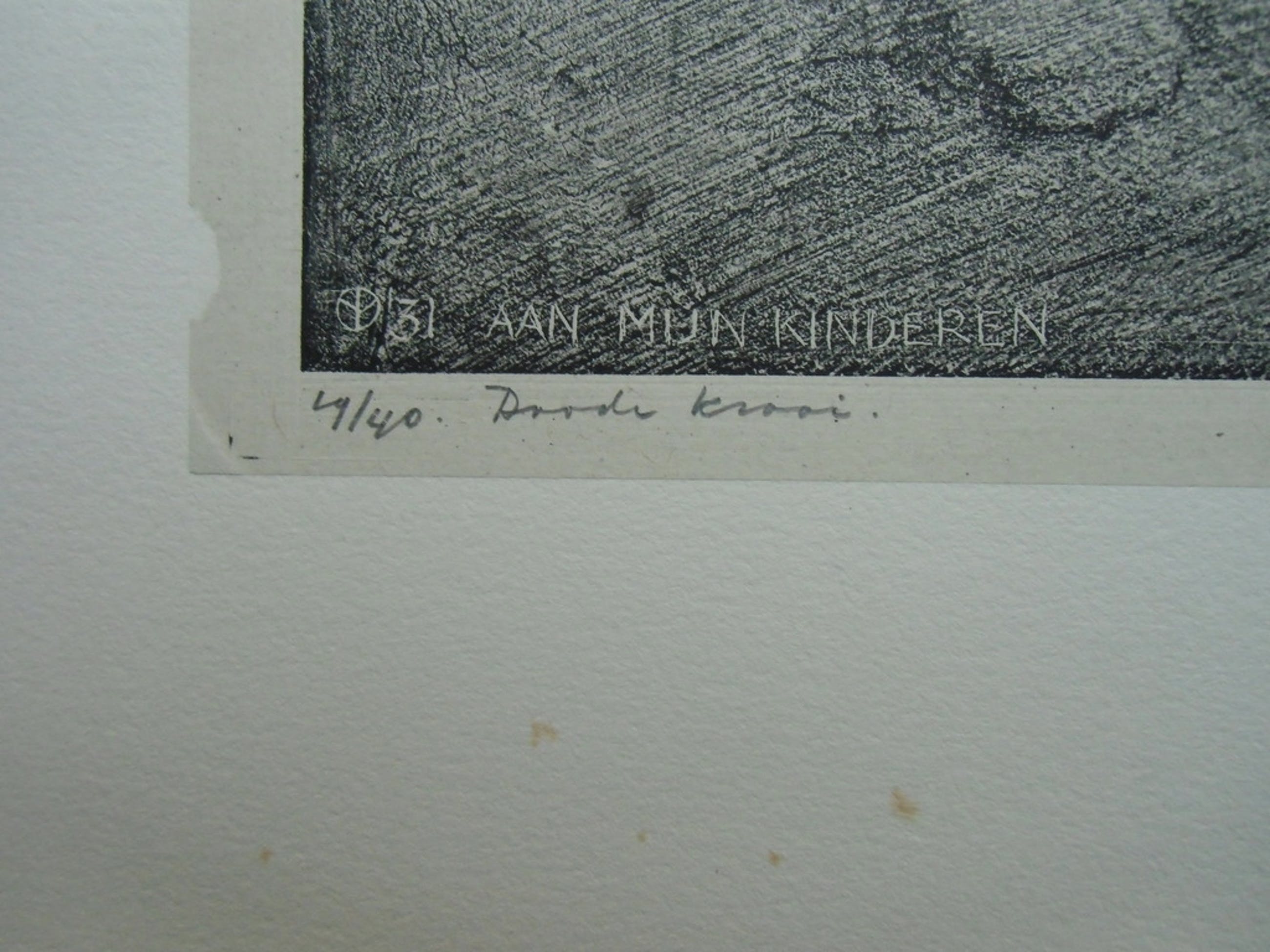 Deze litho met een oplage van 29/40 heeft van Dobbenburgh opgedragen aan zijn kinderen. Het werk is van erg goede kwaliteit en heeft een beeldformaat van 29 x 44.5 cm. Gesigneerd en betiteld met potlood. Op de steen zijn monogram en "aan mijn kinderen ". Zoals gebruikelijk lichte foxing in de marges, maar buiten het beeldvlak. Losbladig.