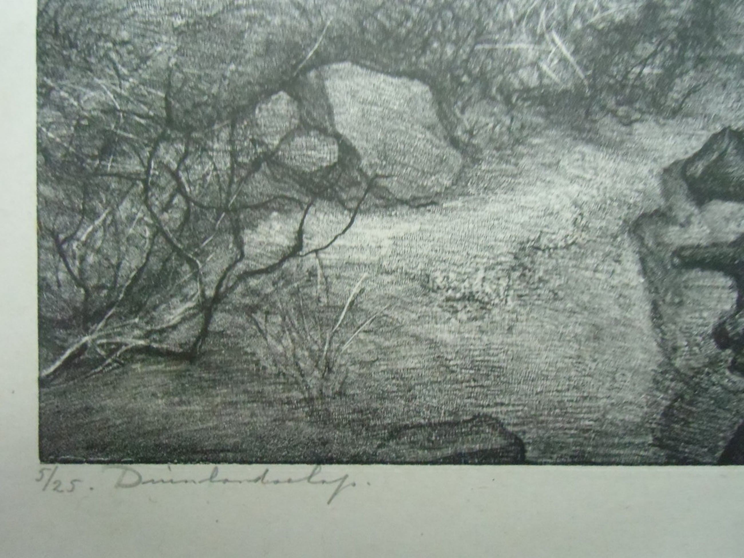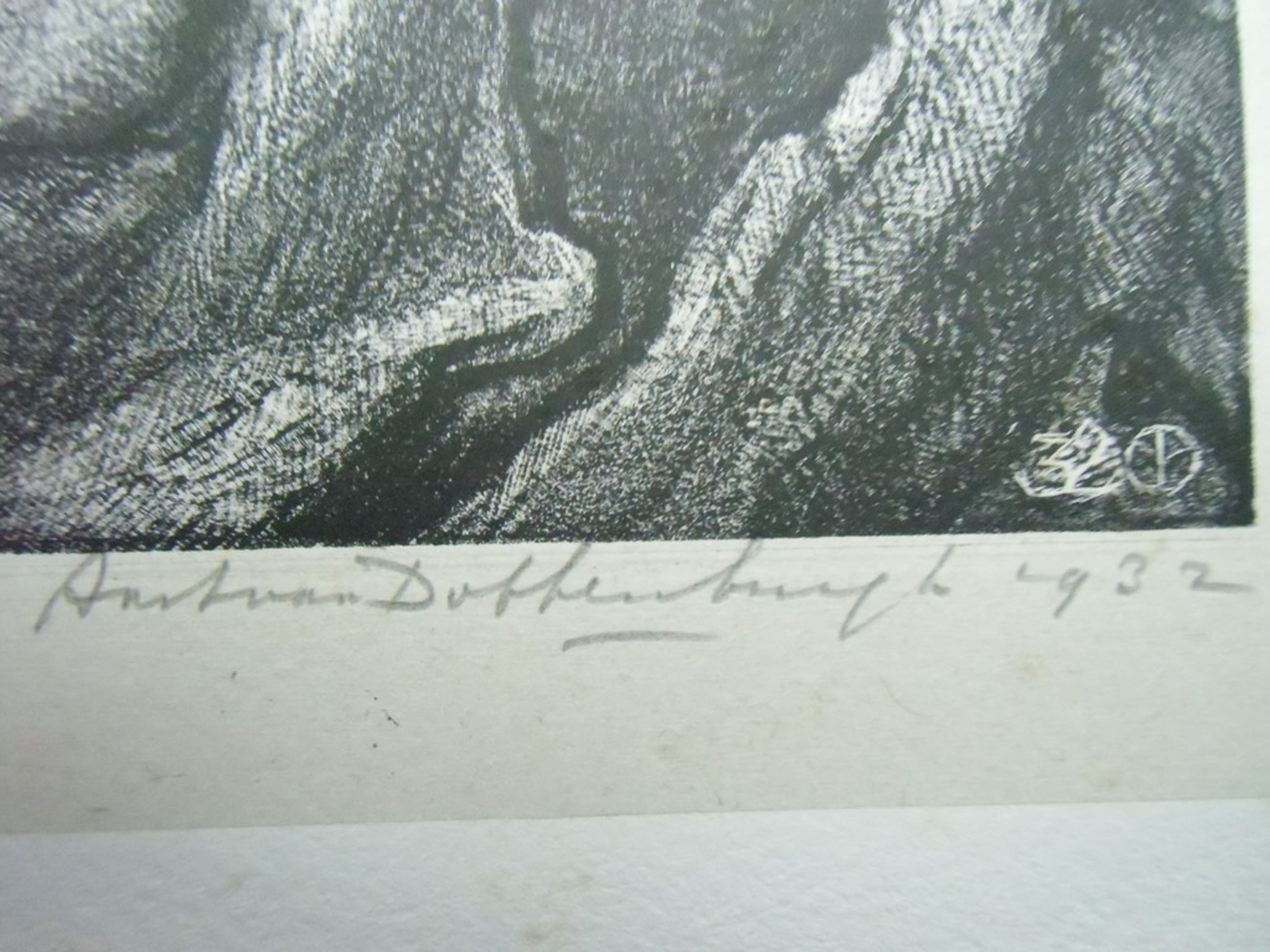 Dit mooie blad van de eminente graficus Aart van Dobbenburgh dateert uit 1932. Het werk is gesigneerd, betiteld en gedateerd met potlood. Oplage 5/25. Beeldmaat 49 x 57 cm. Ruime marges met zeer lichte foxing (niet in het beeldvlak). Linksboven in de marge een klein gerepareerd scheurtje (ca. 1 cm).Losbladig.