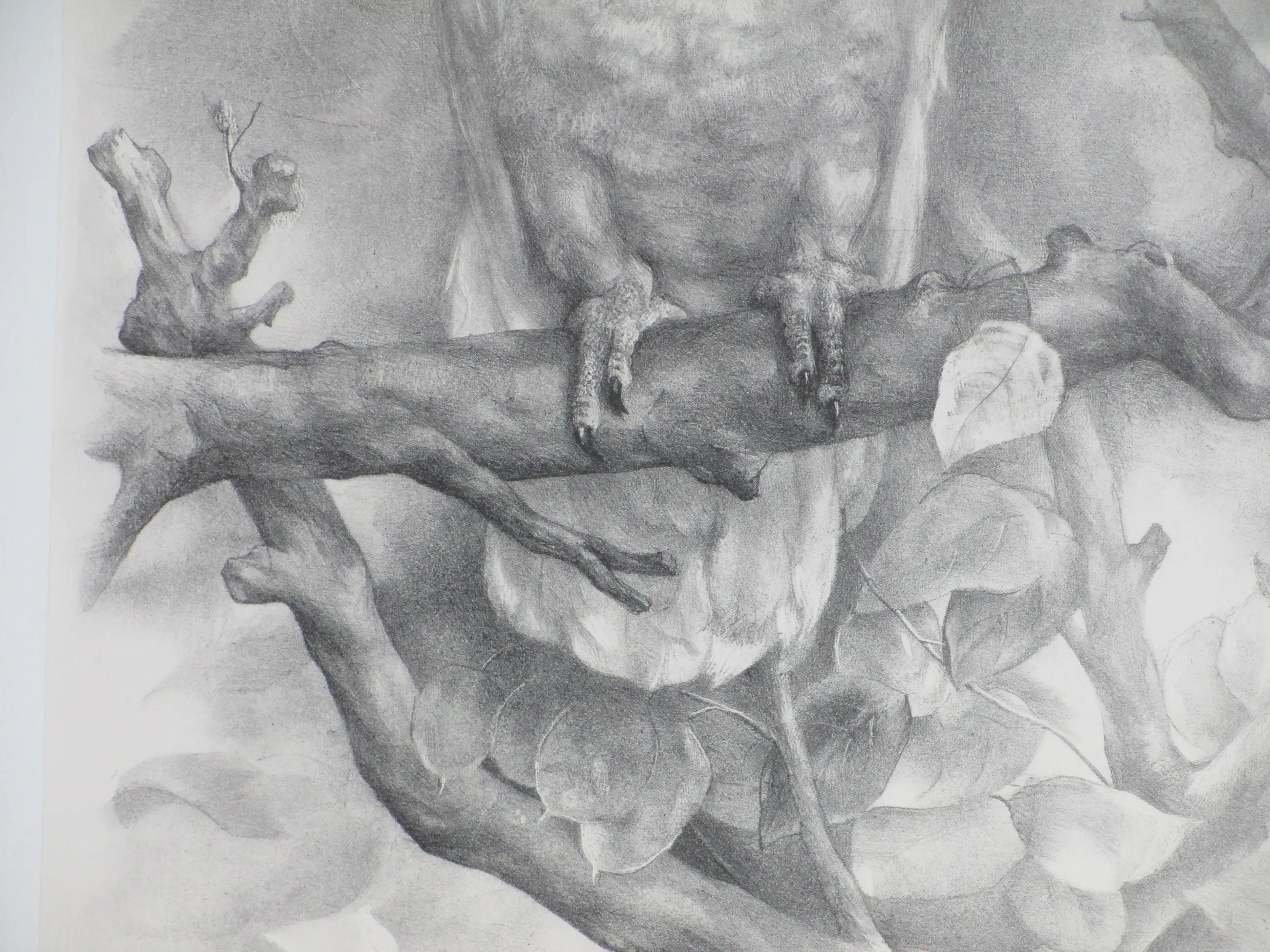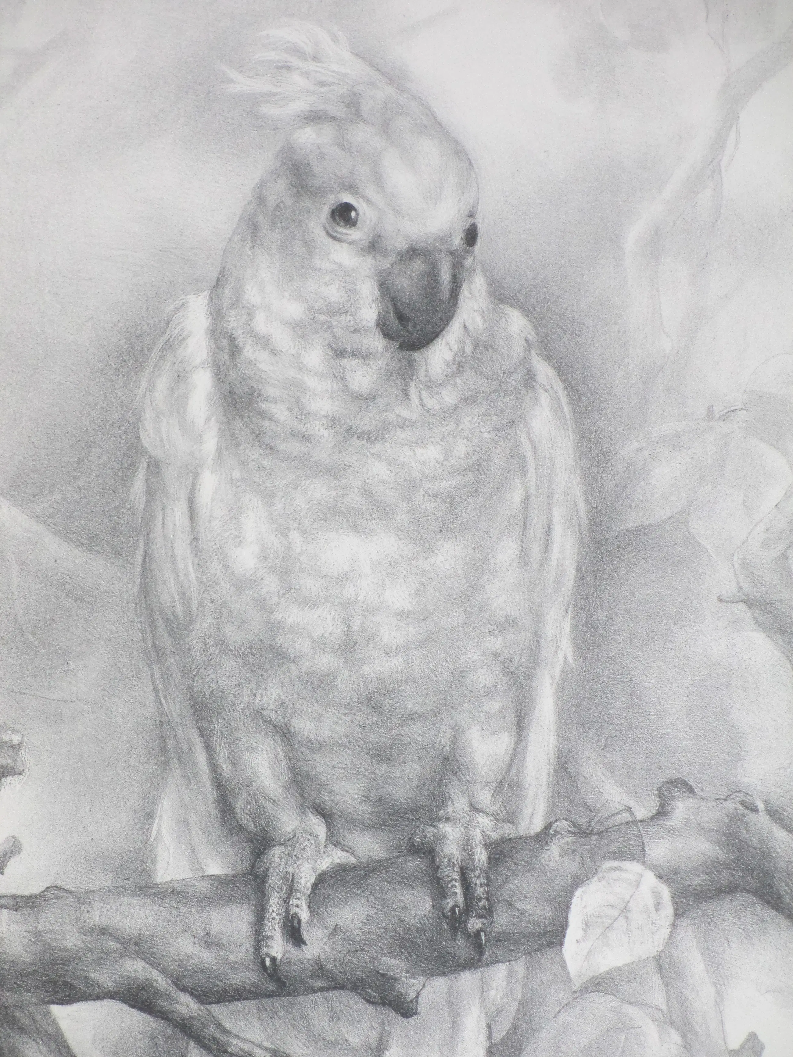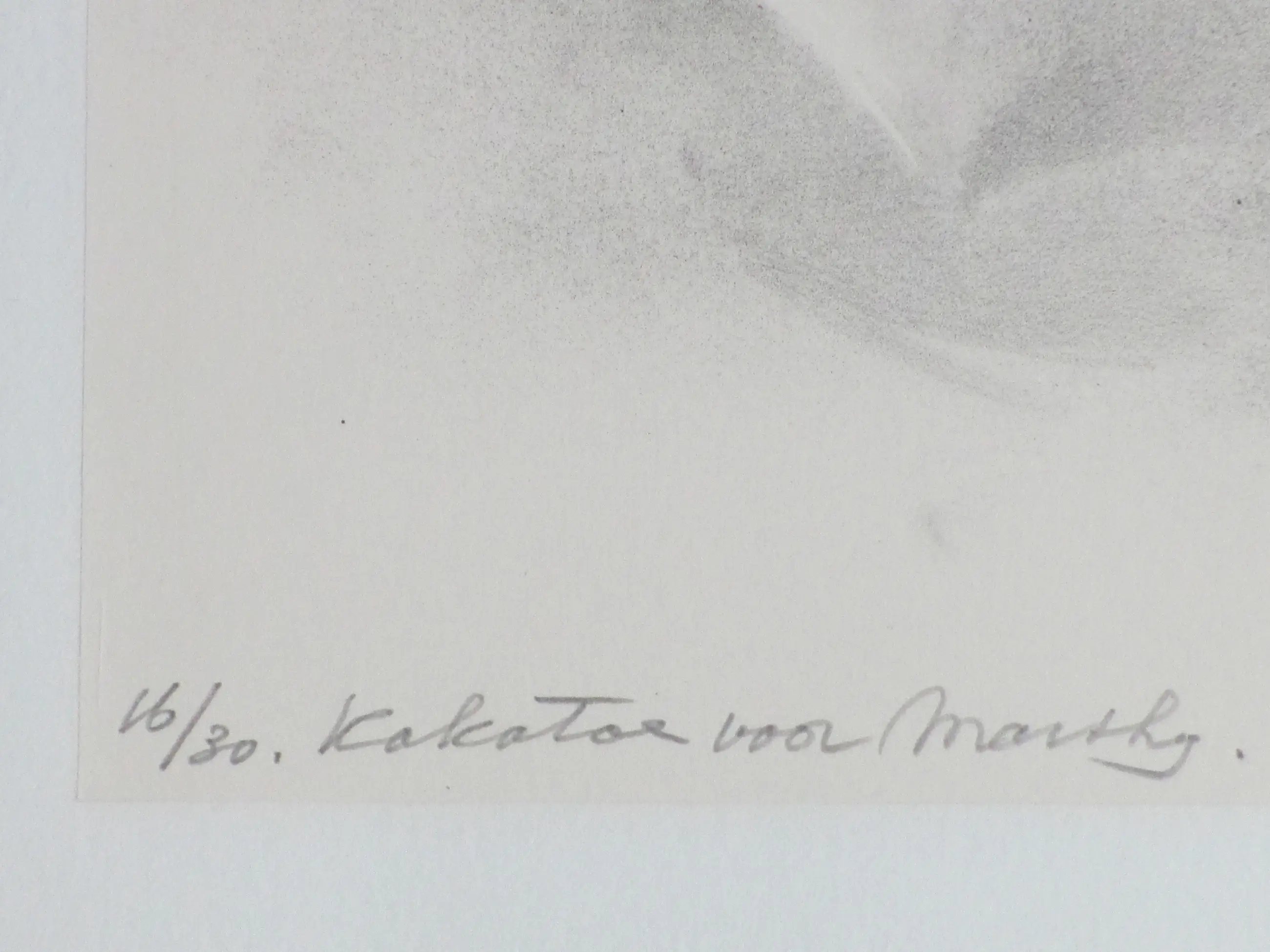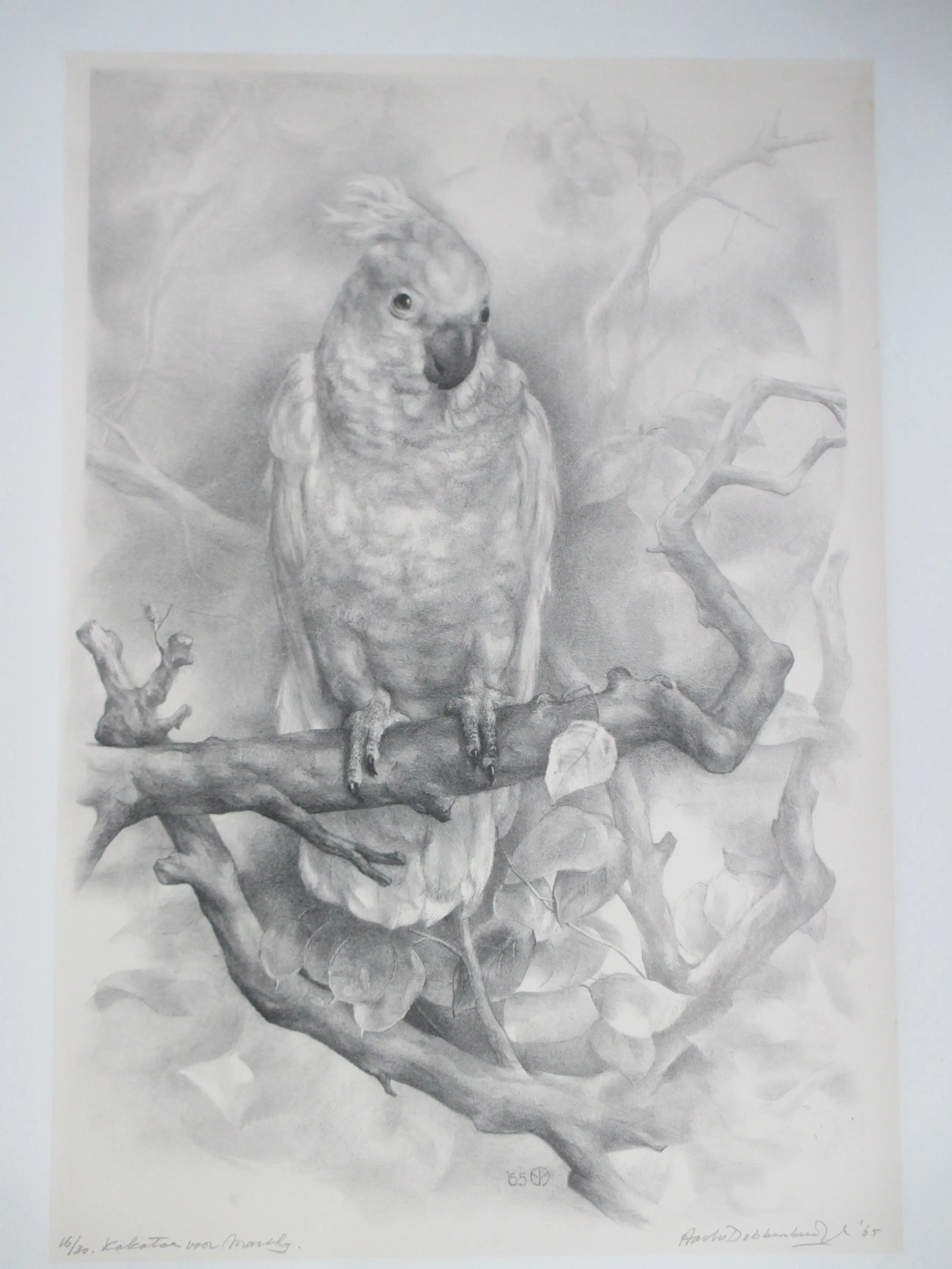 Litho door Aart van Dobbenburgh Voorstelling van een kaketoe op een tak Litho op Chine Collé Gesigneerd en gedateerd in potlood r.o.: 'Aart vDobbenburgh '65' Tevens gemoznogrammeerd en gedateerd in de druk m.o. Genummerd en annotatie in potlood l.o.: '16/30 Kakatoe voor Marthy'