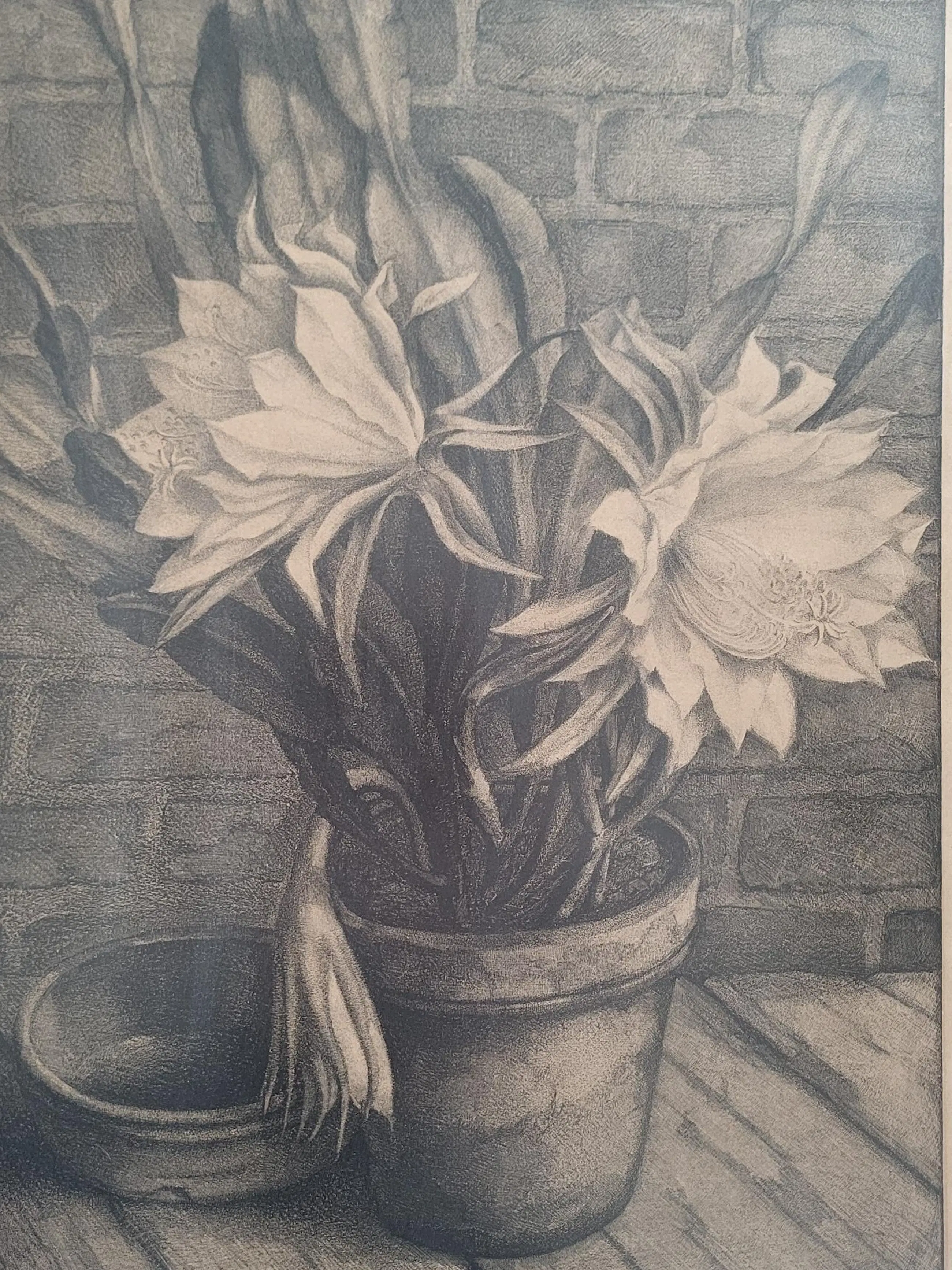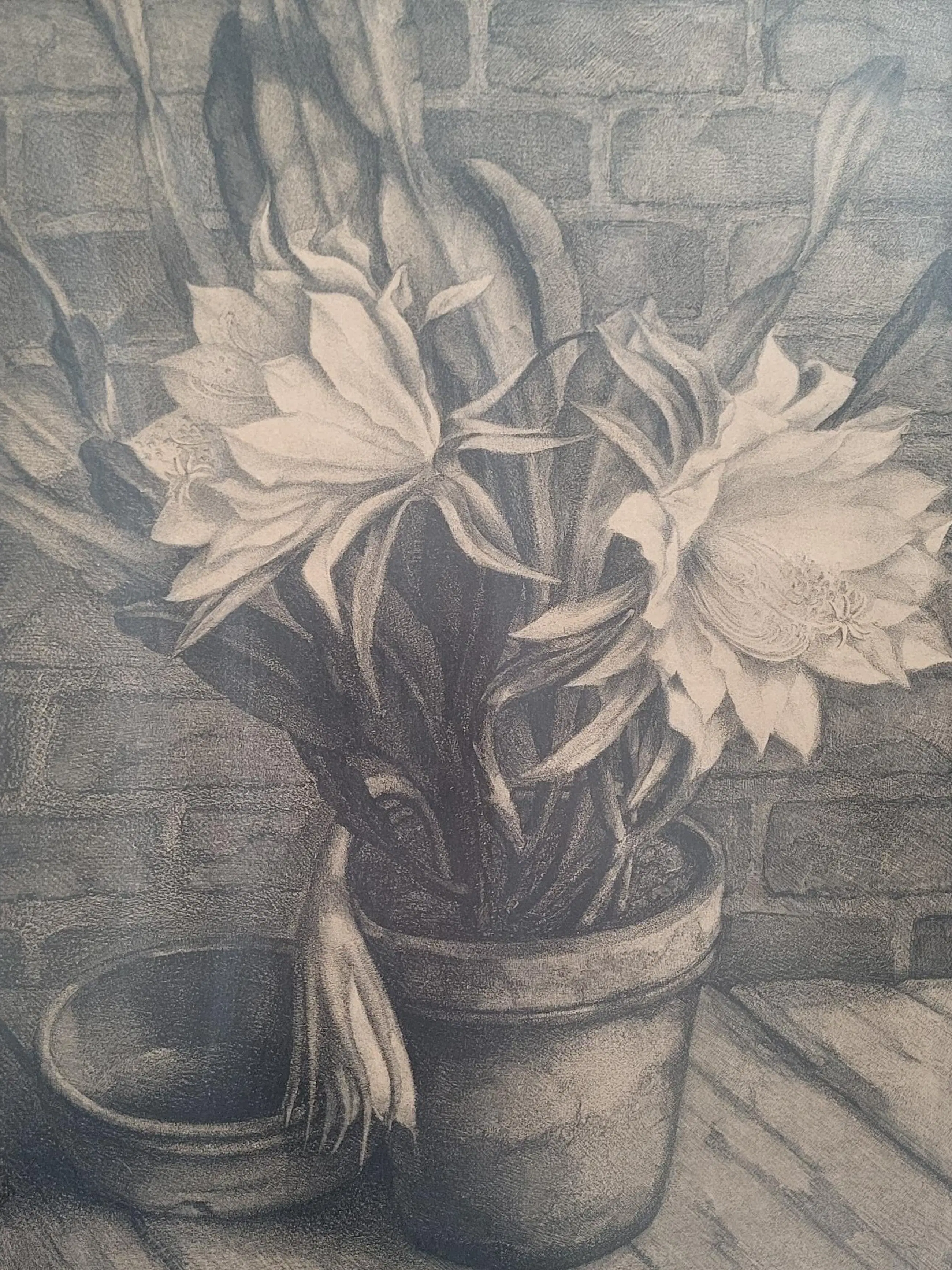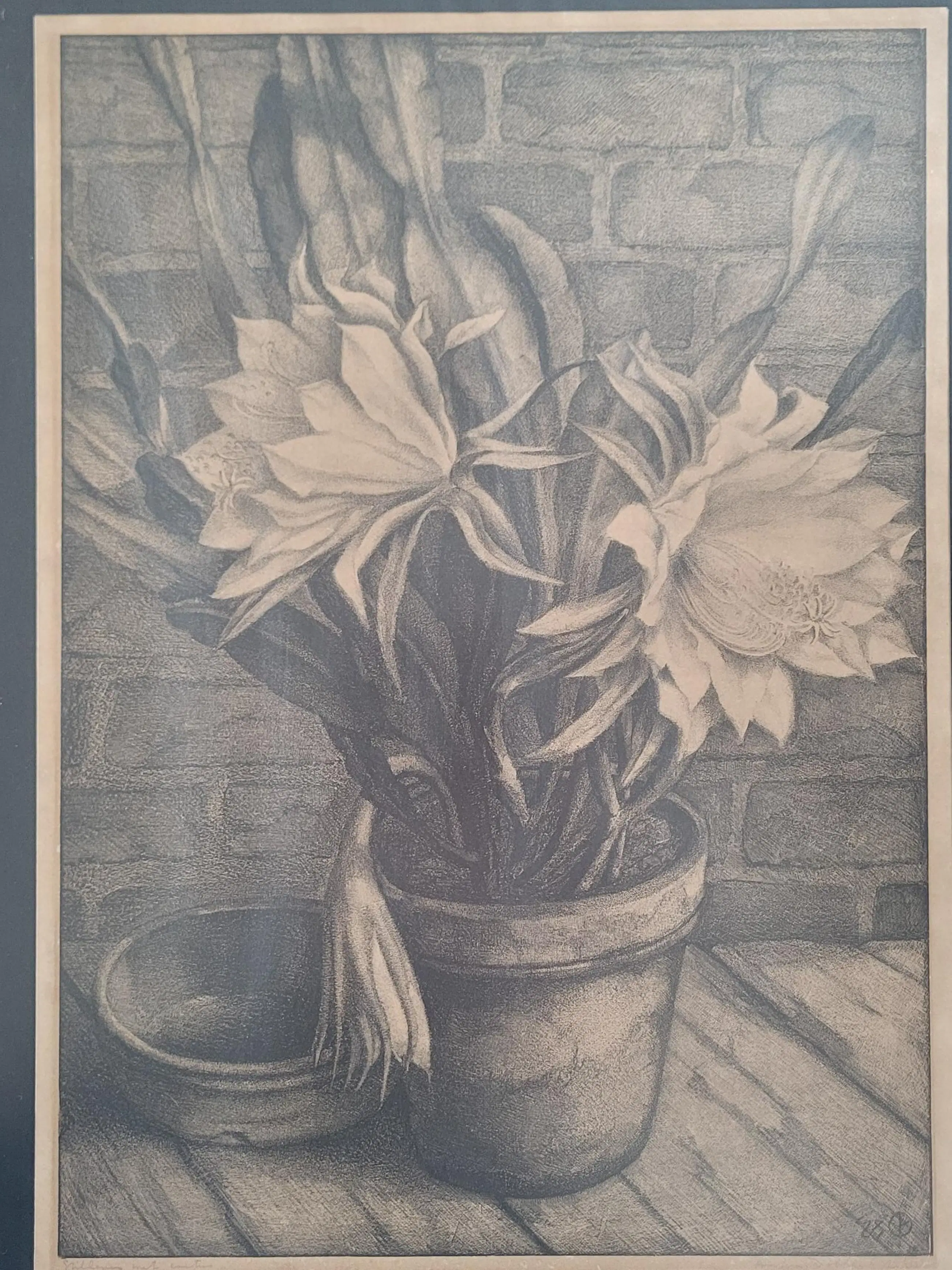Werk is fraai ingelijst achter ontspiegeld glas.