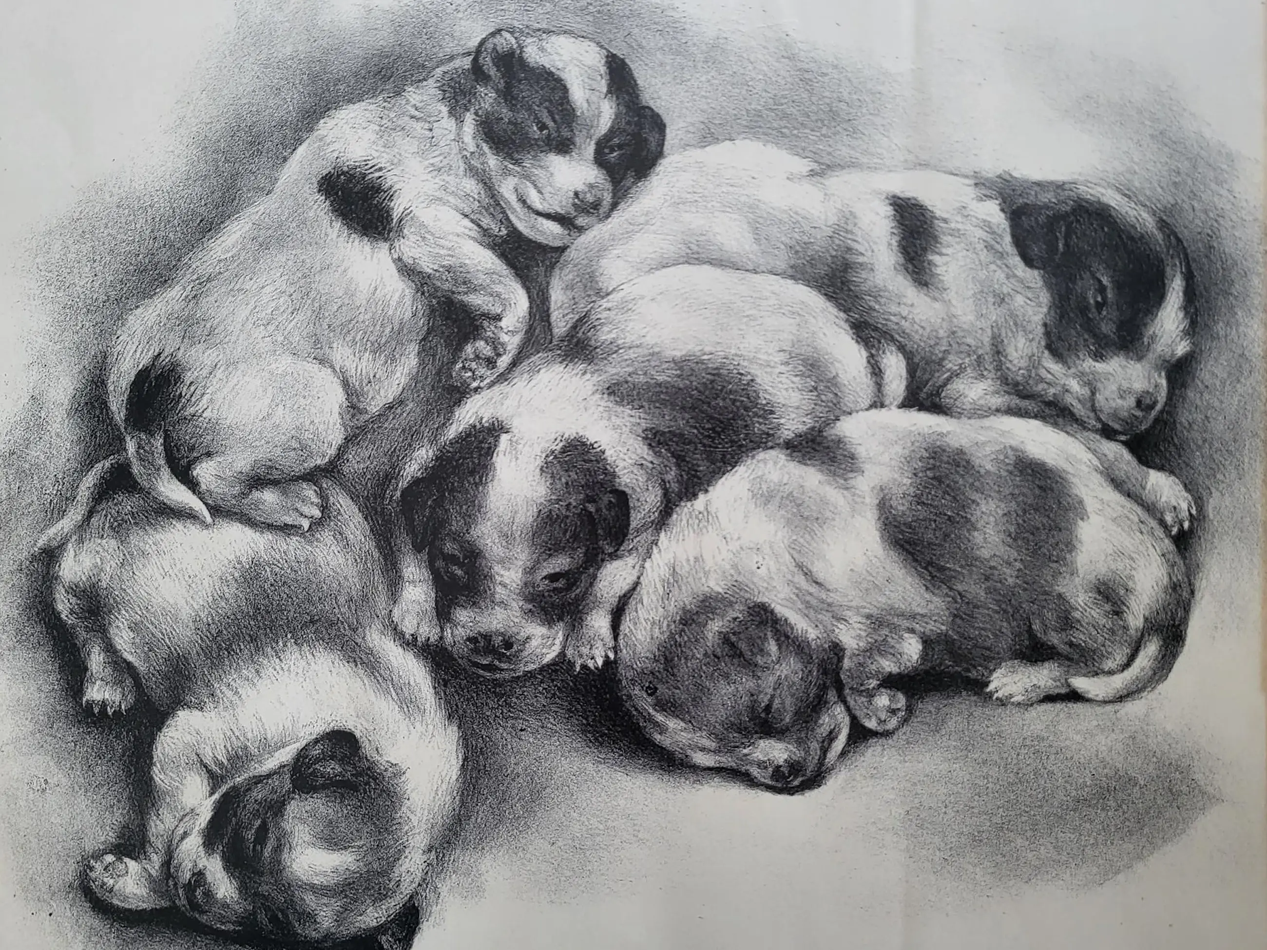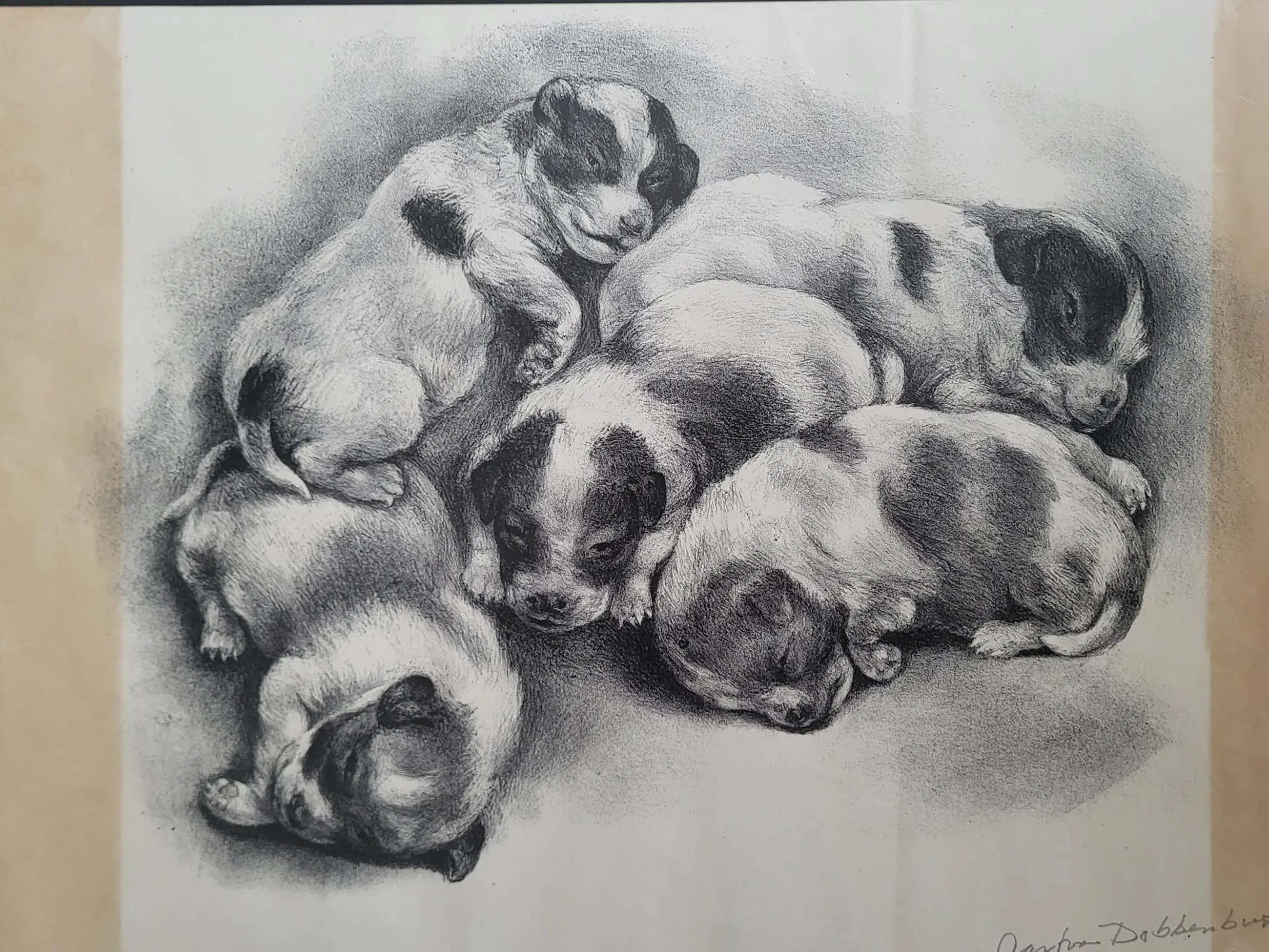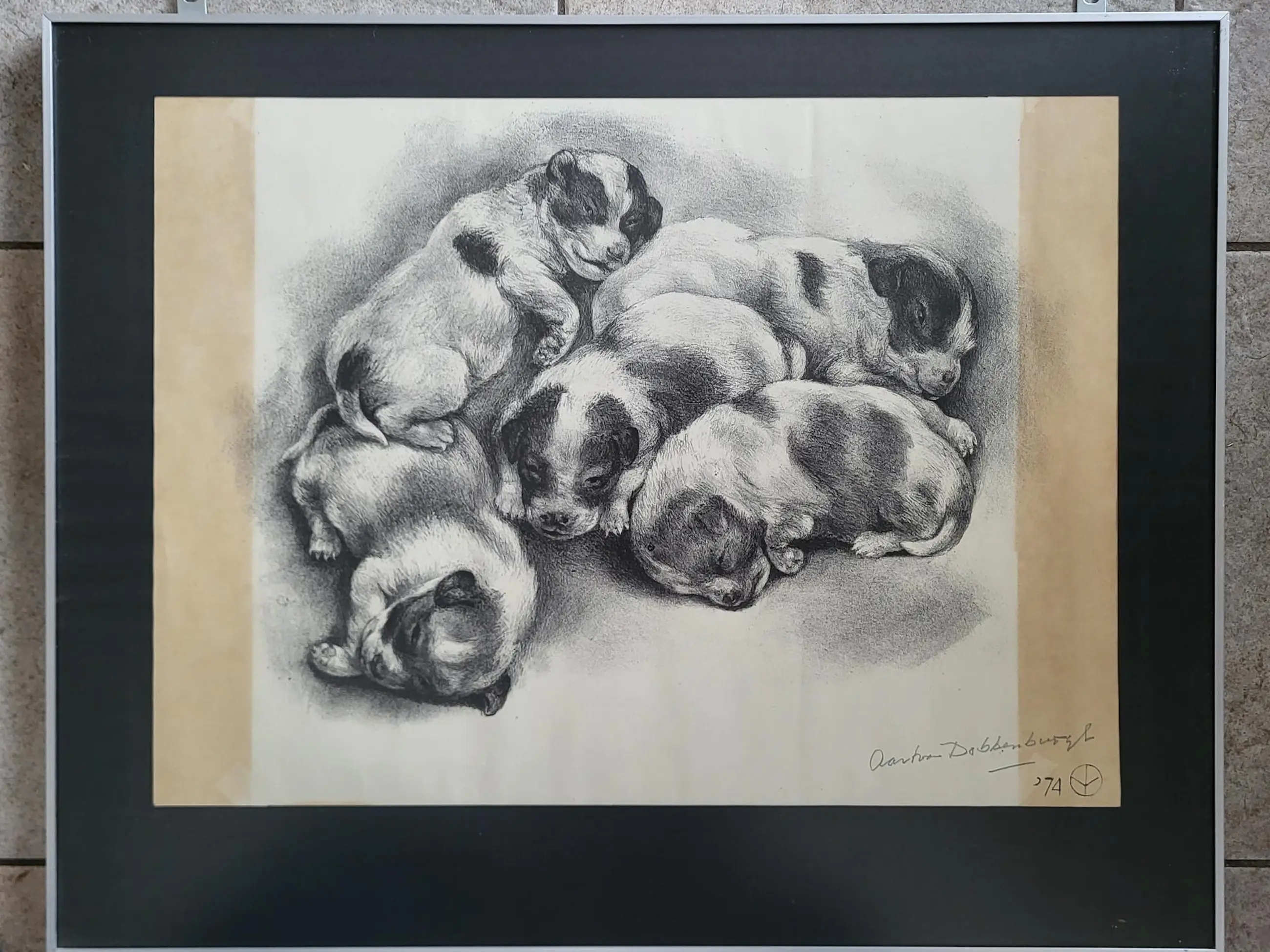 Werk is fraai ingelijst achter ontspiegeld glas.
