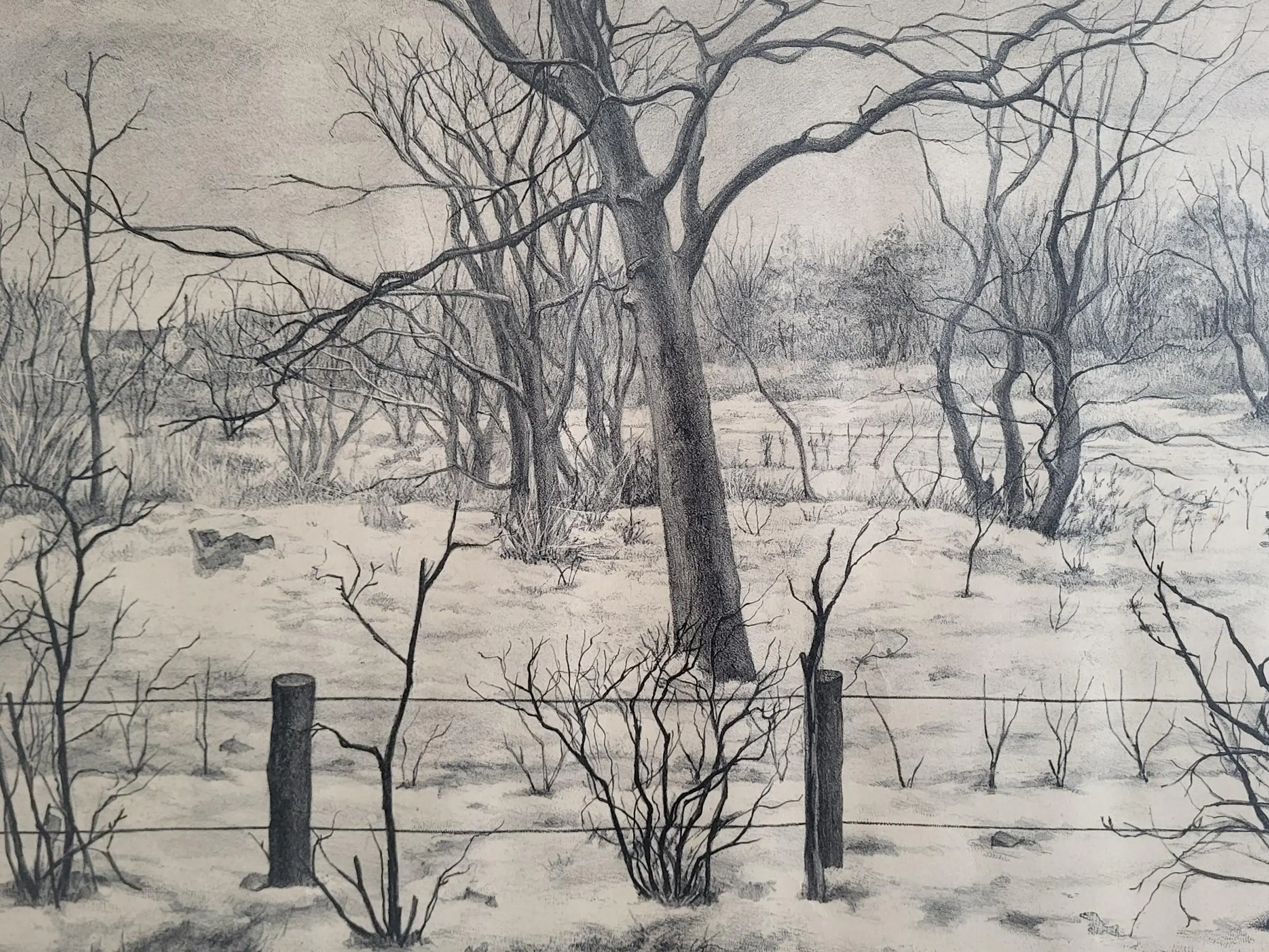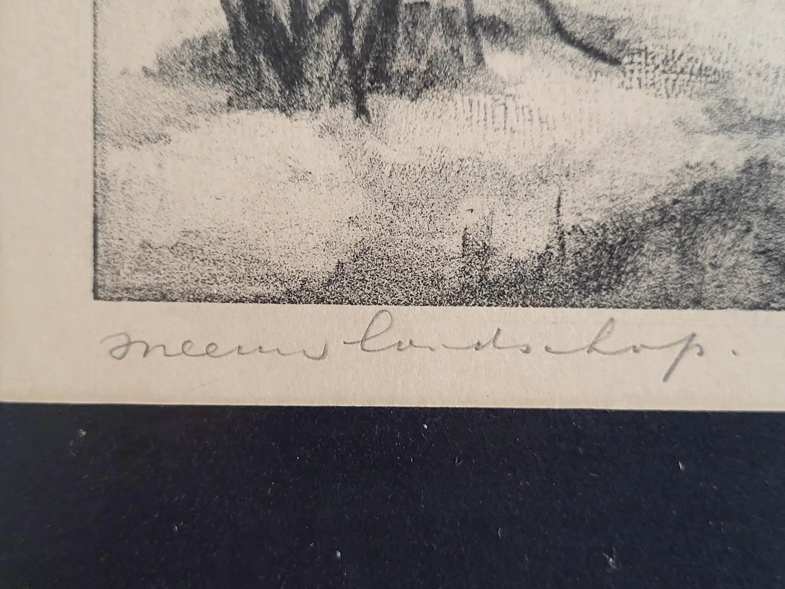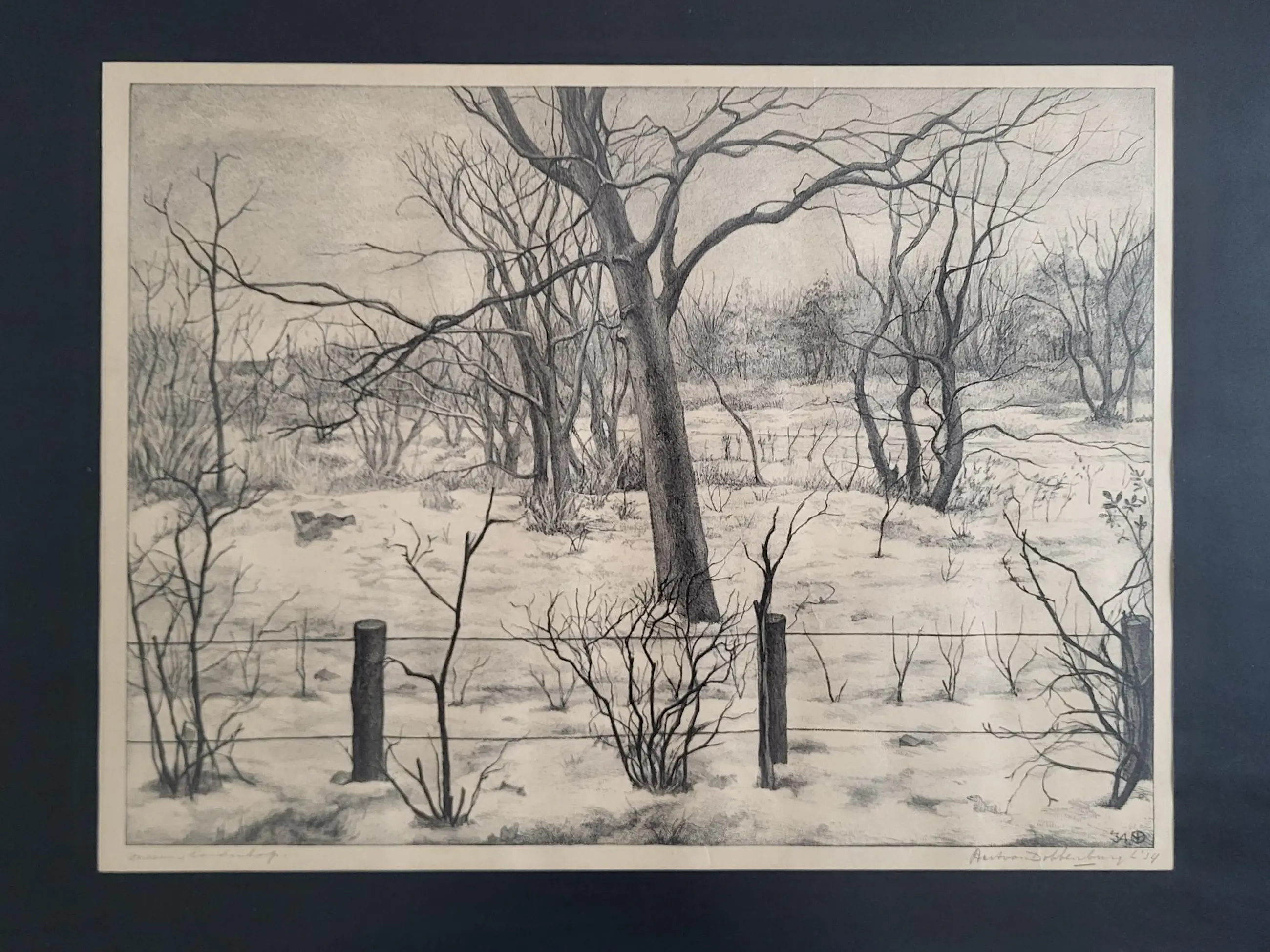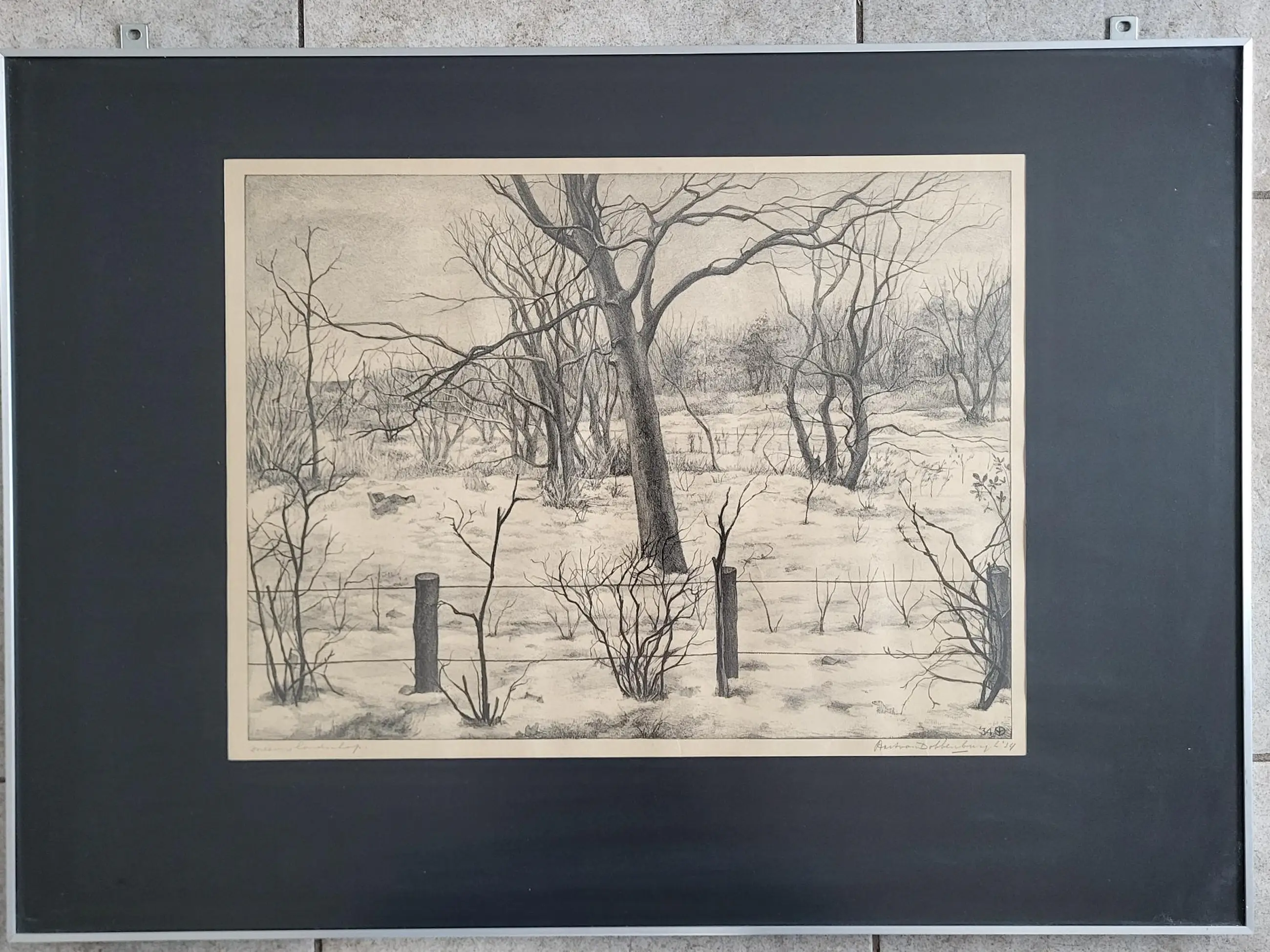 Werk is fraai ingelijst achter ontspiegeld glas.