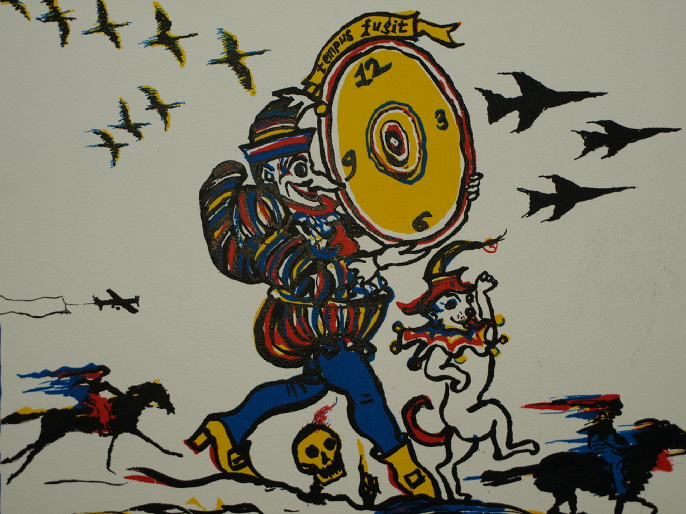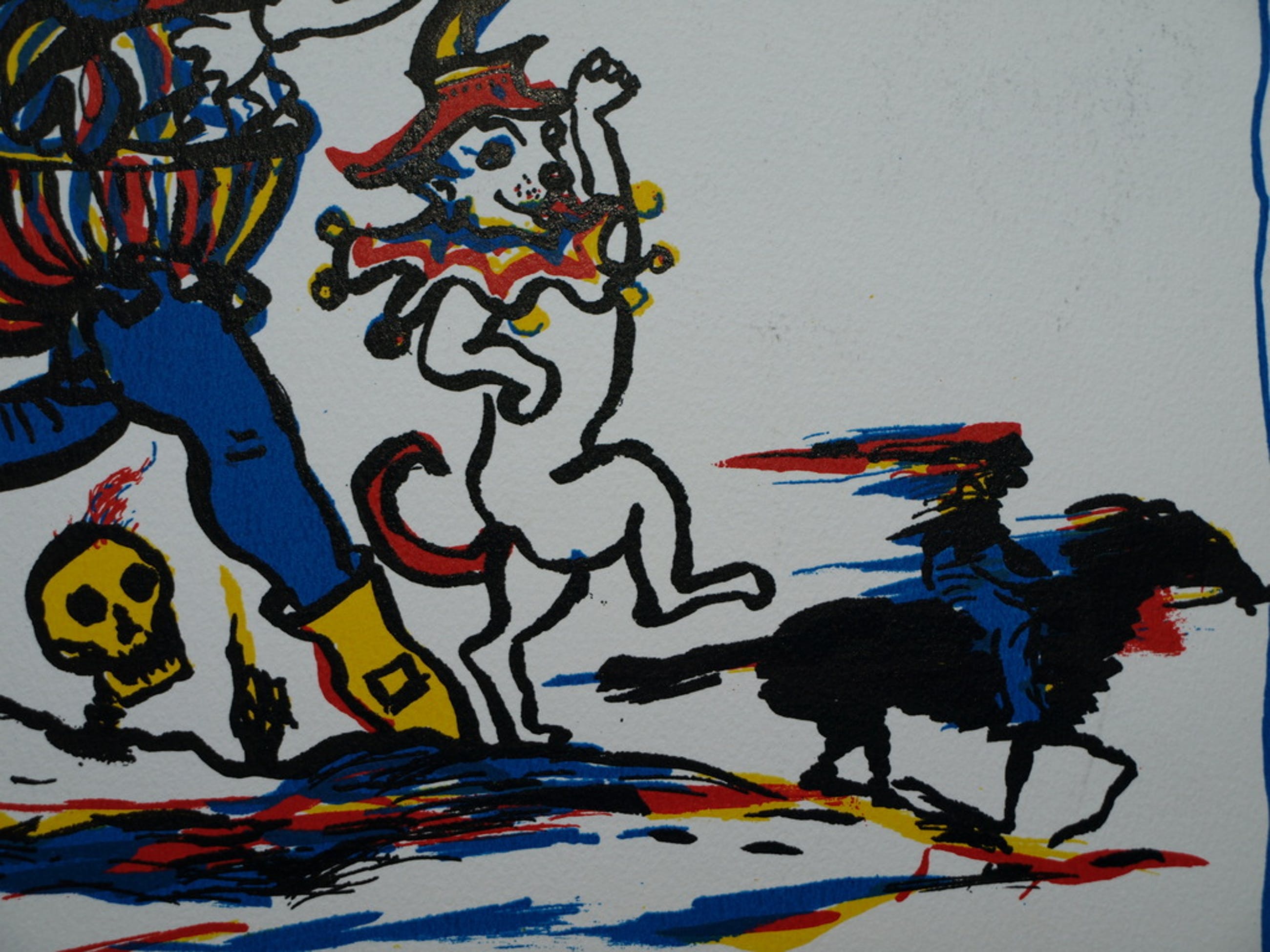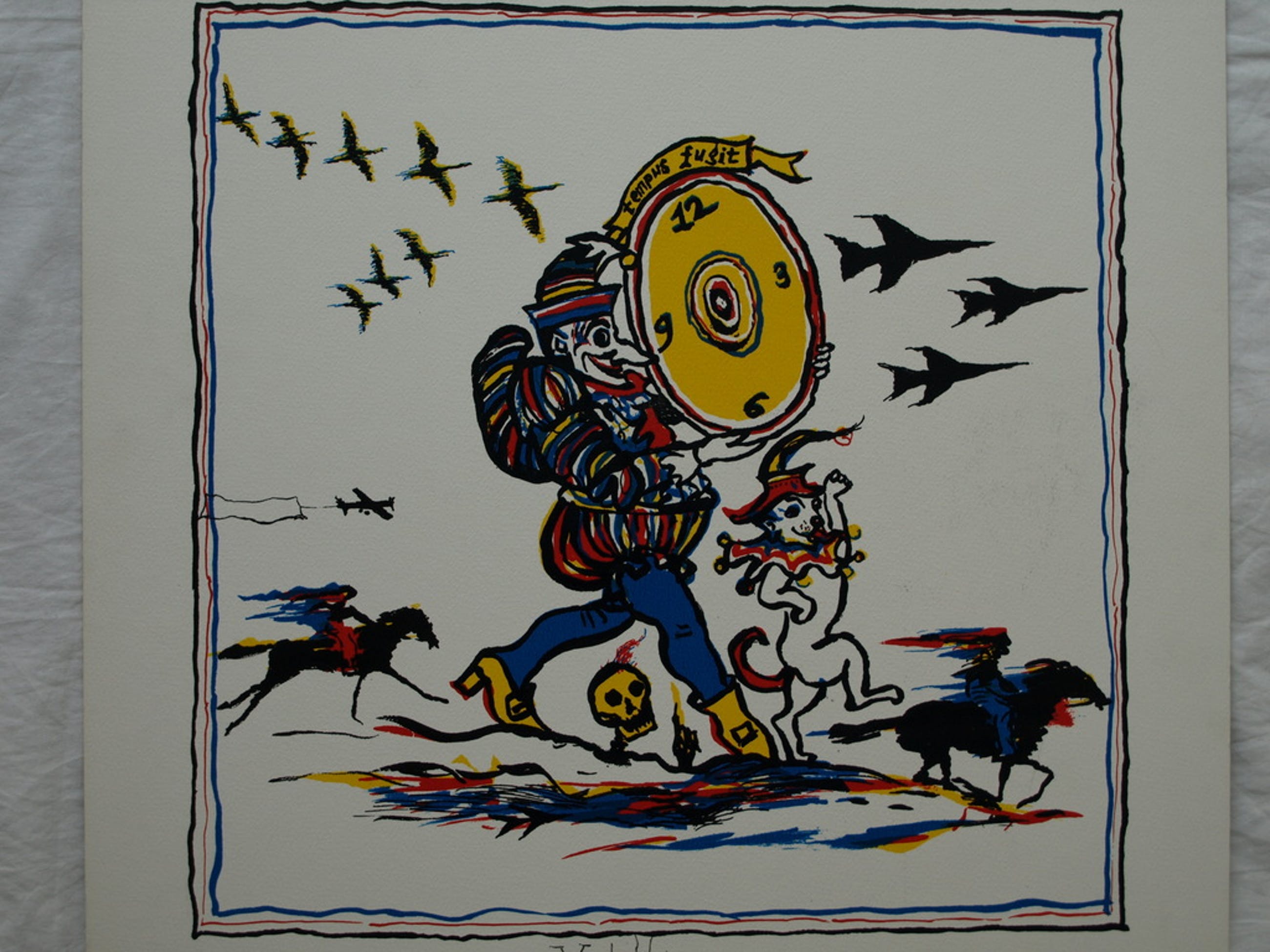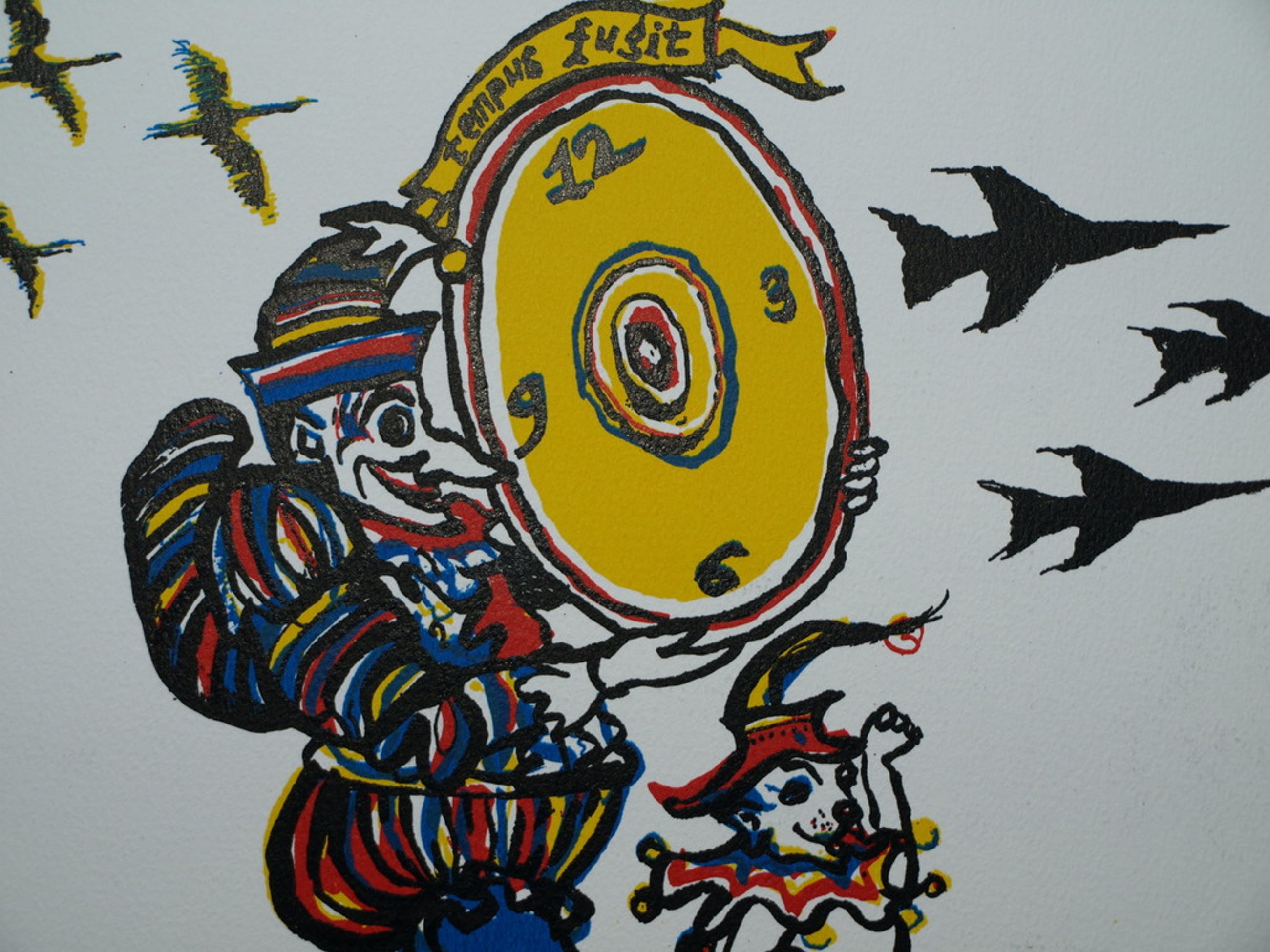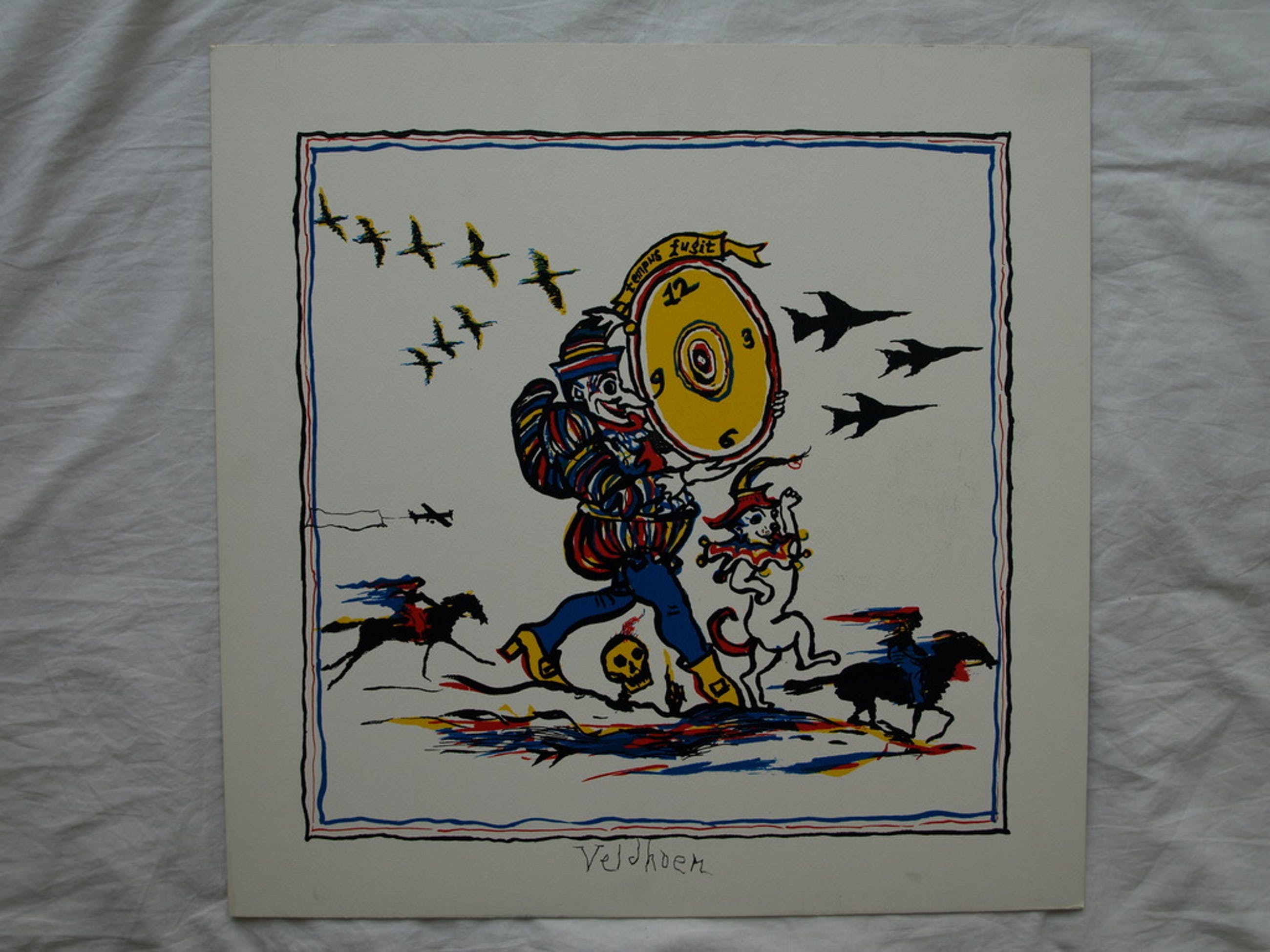 De zeefdruk is afgedrukt op karton en werd indertijd verkocht met een uurwerkje bevestigd op de plaats van de afbeelding van de klok in de handen van de harlekijn. Deze zeefdruk heeft geen uurwerkje en heeft dan ook geen gaatje in het karton.