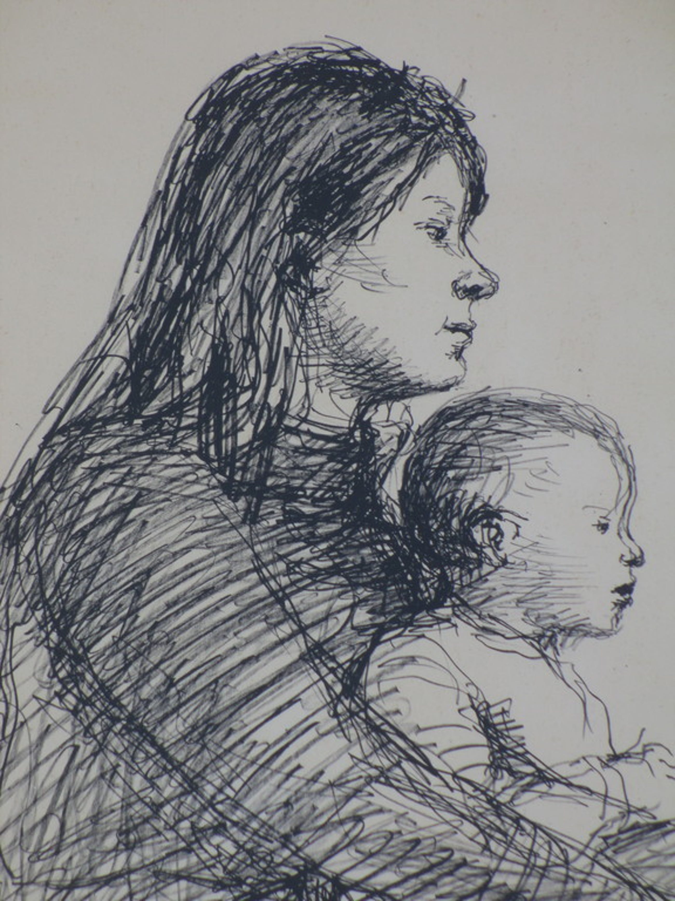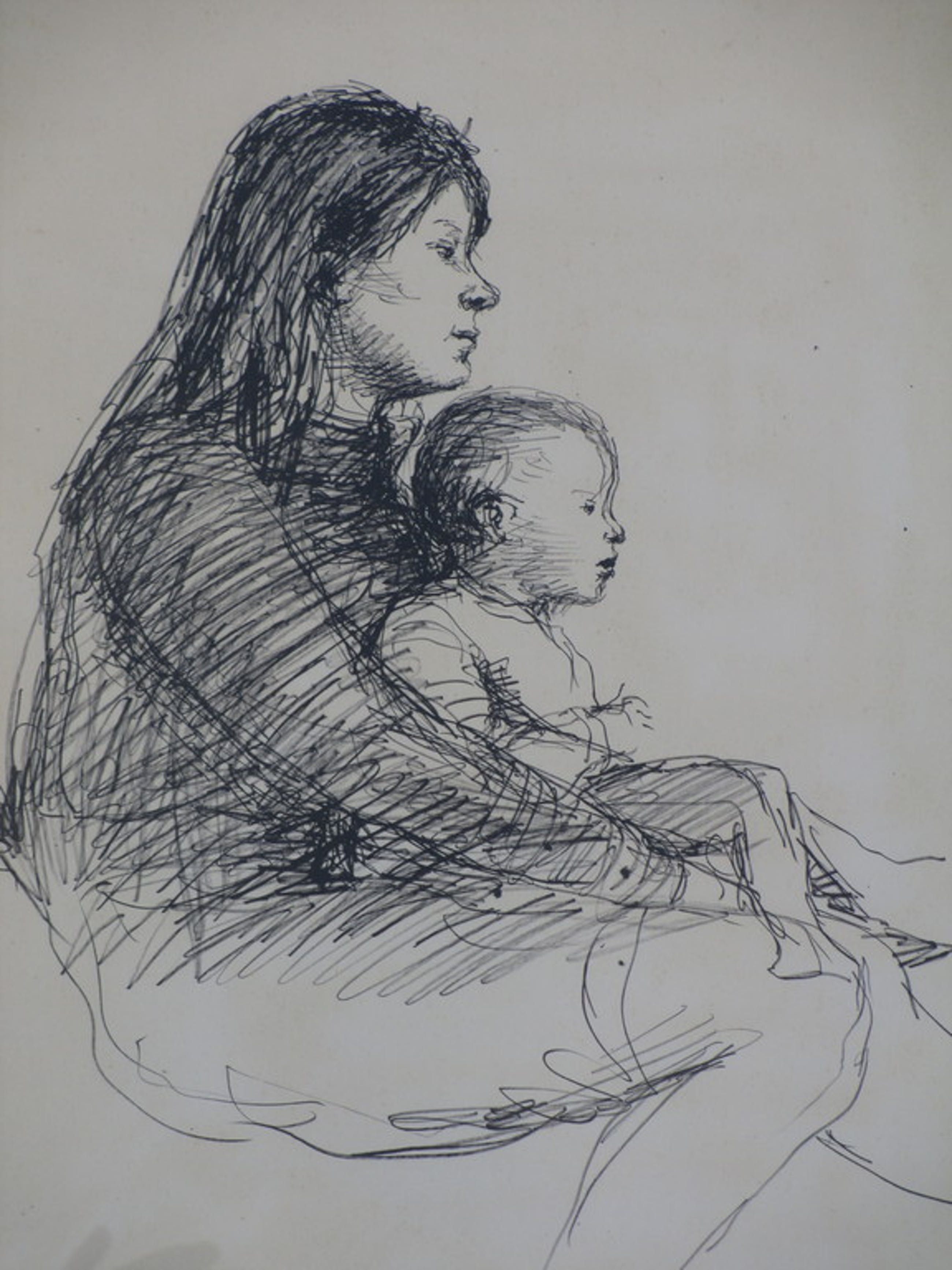 Voorstelling van een moeder met kind op schoot
