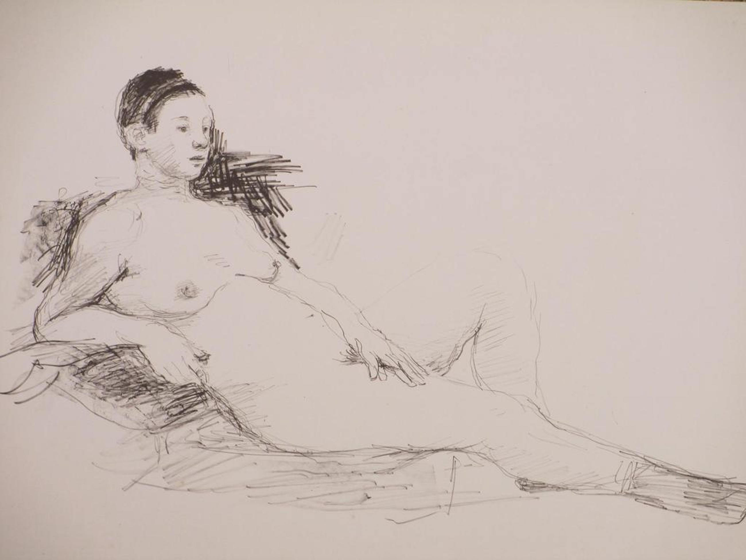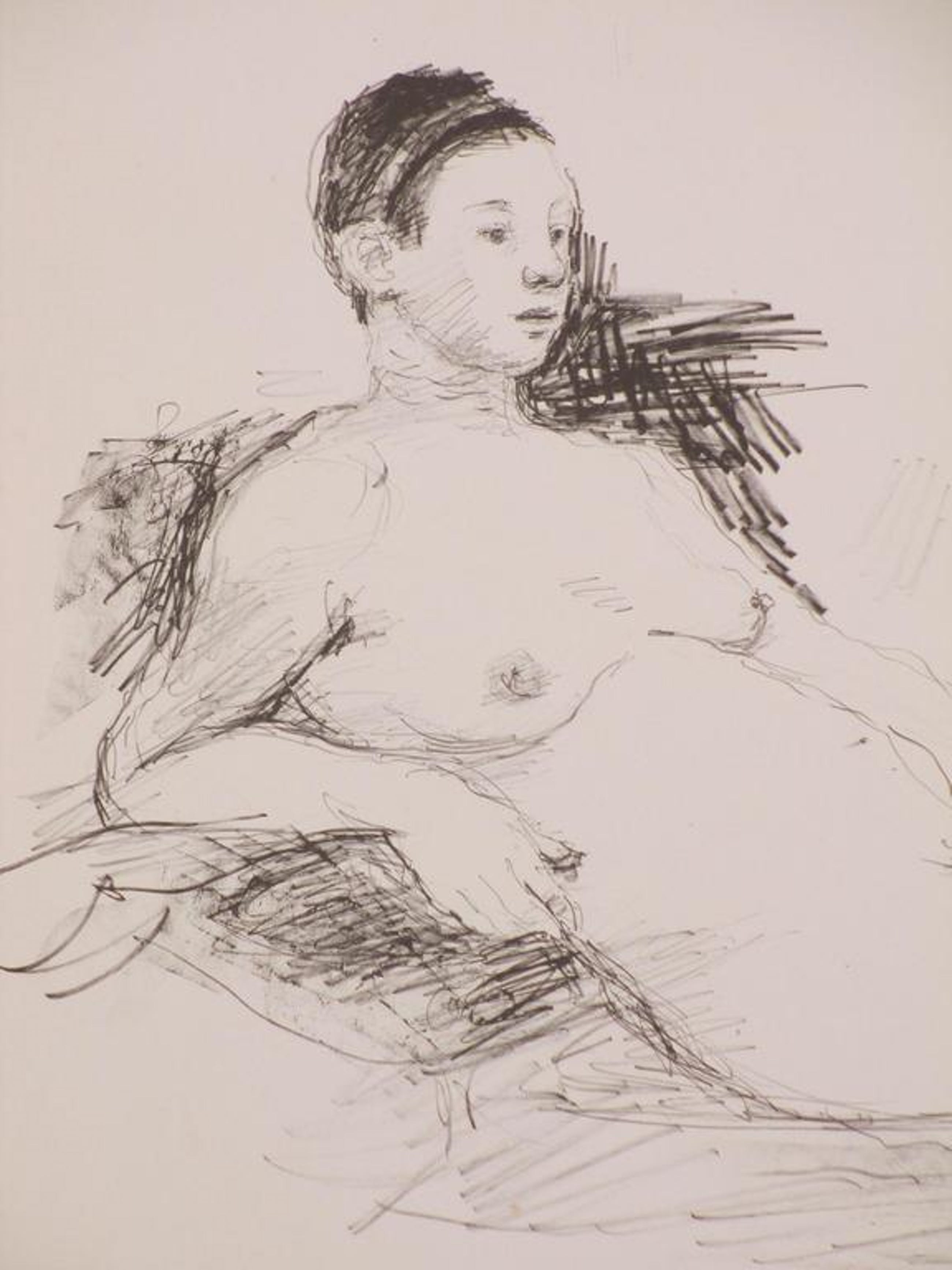 Voorstelling van een naakte vrouw, gezeten op kussens.