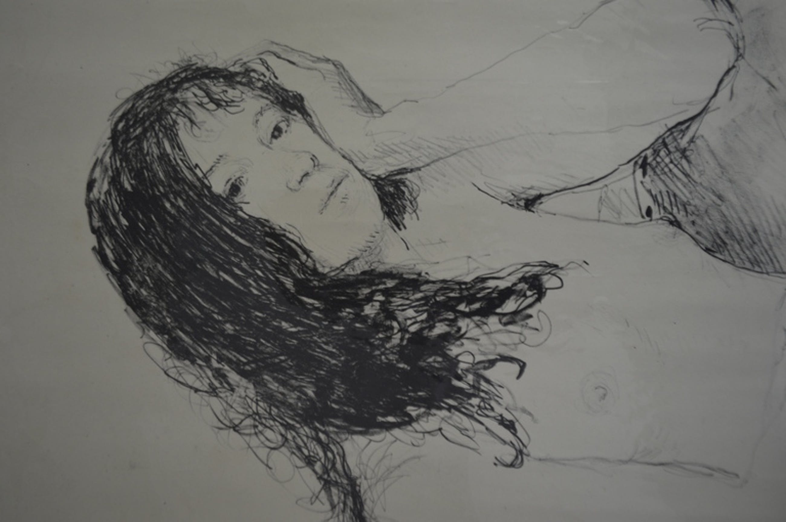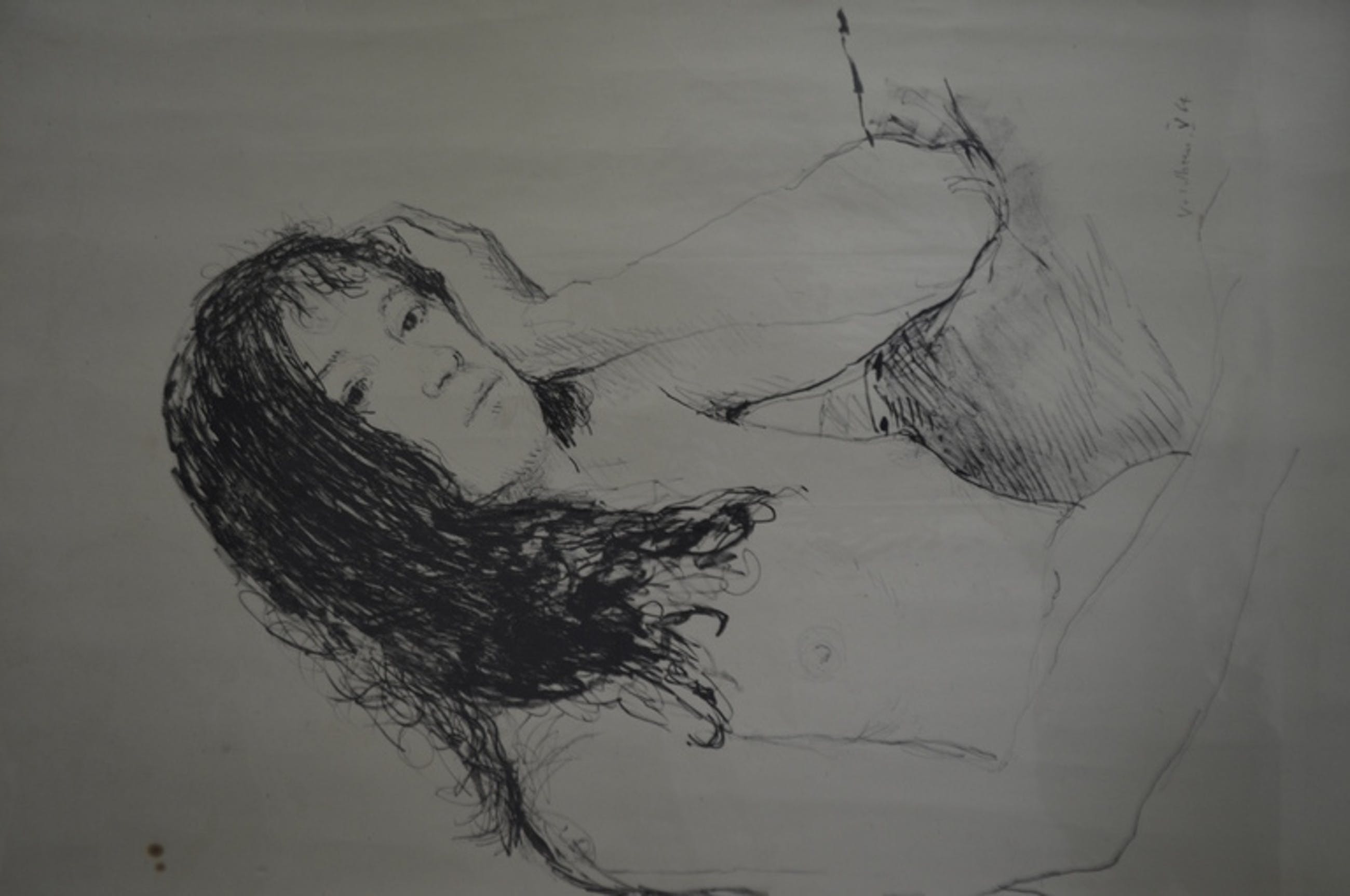 Peinzend naakt met kleine borstjes , rotaprint 1964 van Aat Veldhoen, 1964 - iets kreuk van oprollen, ietsje geel papier, niet storend.. nette tekening hoor.