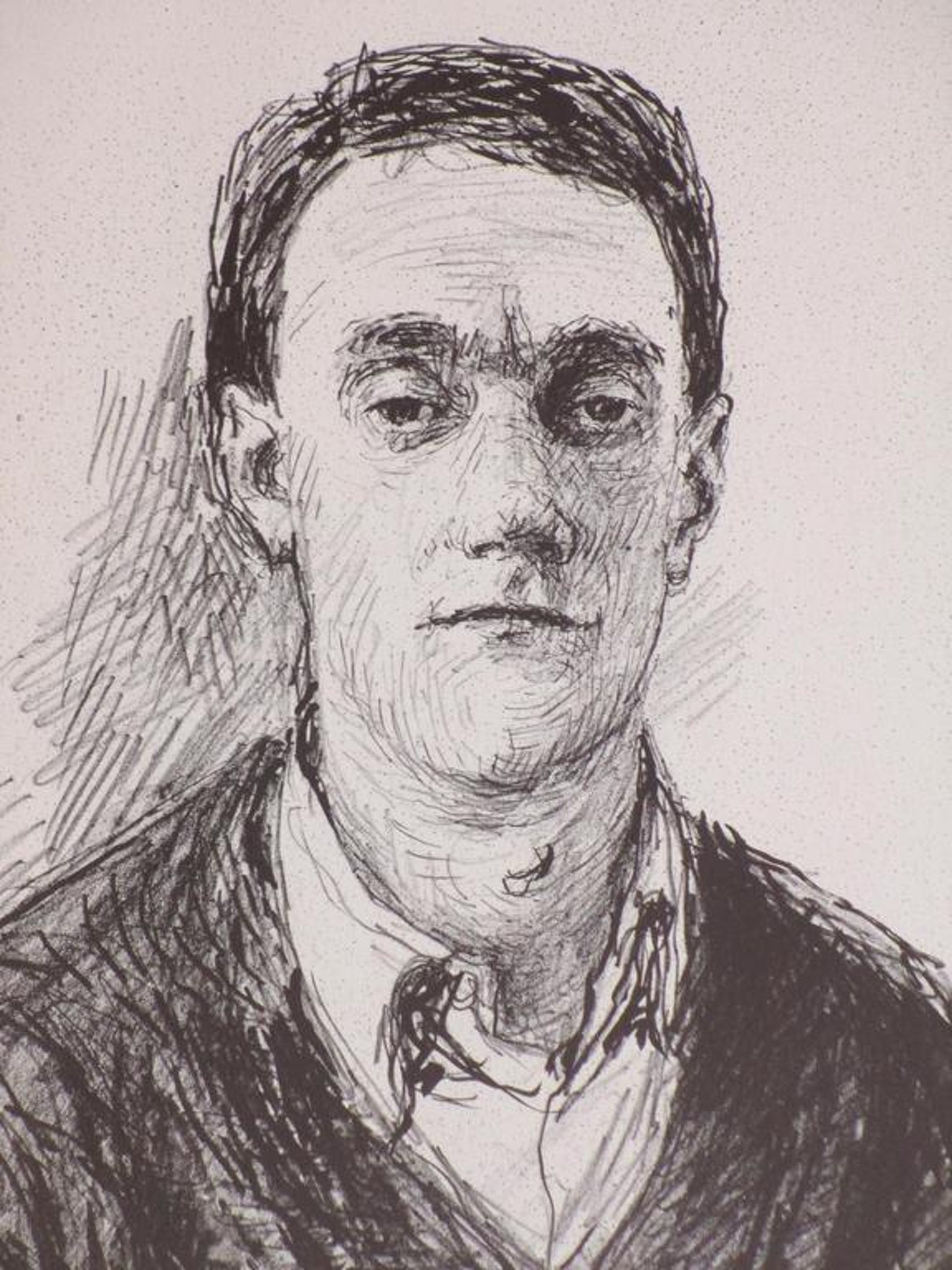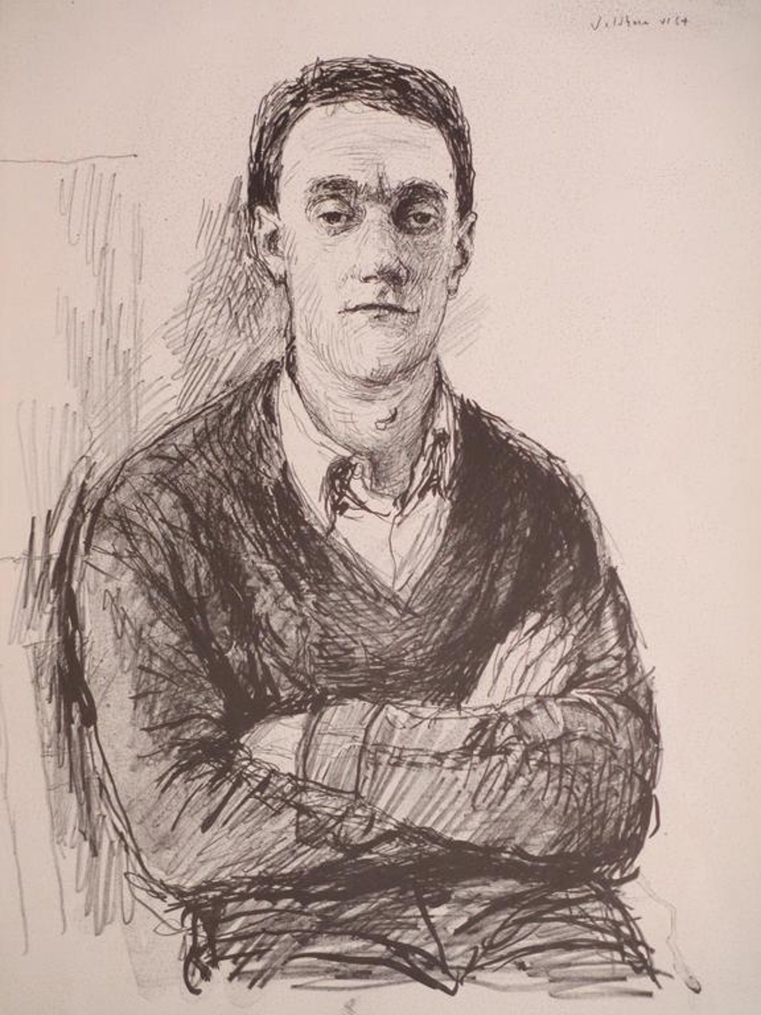 Voorstelling van een zittende man met de armen over elkaar geslagen.