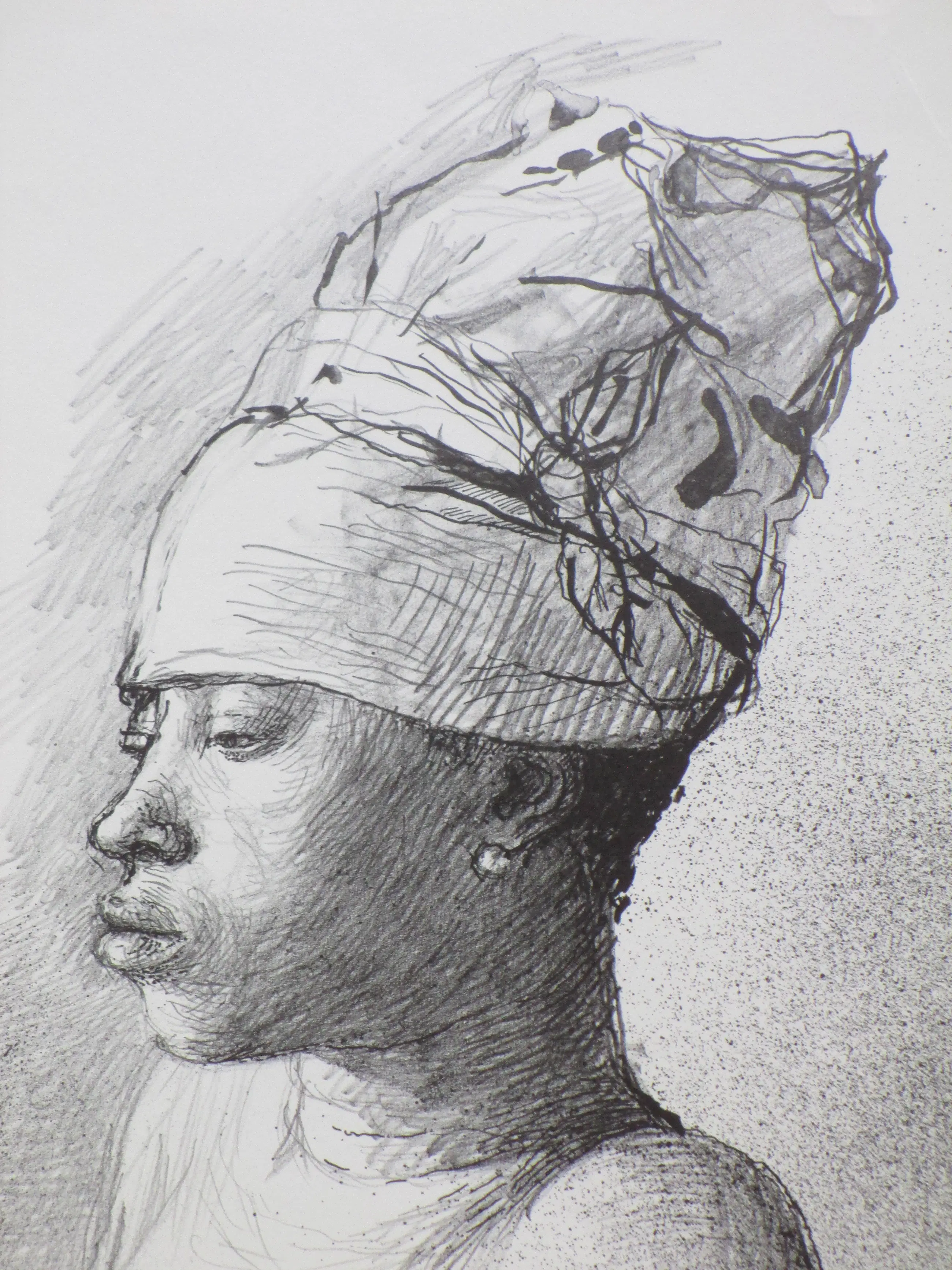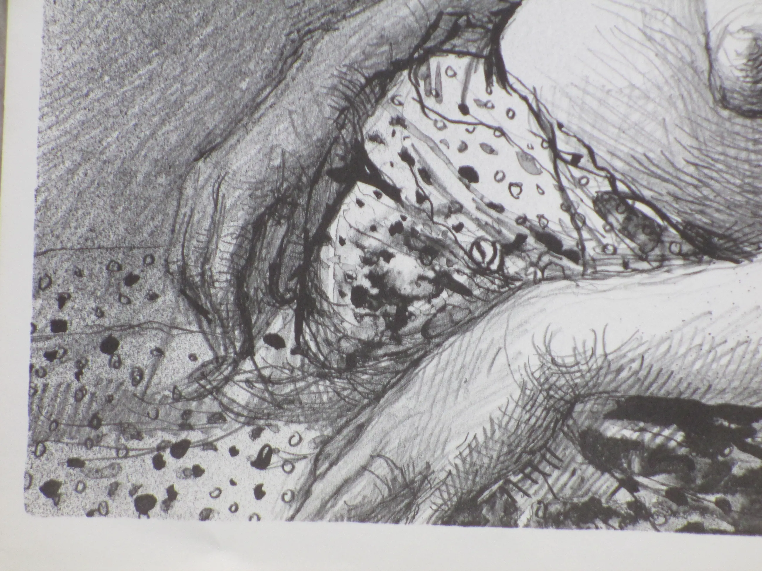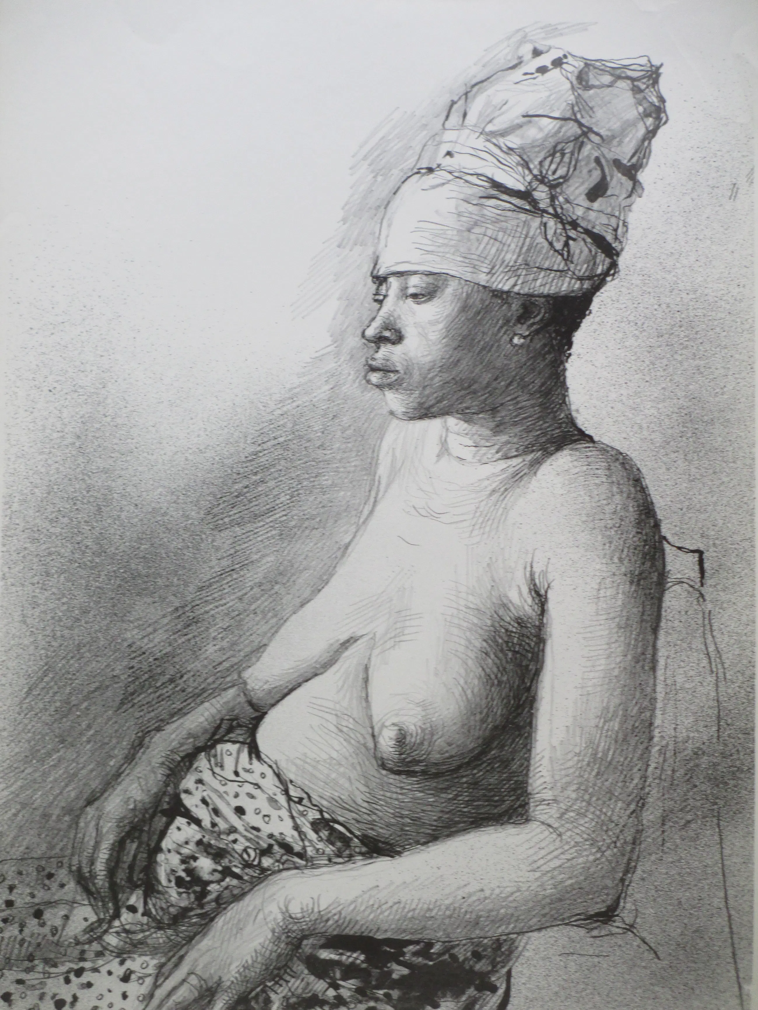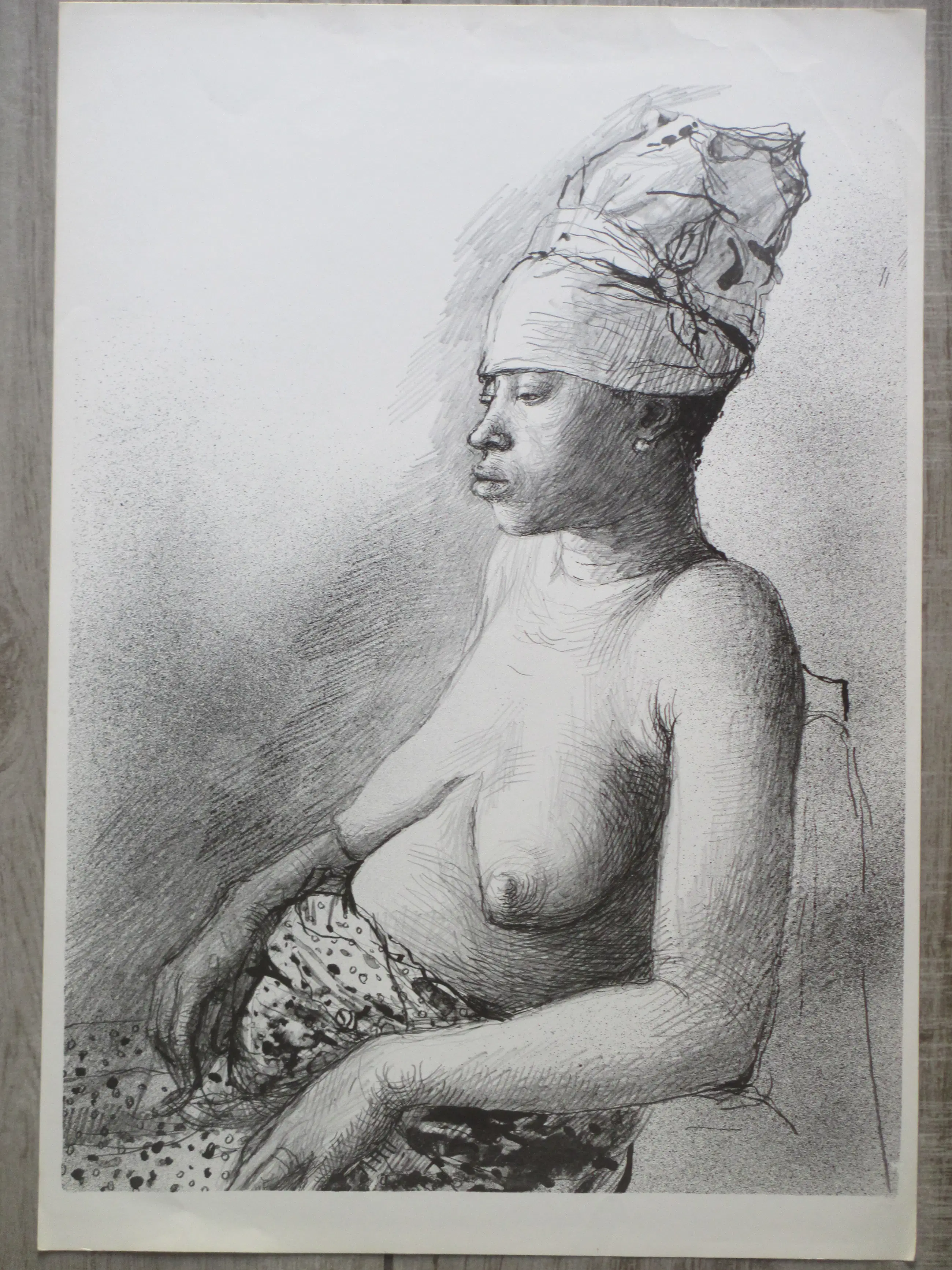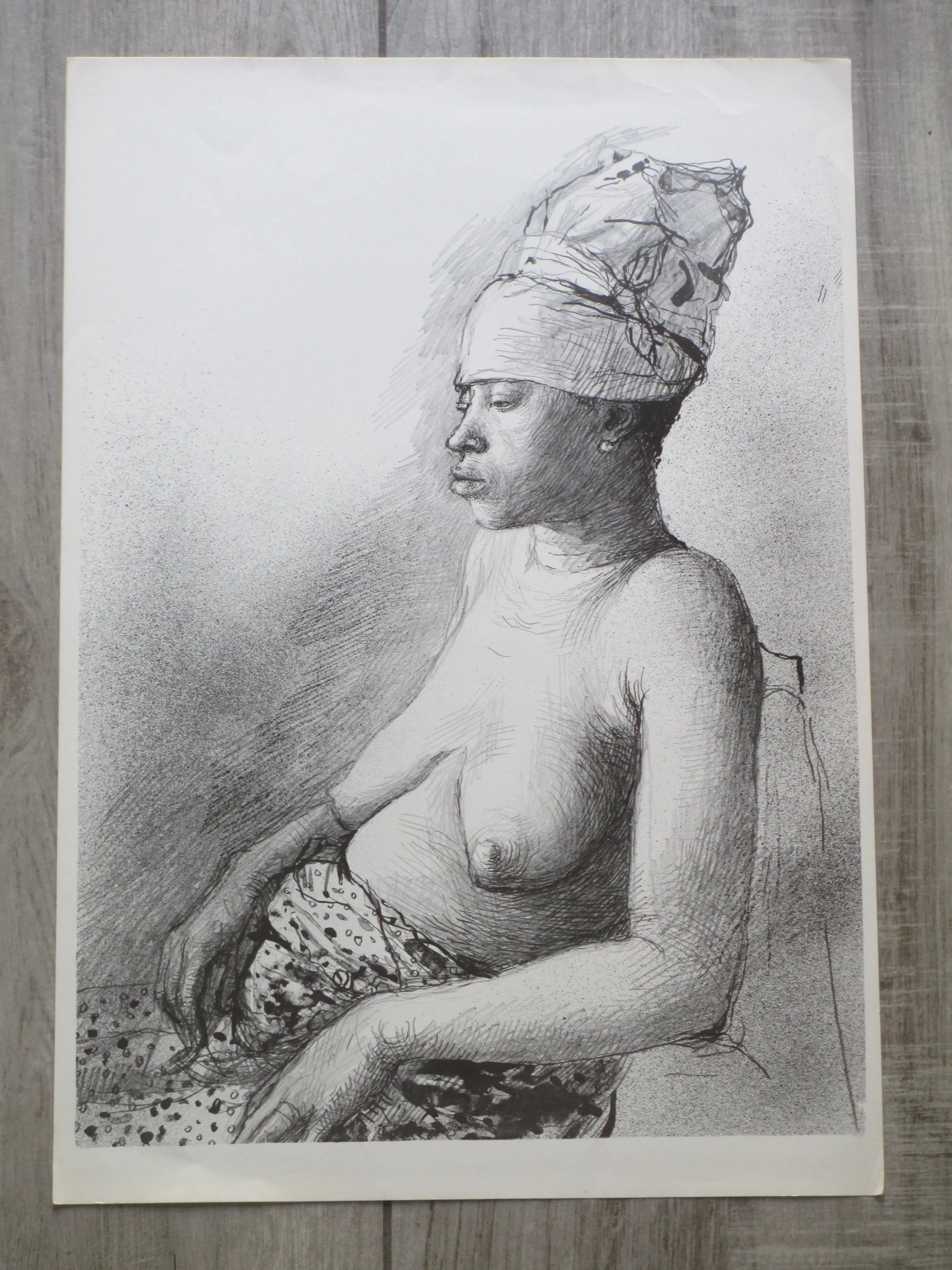 Rotaprint door Aat Veldhoen Voorstelling van een half ontklede Afrikaanse vrouw Losbladig, beeldmaat 46x33, bladmaat 50x35 Onduidelijk in de druk gedateerd en gesigneerd m.o. Authenticiteit volledig gegarandeerd