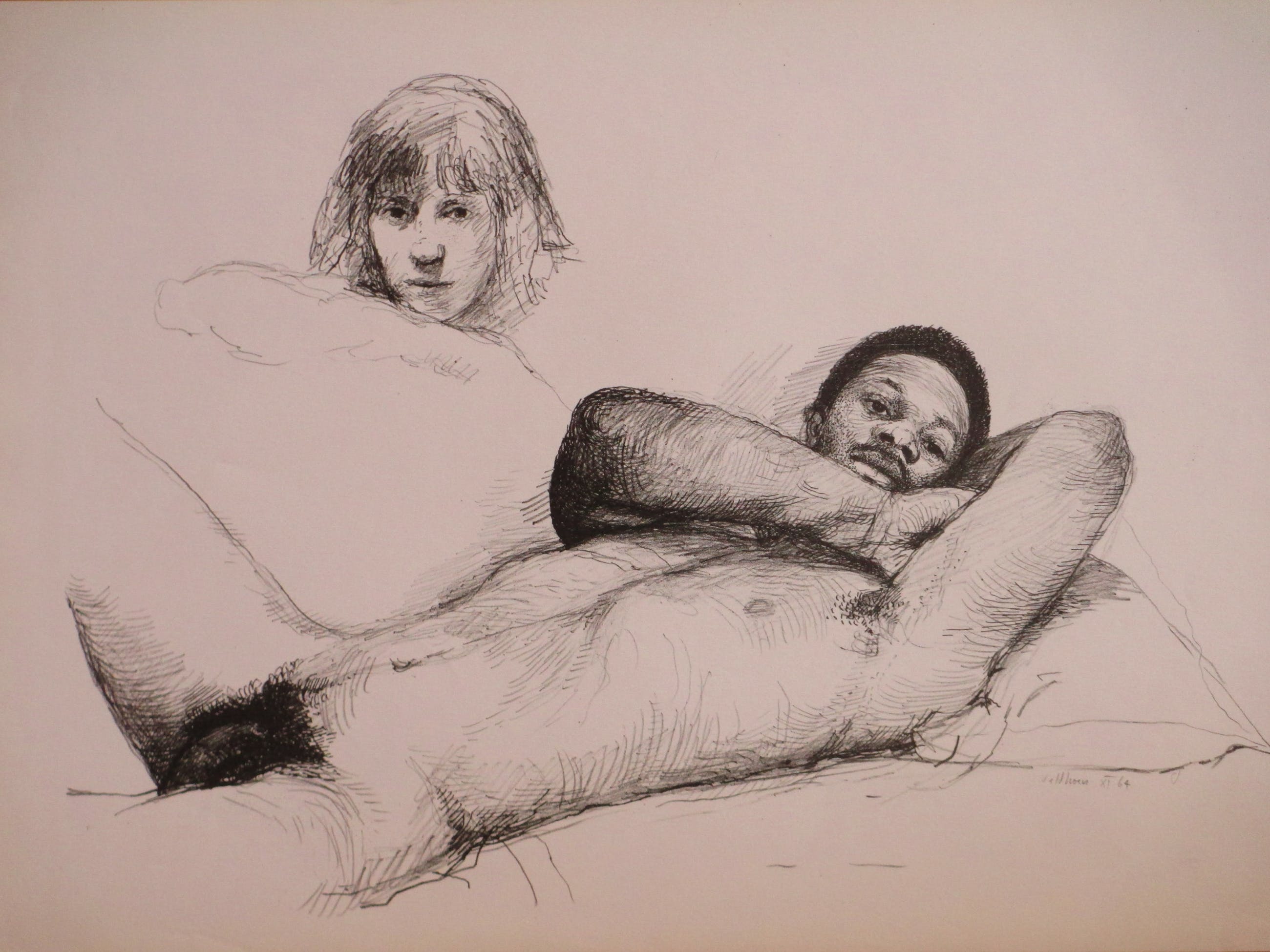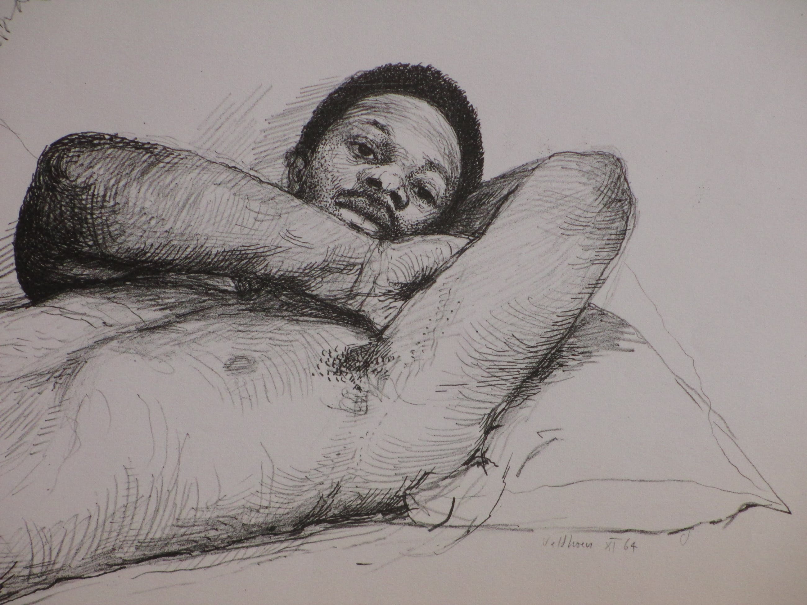 Rotaprint door de bekende Amsterdamse kunstenaar Aat VeldhoenVoorstelling van een blote man met een zelfportretVeldhoen trok met zijn bakfiets door Amsterdam en drukte op straat zijn rotaprints voor geïnteresseerdenLosbladig, beeldmaat 30x44, bladmaat 34x49Gesigneerd en gedateerd r.o. in de druk ' Veldhoen XI 64' Authenticiteit volledig gegarandeerd