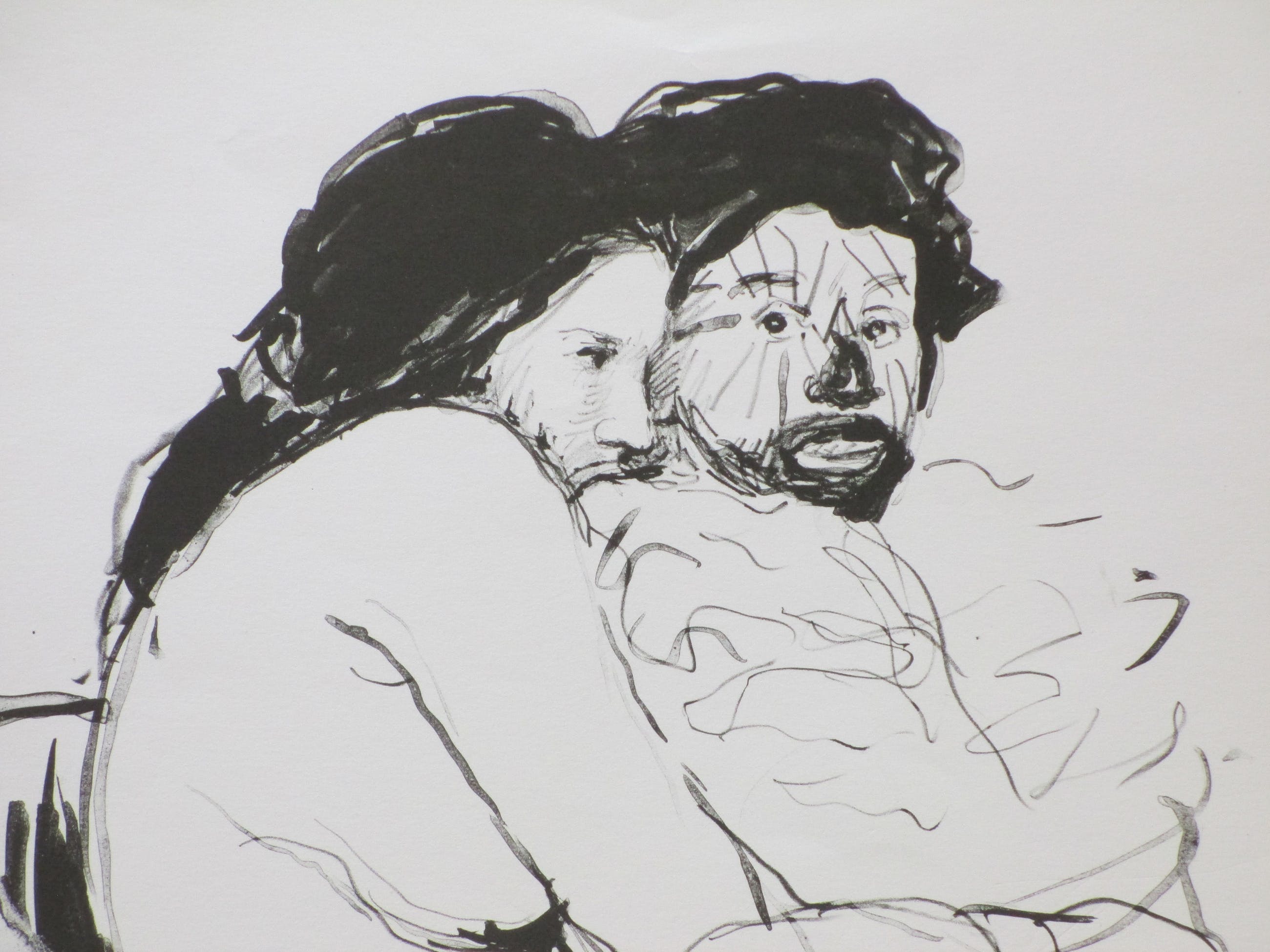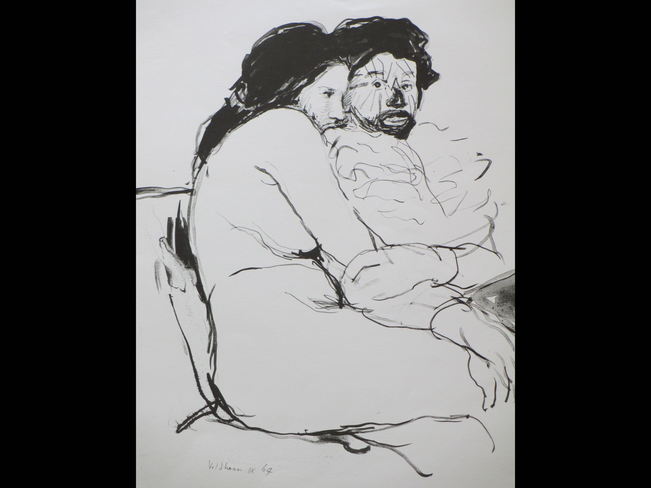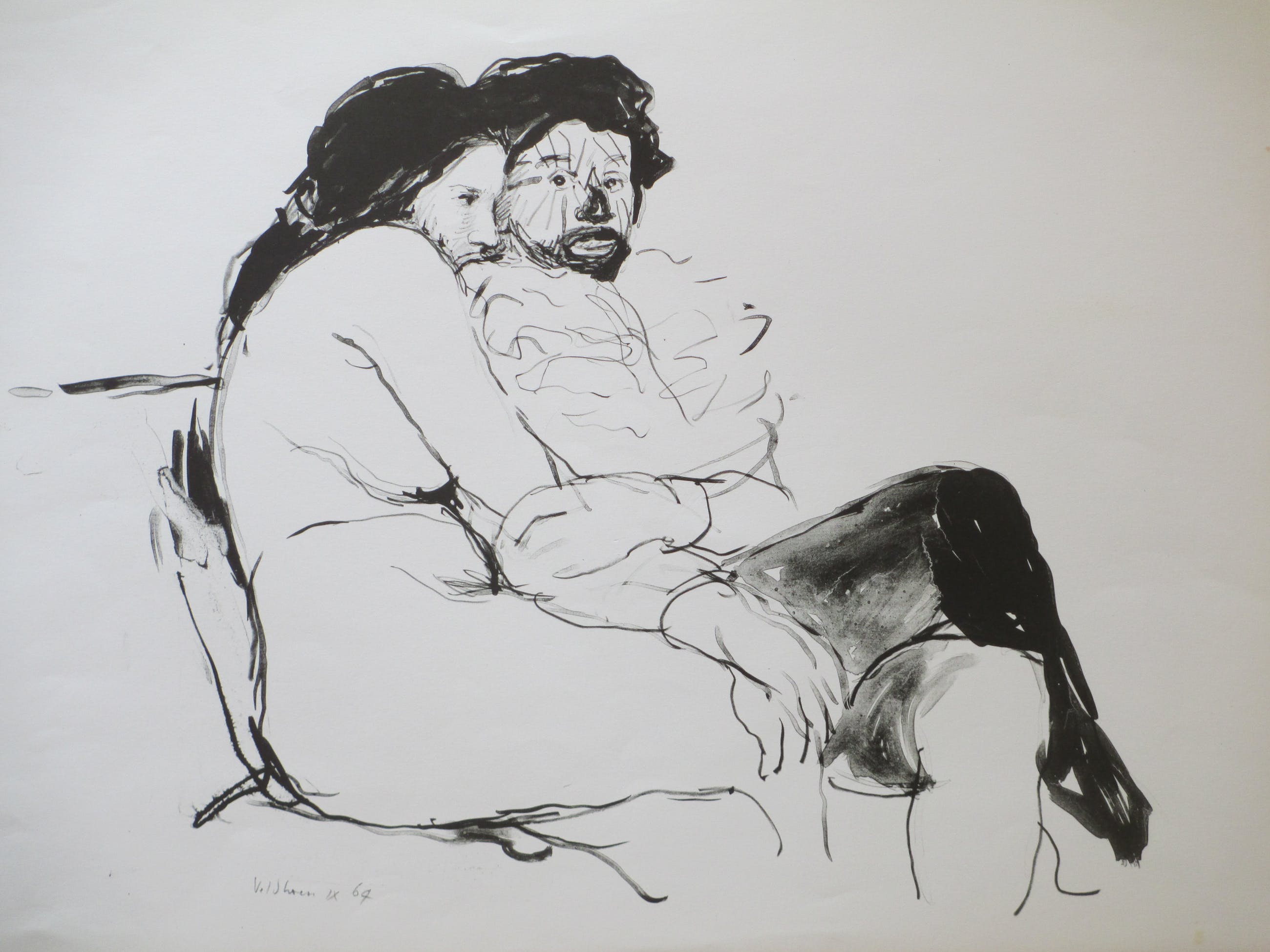 Karakteristieke rotaprint door Aat Veldhoen.Voorstelling van een Clown en een Naakt.De Clown is Jasper Grootveld.Losbladig, beeldmaat 30x41, bladmaat 35x49Gesigneerd en gedateerd l.o. in de druk 'Veldhoen IX 64'Authenticiteit volledig gegarandeerd.