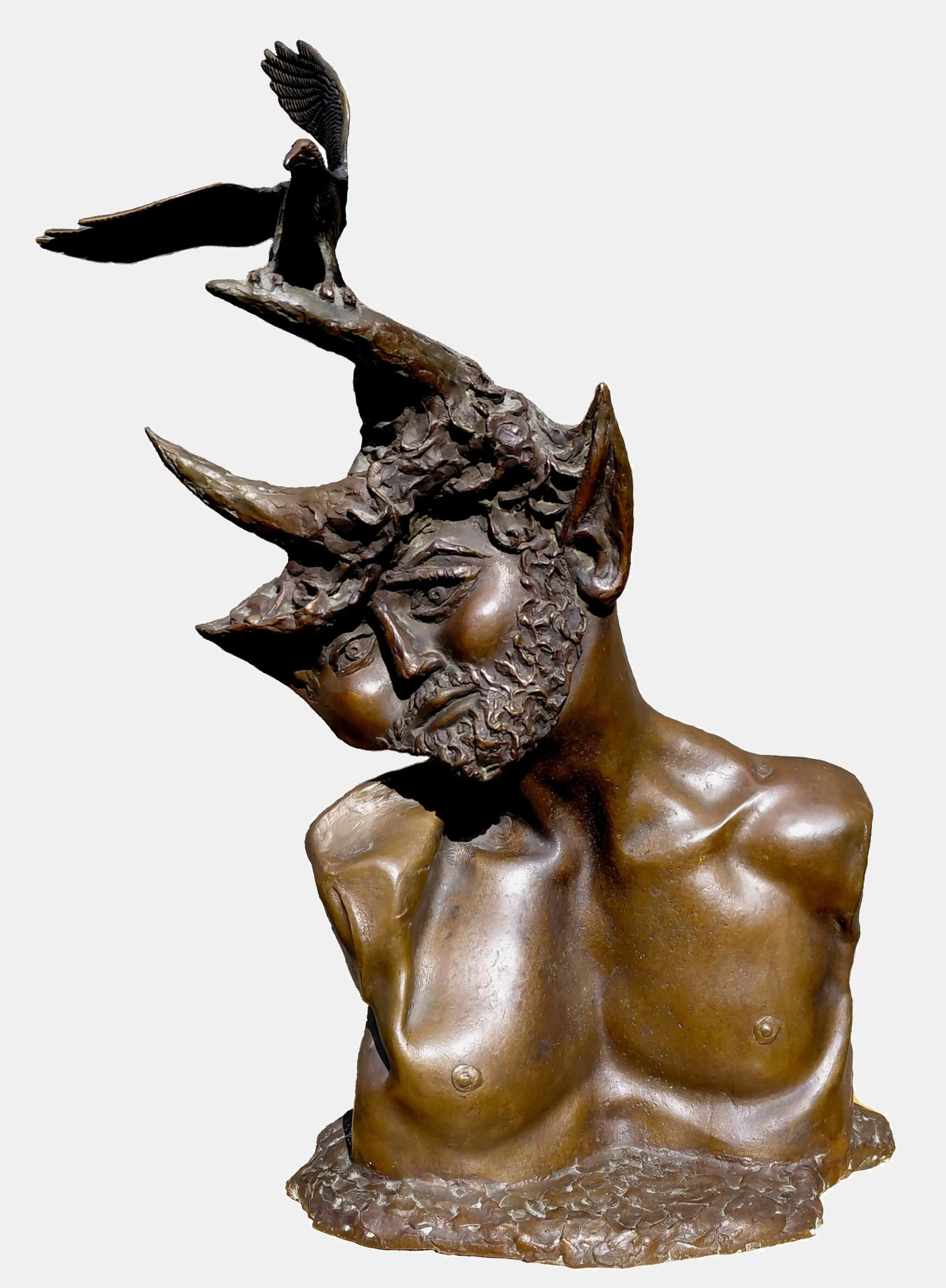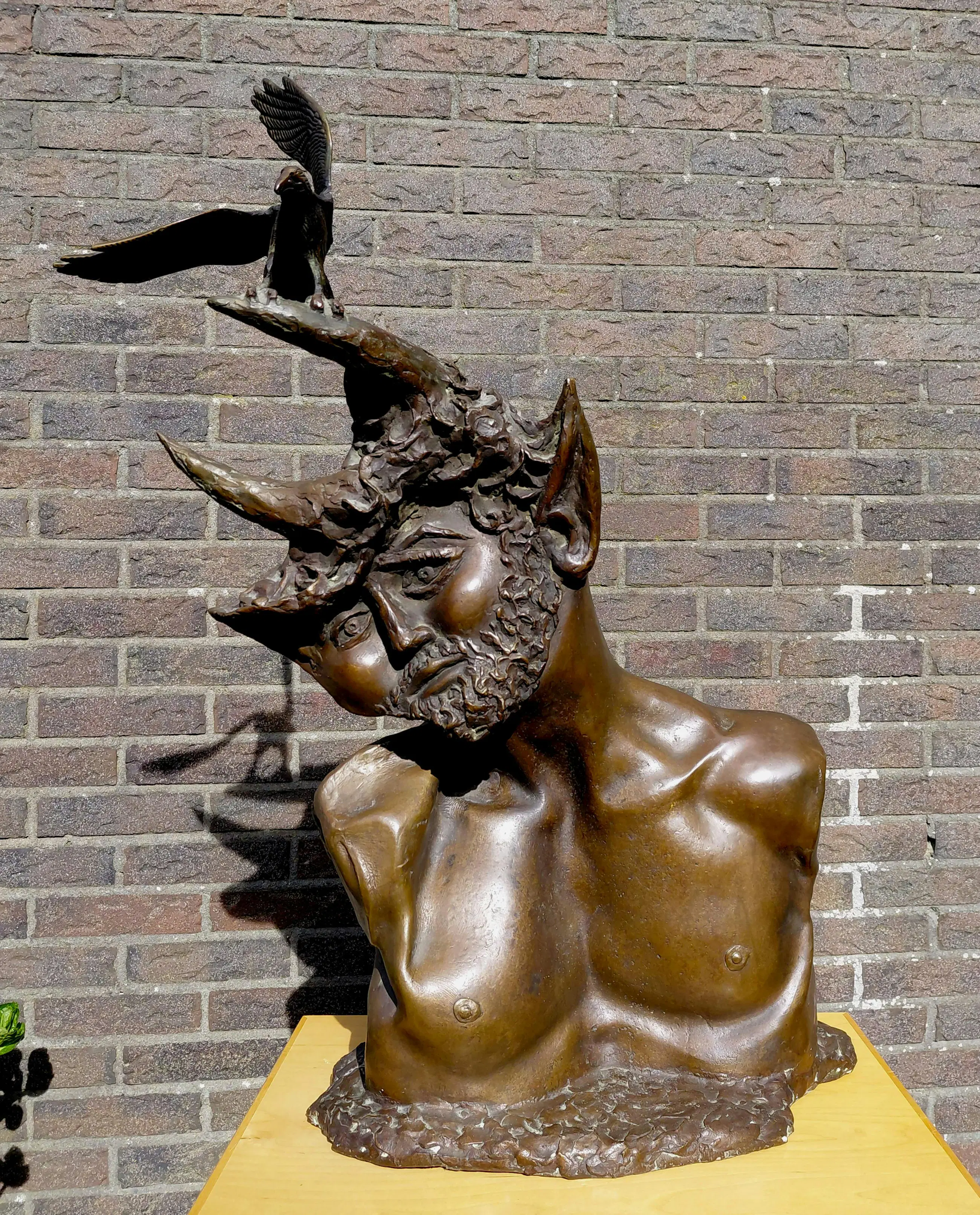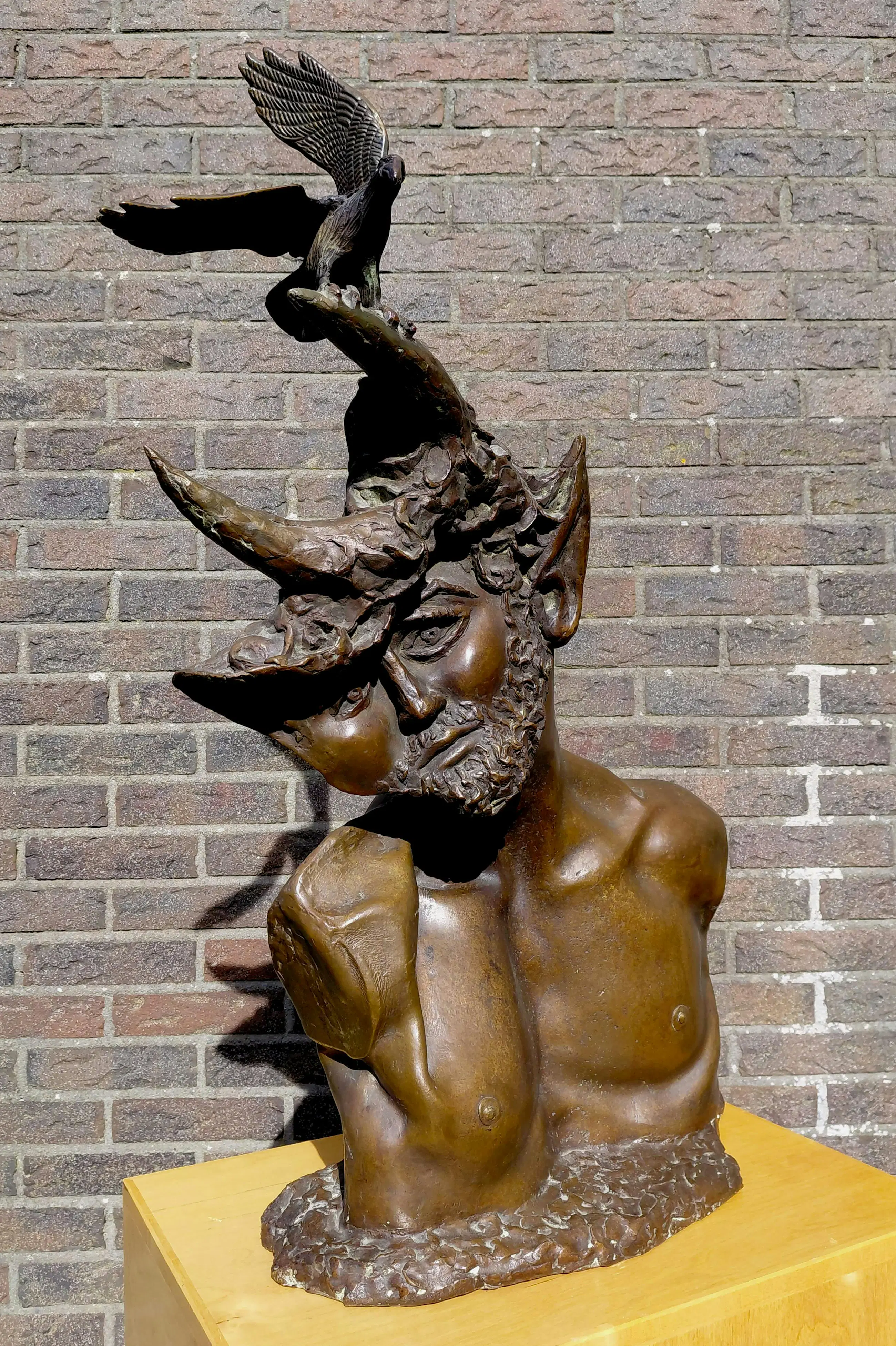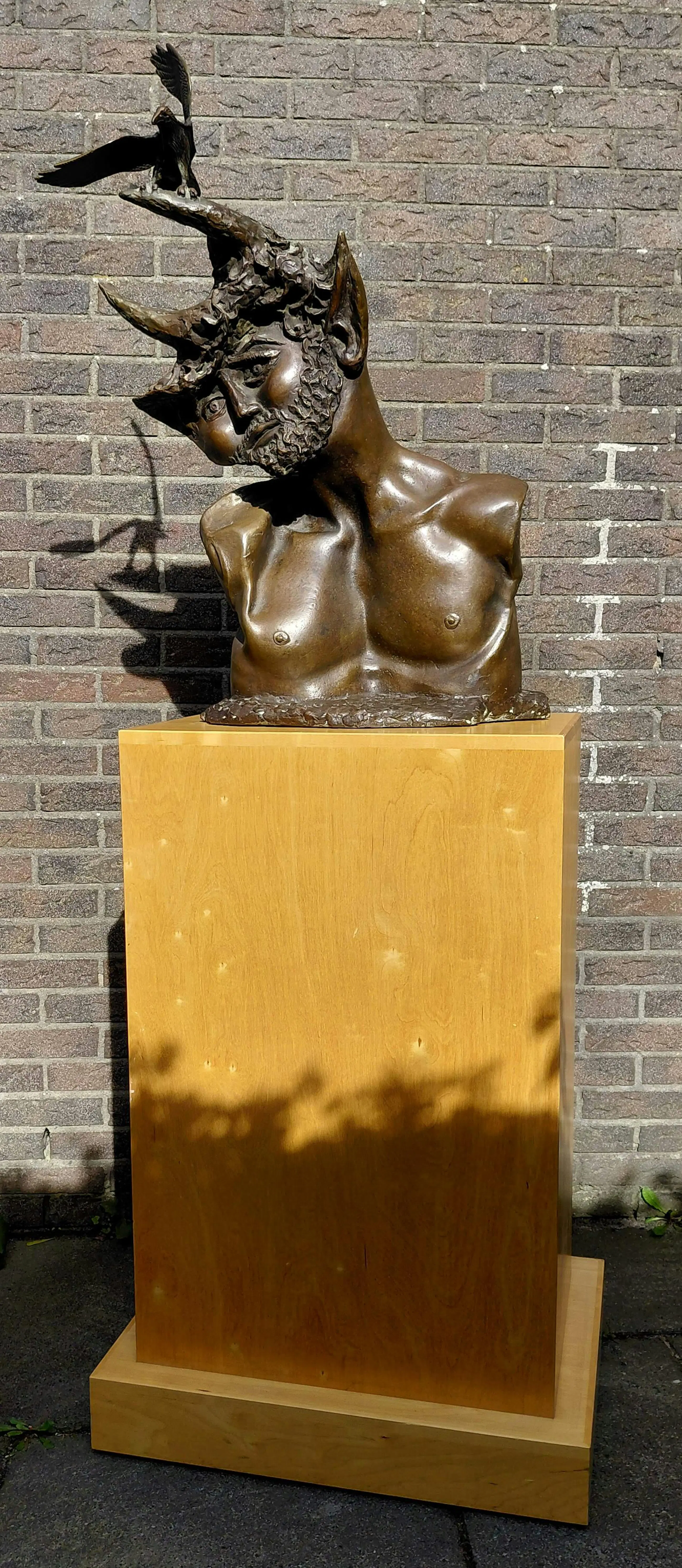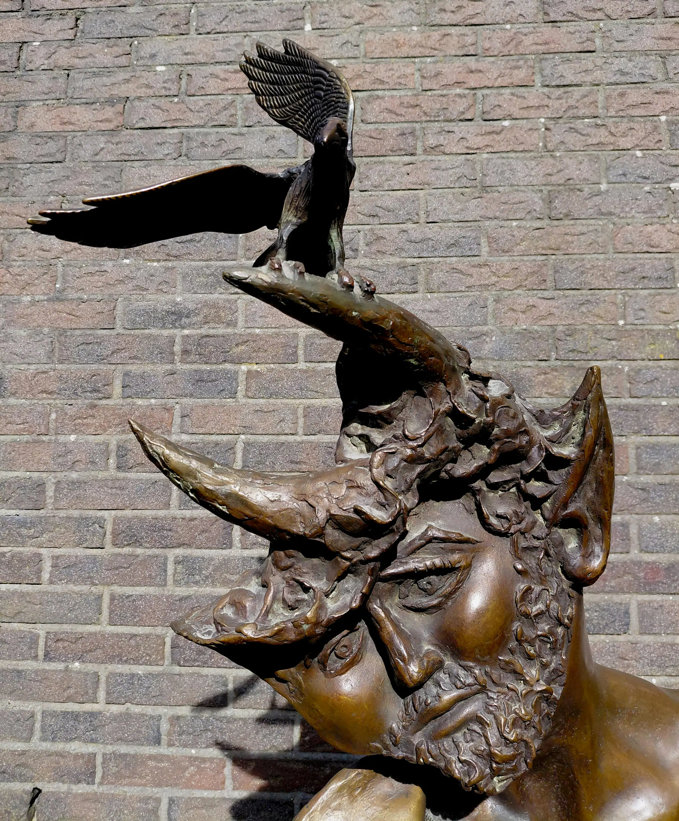 Groot, monumentaal beeld van Aat Veldhoen. Een faun en vogel bij gure wind van rechts, sommige mensen zouden het als een metafoor voor het huidige tijdsgewricht kunnen zien ;-)
