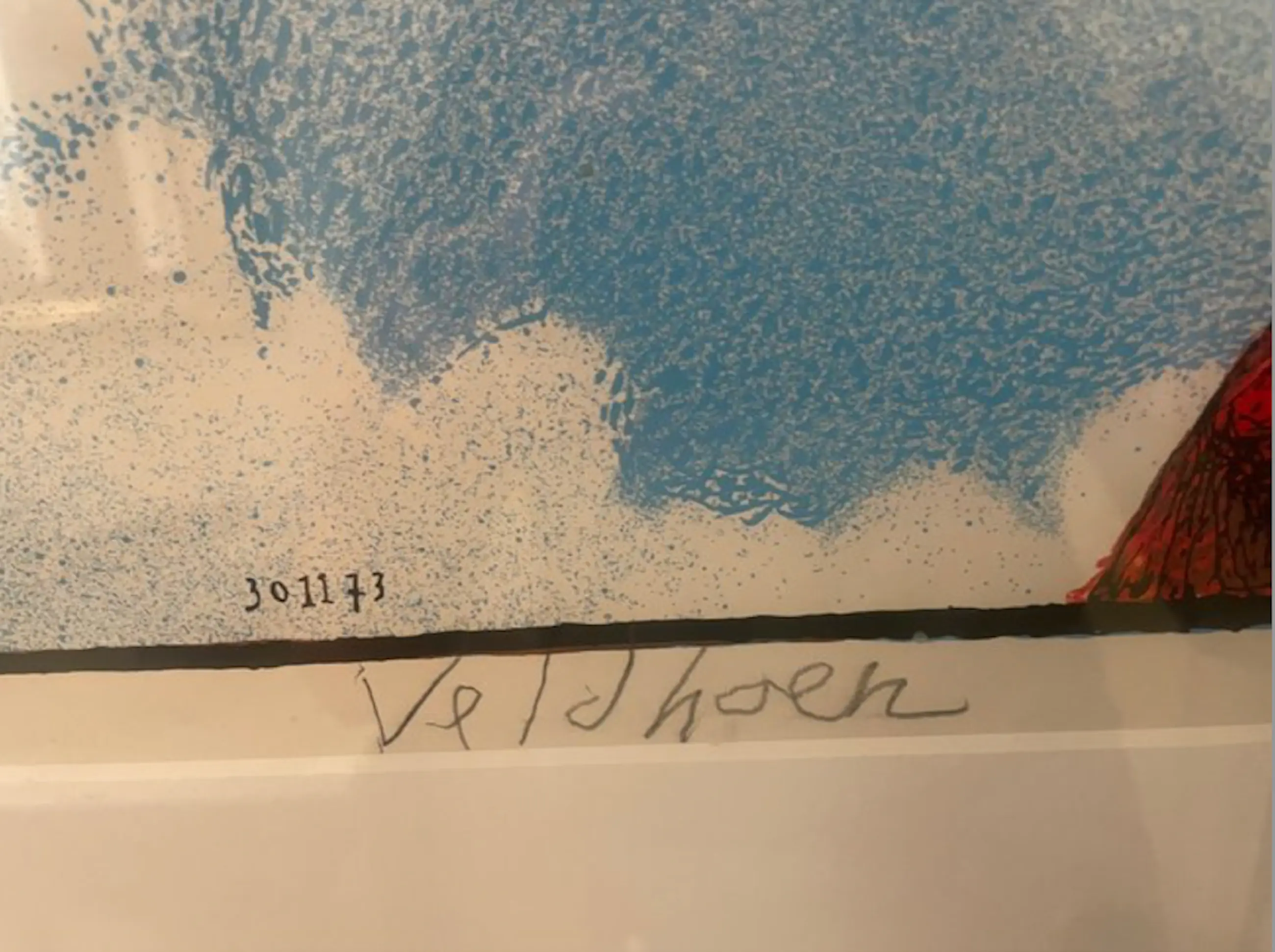 Een prachtige zeefdruk die is gebaseerd op een groot schilderij het Tafereel, dat al meer dan dertig jaar in het AMC op het Verheijplein boven de uitgang hangt: een blote vrouw met een naakt kind tussen haar benen, beiden uitkijkend over een prachtig berglandschap. Model voor dit kunstwerk stonden Veldhoens tweede vrouw en een van hun dochters.