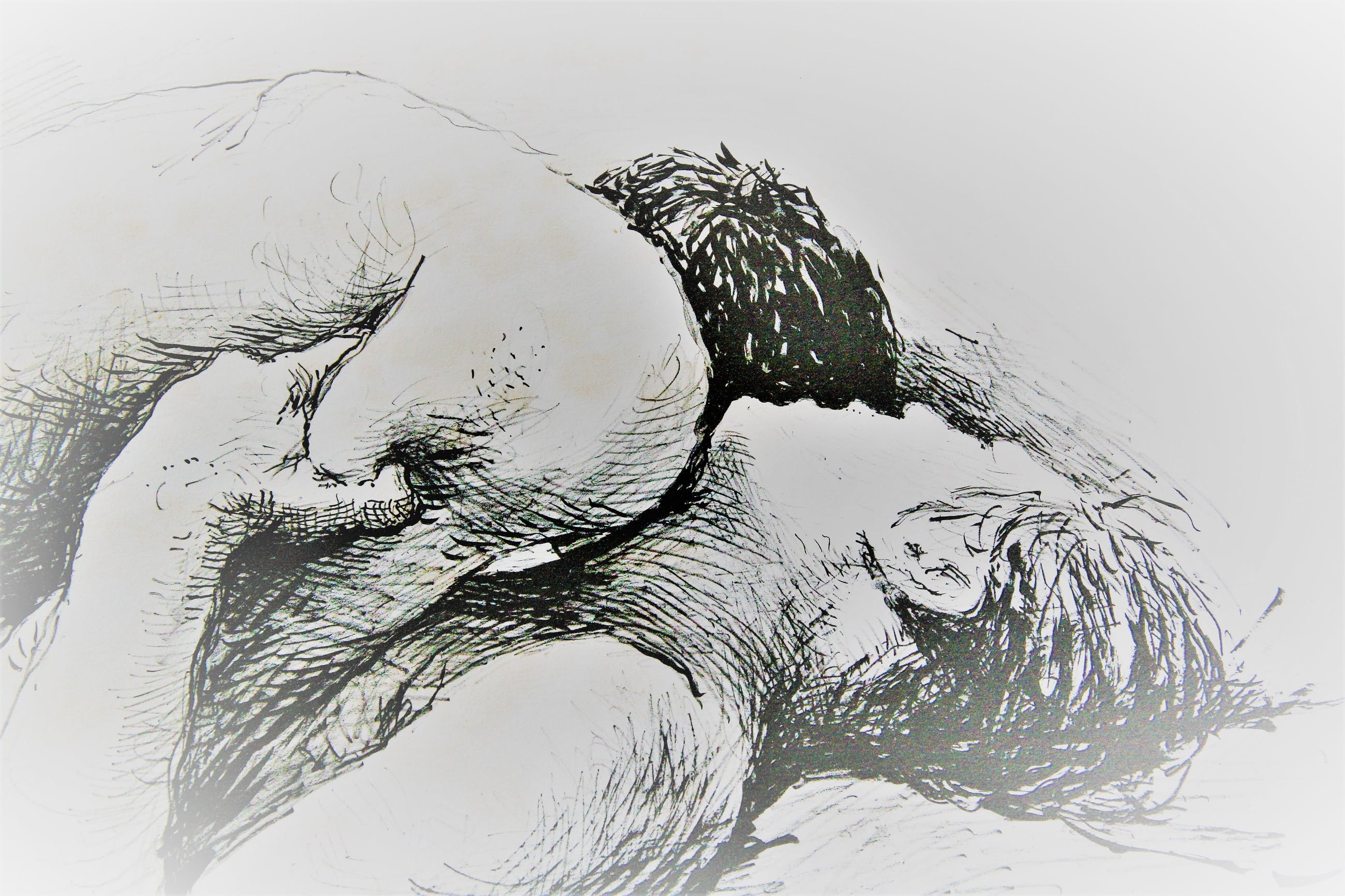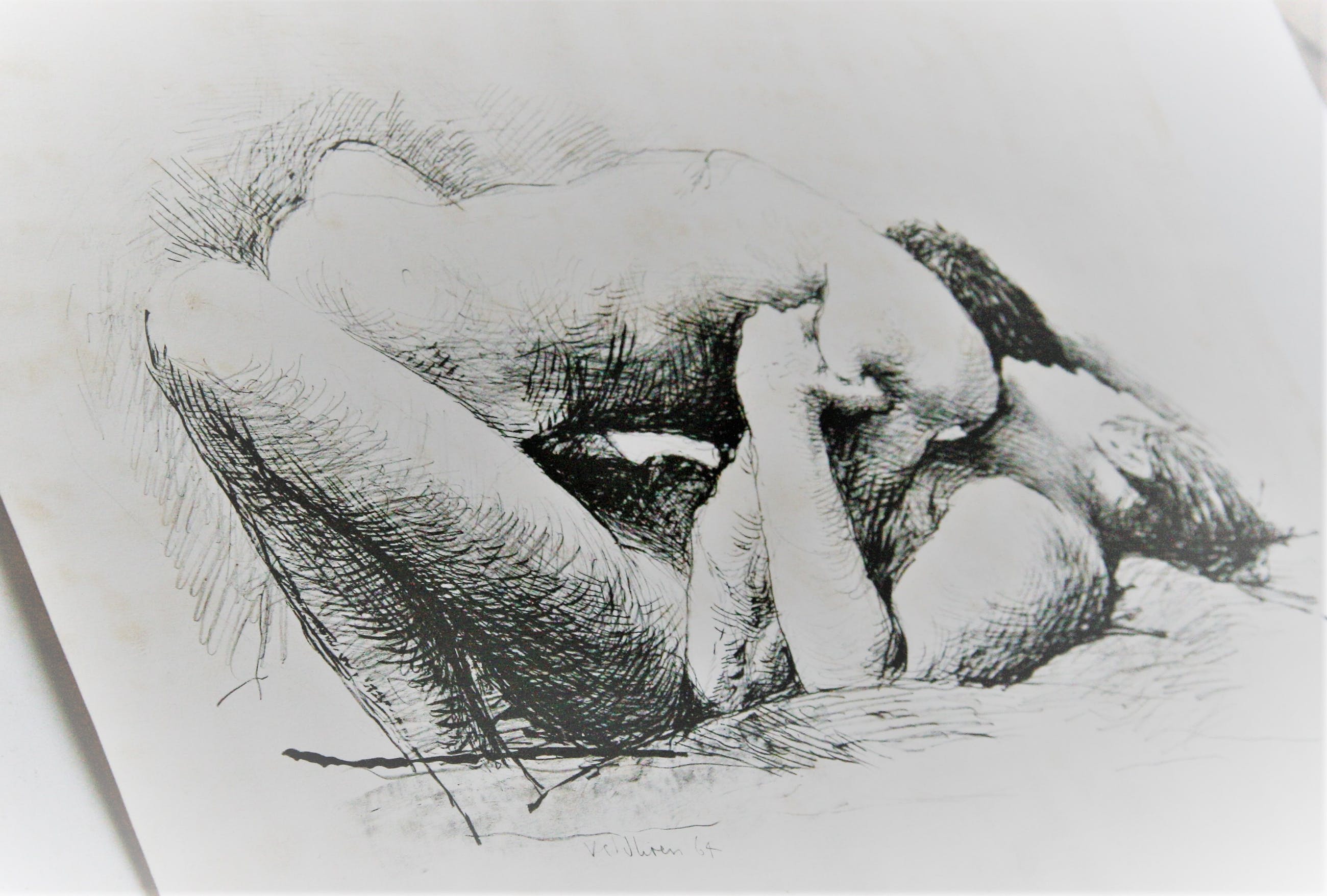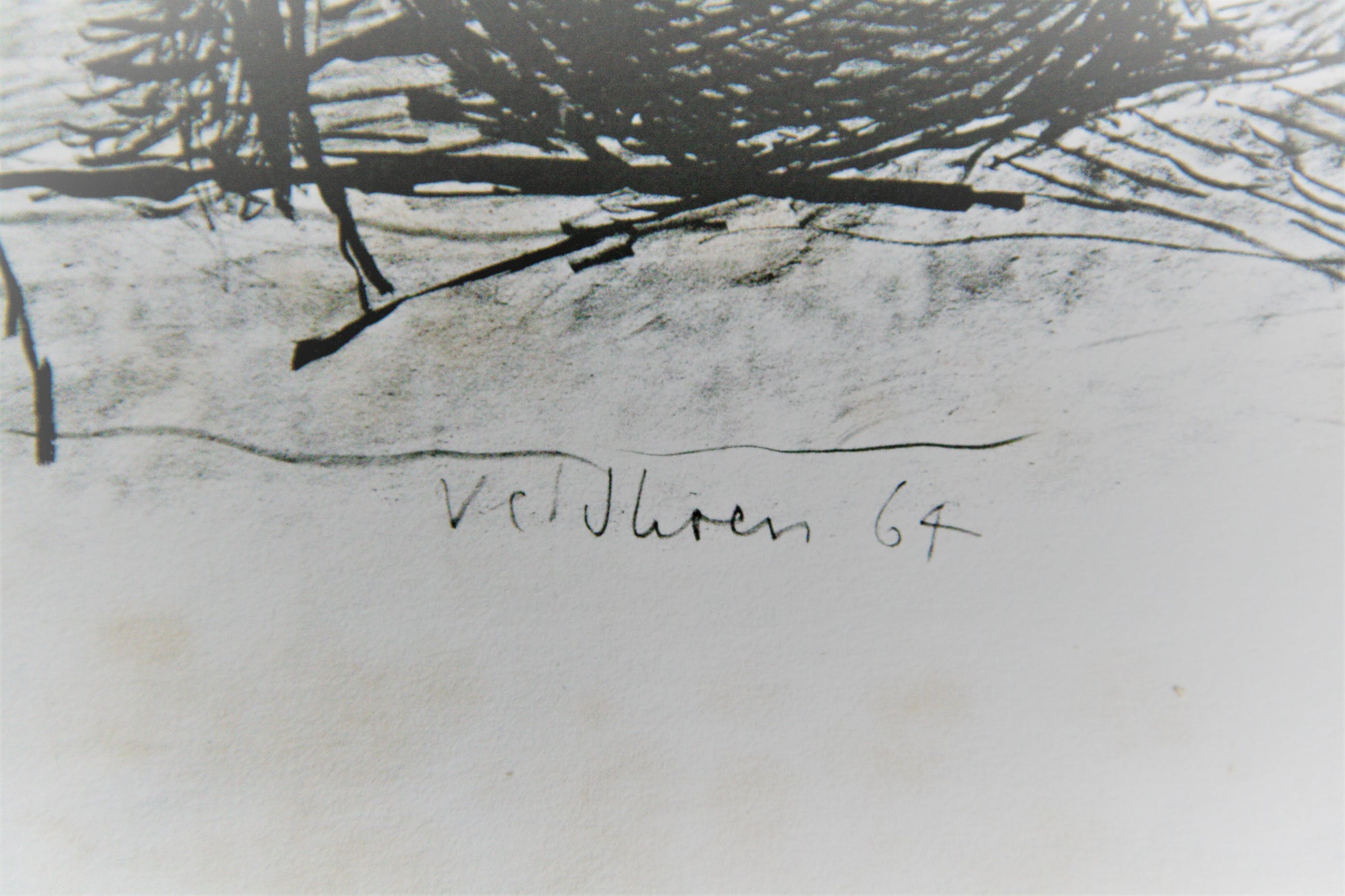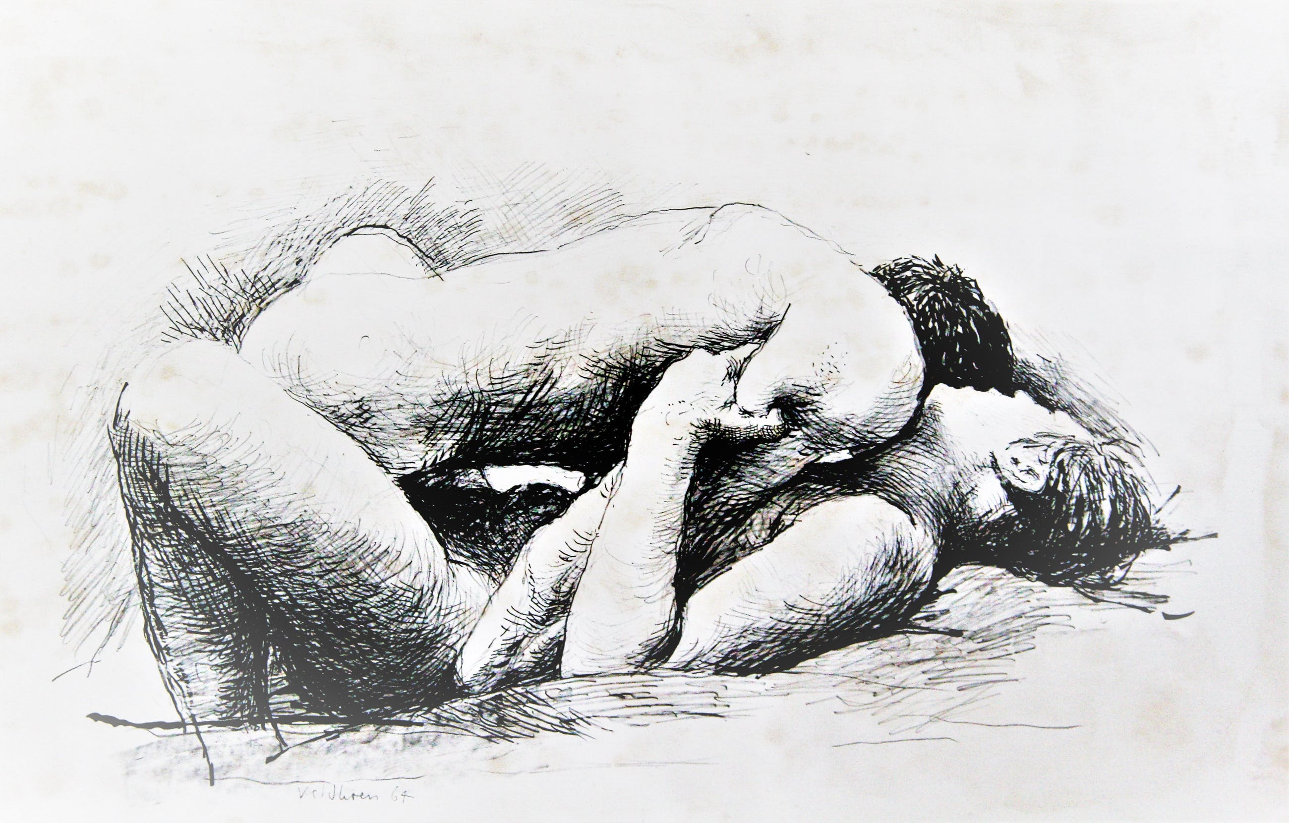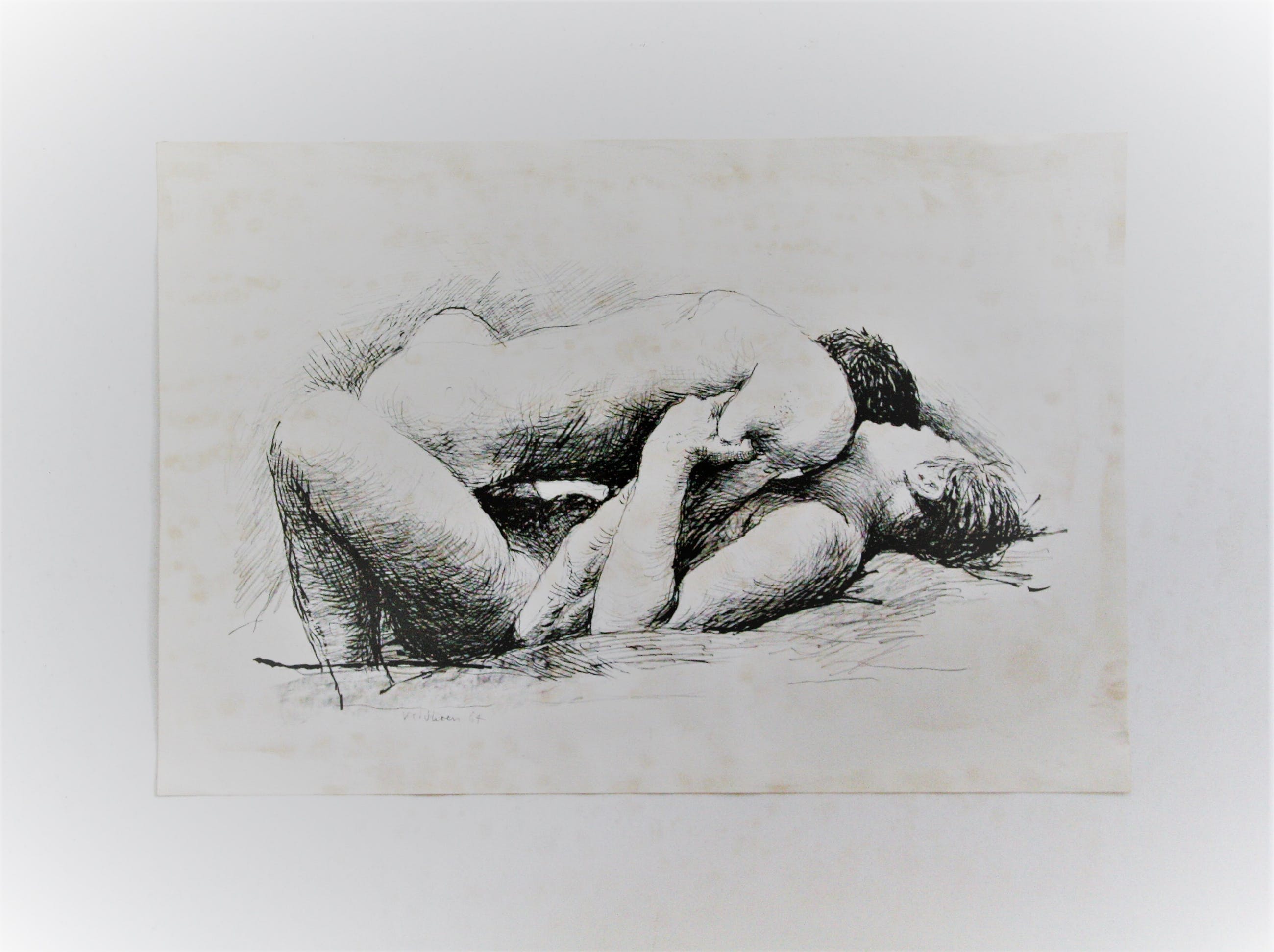 Gesigneerd met Veldhoen 64. Signatuur buiten de plaat aangebracht, lijkt weg te gommen. Duidelijk te zien is wel, hoe de kunstenaar naderhand in de oorspronkelijke ets schaduwen heeft geaccentueerd door met potloodlijnen te arceren. Fascinerend zo te kunnen volgen hoe de hand van de meester bezig is geweest, het totaalbeeld te vervolmaken. Al met al een zeer fraaie uitbeelding van een innige, hartstochtelijke omhelzing. Wat een tekenkunst!