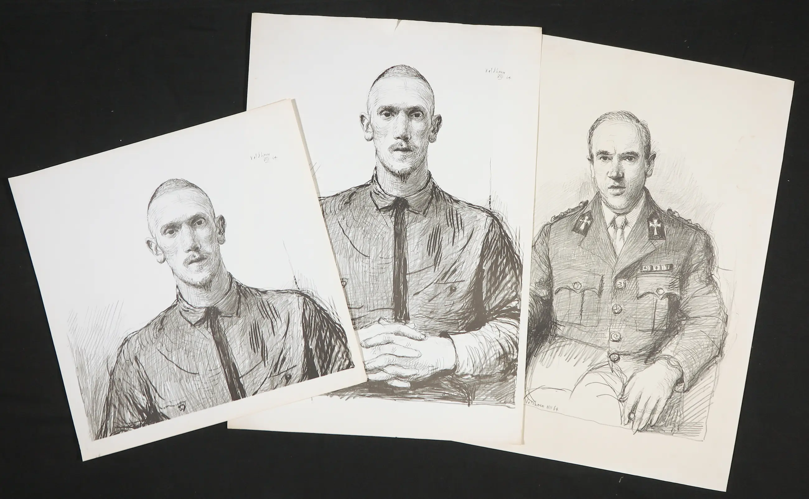 | Goede conditie. Vergeling/verkleuring (met name langs de randen/hoeken), en meerdere knikjes/kreukjes in het blad.Het werk in het midden heeft een soort vochtschade en een scheur langs de bovenste rand. Het werk rechts heeft meerdere vlekjes/bruine kringen. | |||||||||||