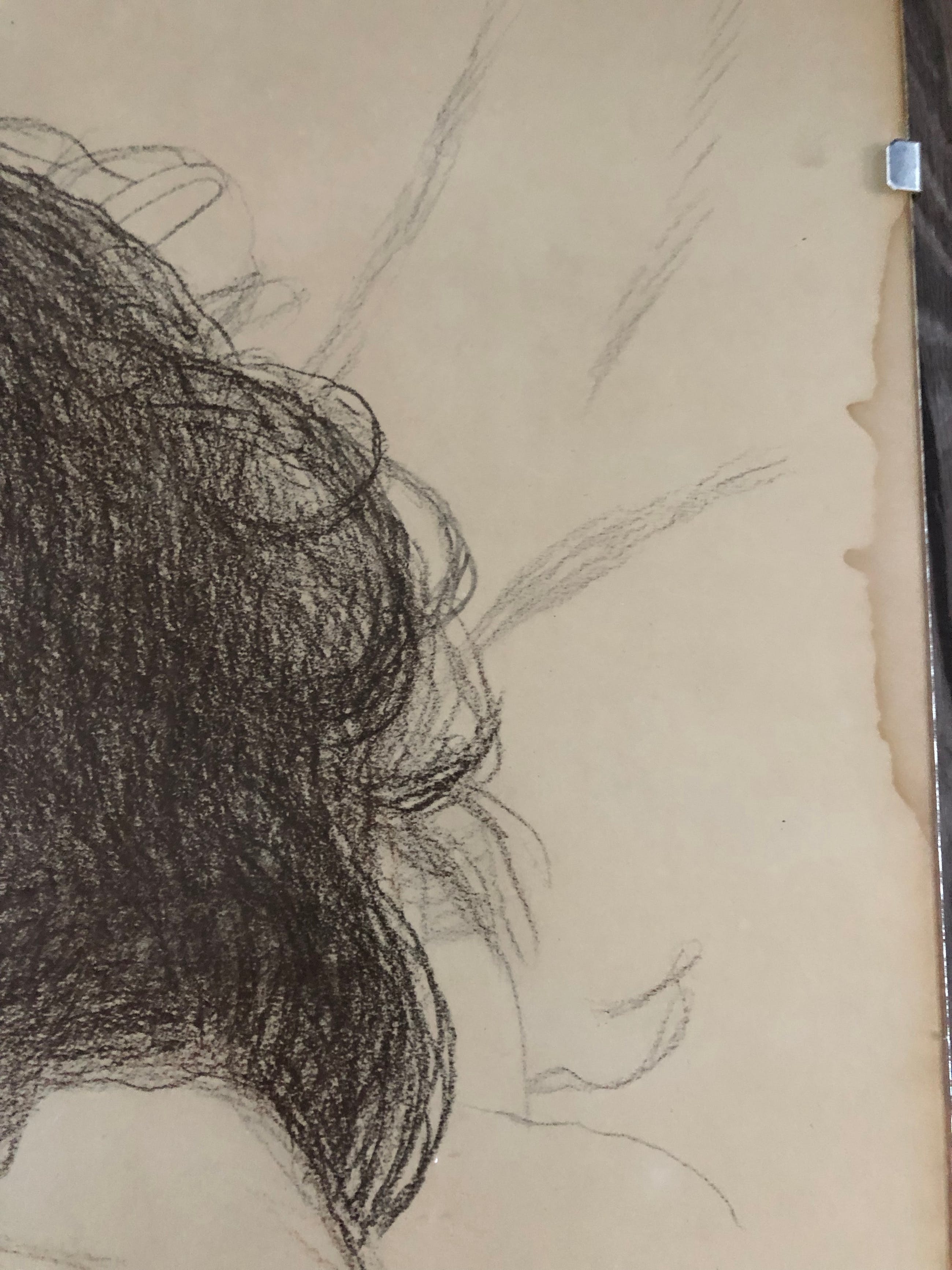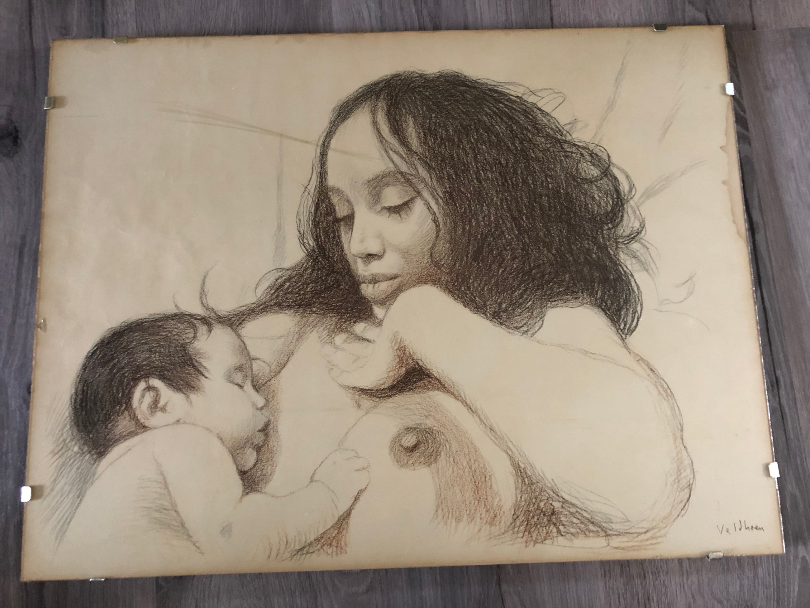 Het portret zelf is nog in zeer goede staat, aan de zijkant en bovenkant van papier zit een verkleuring (zie foto) en papier heeft een paar kleine kreukels maar wederom niet in het portret zelf. Deze bevinden zich enkel op het witte gedeelte van het papier. Indien u meer foto's zou willen is dit uiteraard mogelijk. De kras die u ziet op de foto (voorhoofd moeder) zit in het glas van de lijst dus niet op portret zelf.