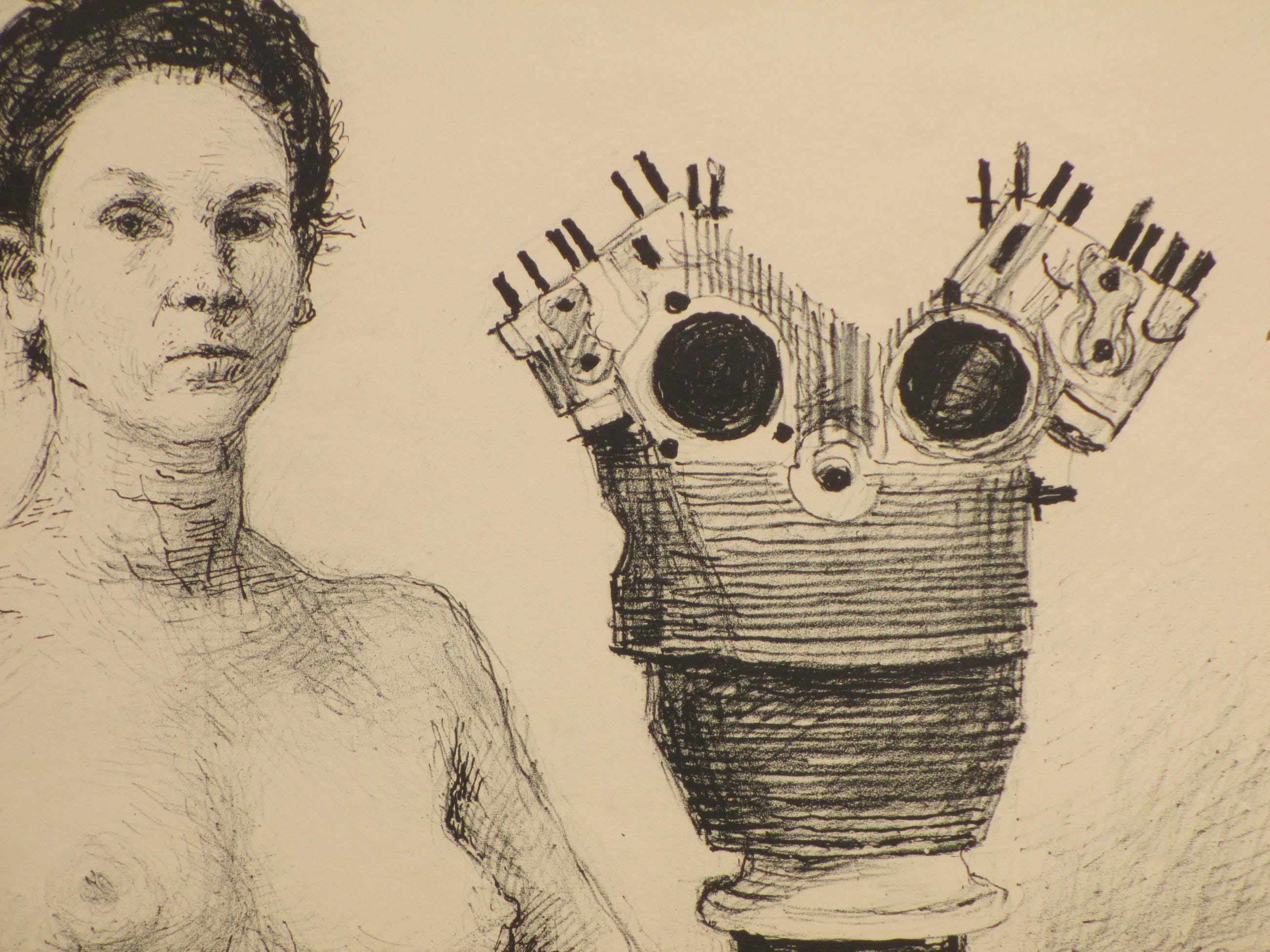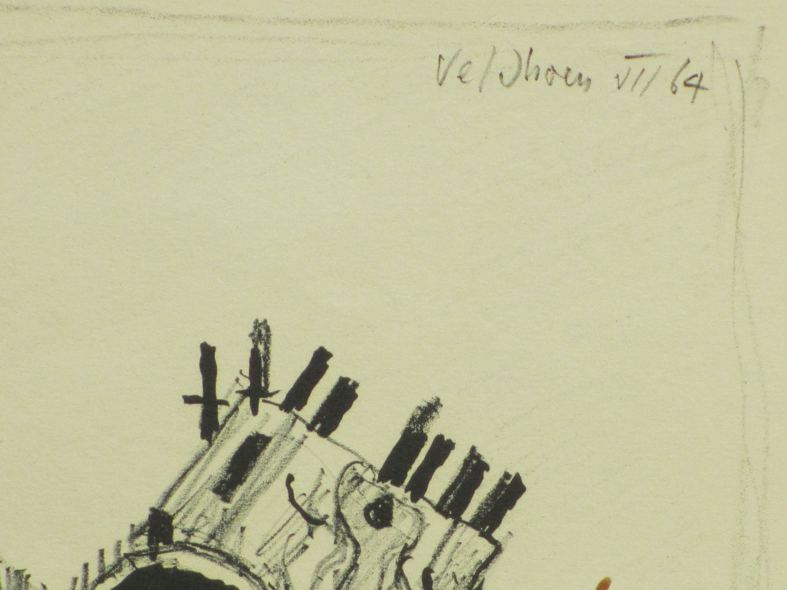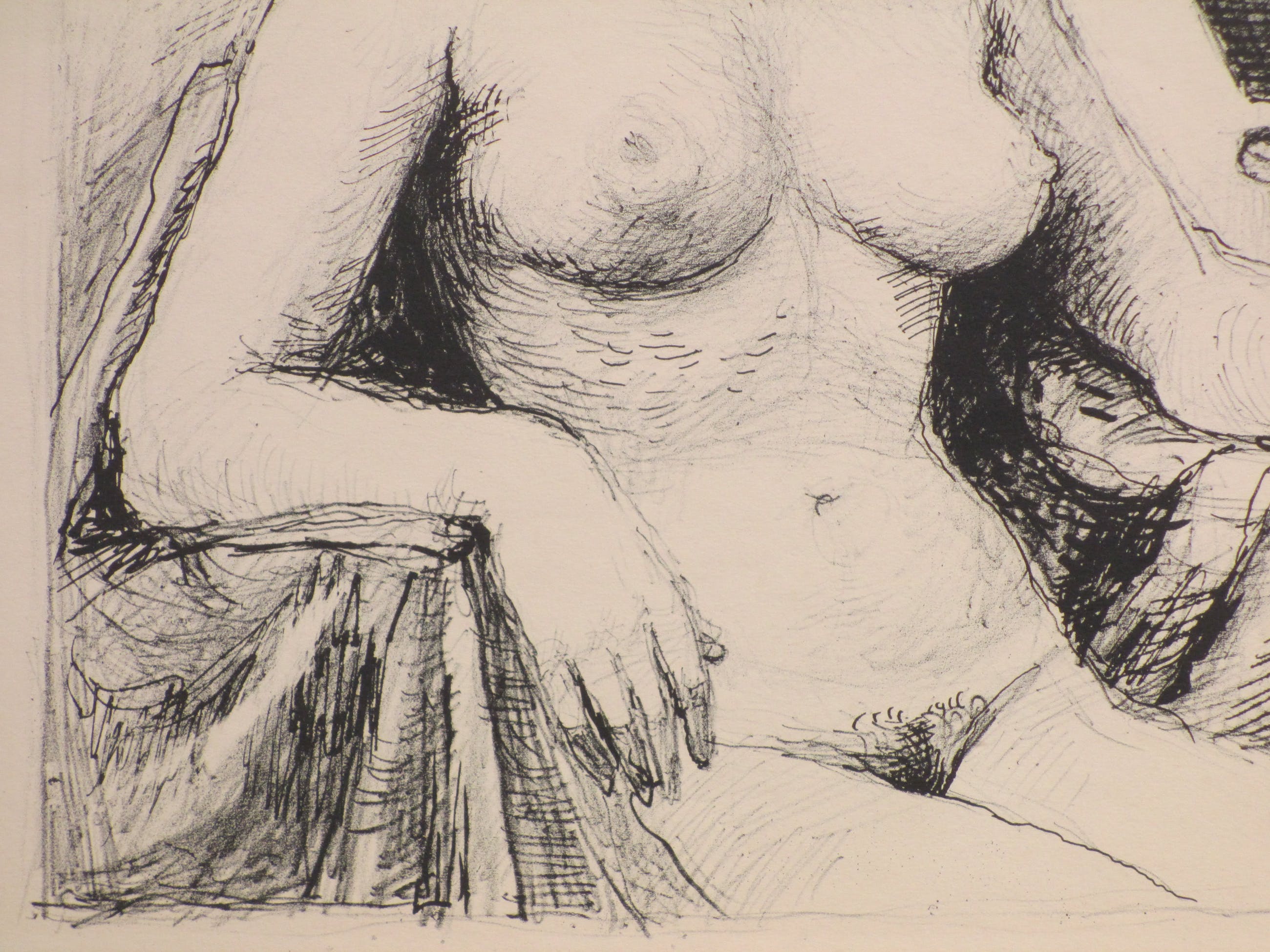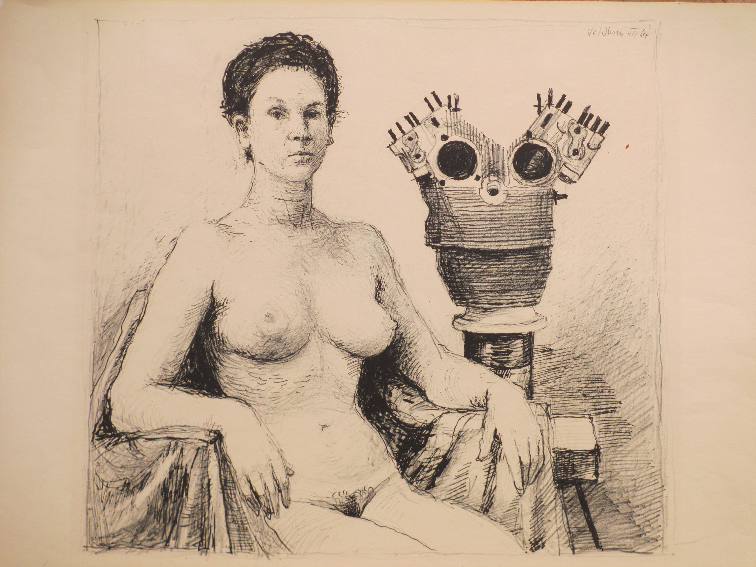 Lithografische rotaprint door Aat Veldhoen. Voorstelling van een zittende naakte vrouw bij een ijzeren motorblokbeeld. Gesigneerd en gedateerd r.b. in de druk 'veldhoen VII 64'. Veldhoen reed op zijn bakfiets door Amsterdam met zijn zelfgemaakte pers daarop, op verzoek drukte en verkocht hij ter plaatse deze rotaprints.