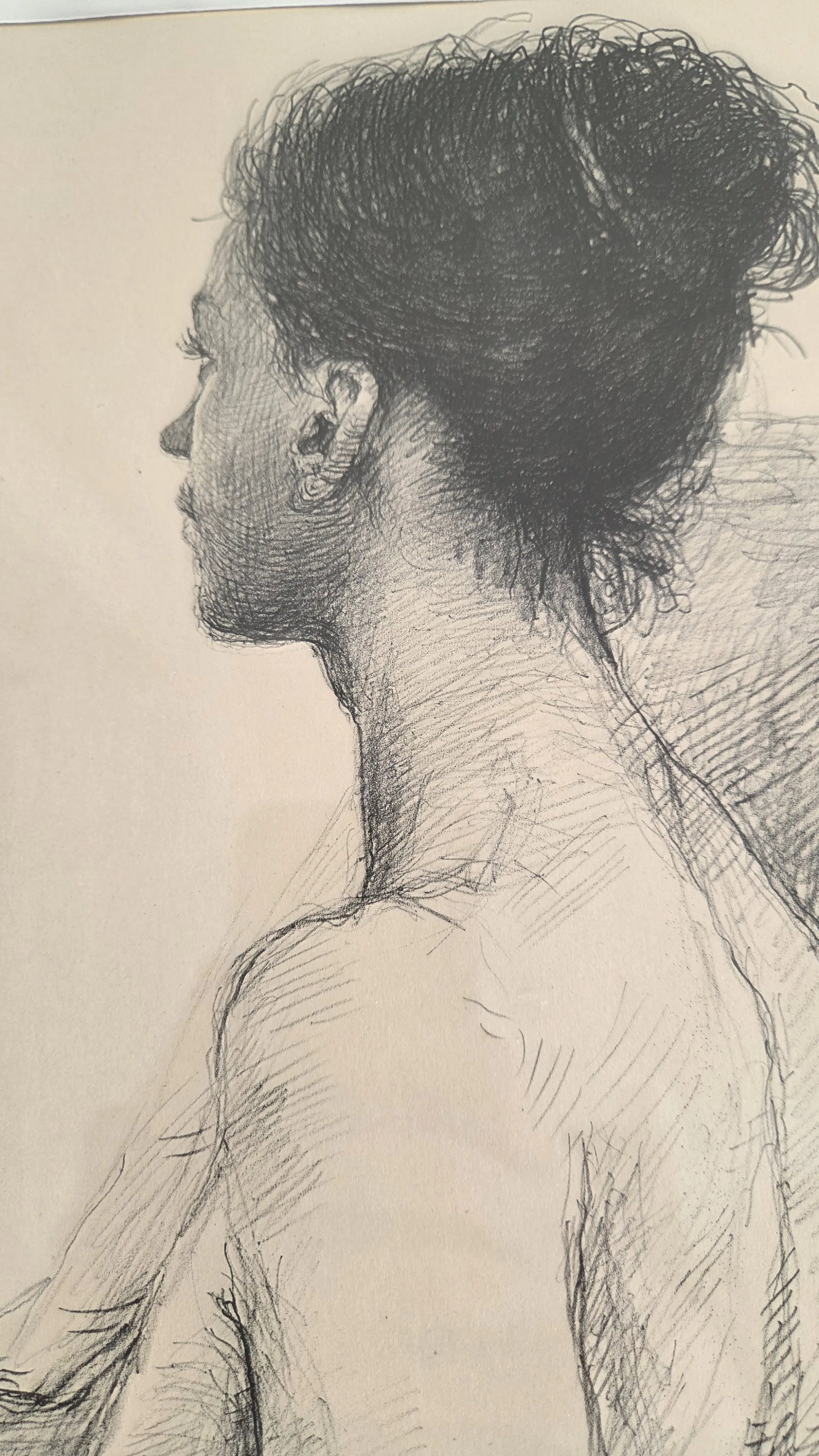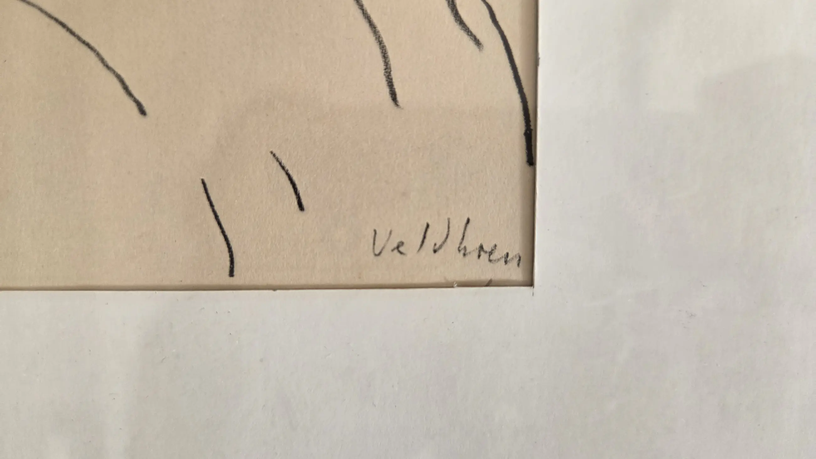 Originele potlood-tekening van Aat Veldhoen (1934–2018). Gesigneerd “Veldhoen” en gedateerd X ’64 (oktober 1964) rechtsonder. Uniek werk, geen druk of rotaprint. Getekend op dun tekenpapier. In goede staat, passend bij leeftijd (lichte verkleuring van het papier). Vrouwelijk naakt, karakteristieke snelle lijnvoering uit zijn vroege periode. Werk uit de jaren ’60 is geliefd bij verzamelaars. Momenteel ingelijst (lijst kan desgewenst worden meegeleverd).