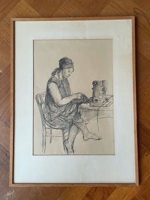 Rotaprint met naaister aan een tafel van Amsterdamse kunstenaar Aat Veldhoen (64-32), in lijst met glas. Print zelf is in goede staat; lijst is verouderd. De omvang van de lijst is 66 x 50 cm.