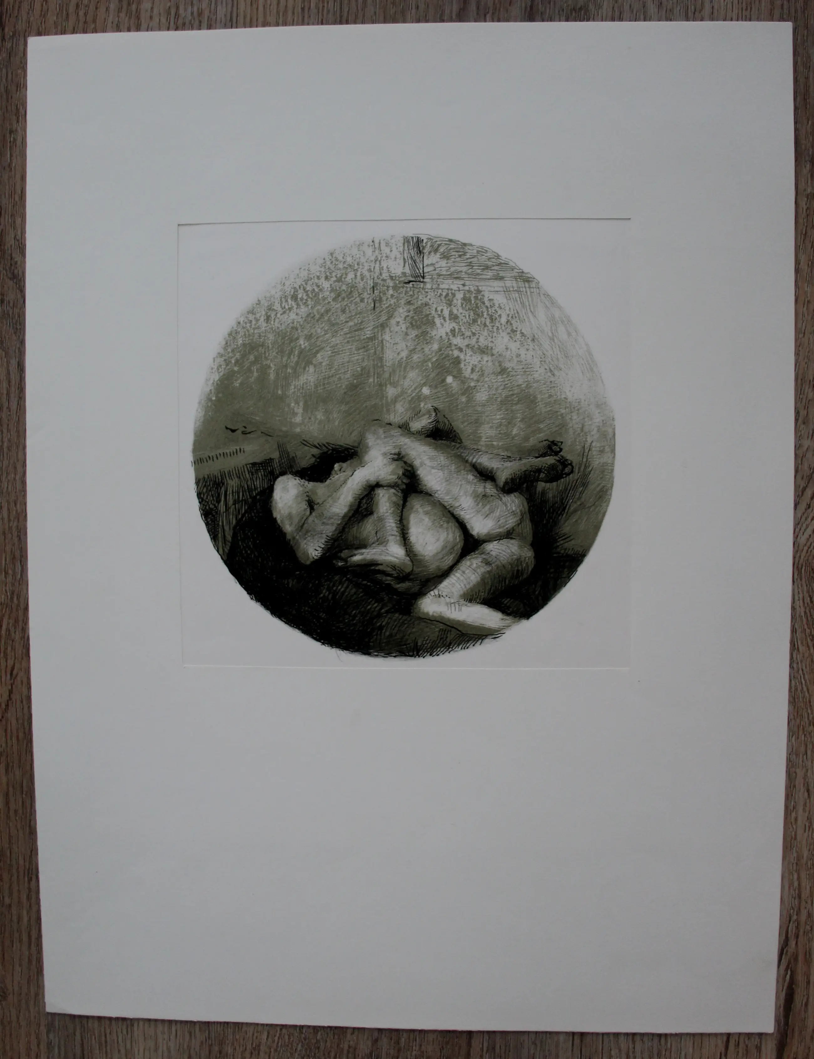 Rotaprint(Machine voor vlakdruk op offsetwijze), van Aat Veldhoen. Paring. Afmetingen incl passe-partout: H50 x b37.5cm. Afmetingen voorstelling: H20 x b20cm. Het werk niet gesigneerd. Rechts onderaan staat een collectors stempel van "Piet".