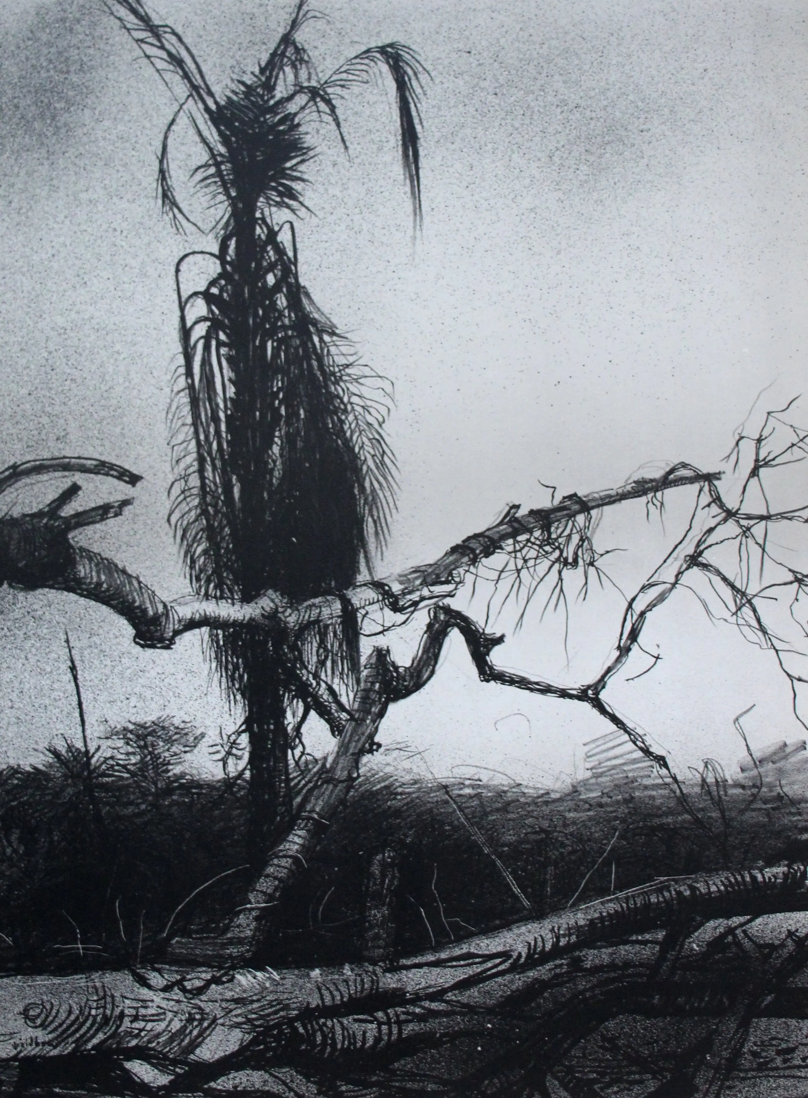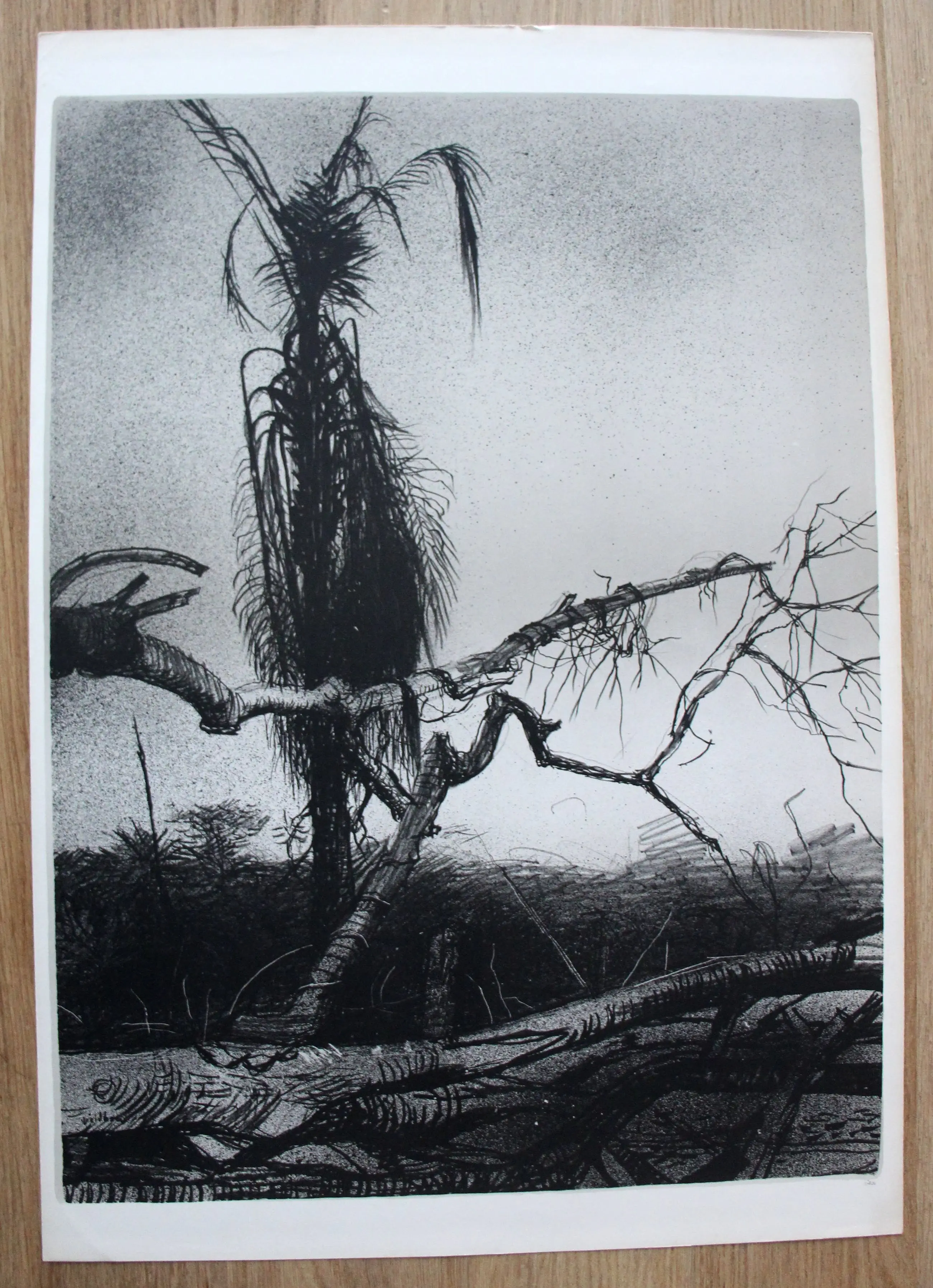 Karakteristieke rotaprint(Machine voor vlakdruk op offsetwijze) door Aat Veldhoen. Afmetingen blad: H49.5 x b34.5cm. Afmetingen voorstelling: H44 x 32.5cm. Het werk is links onderaan in de druk gesigneerd.