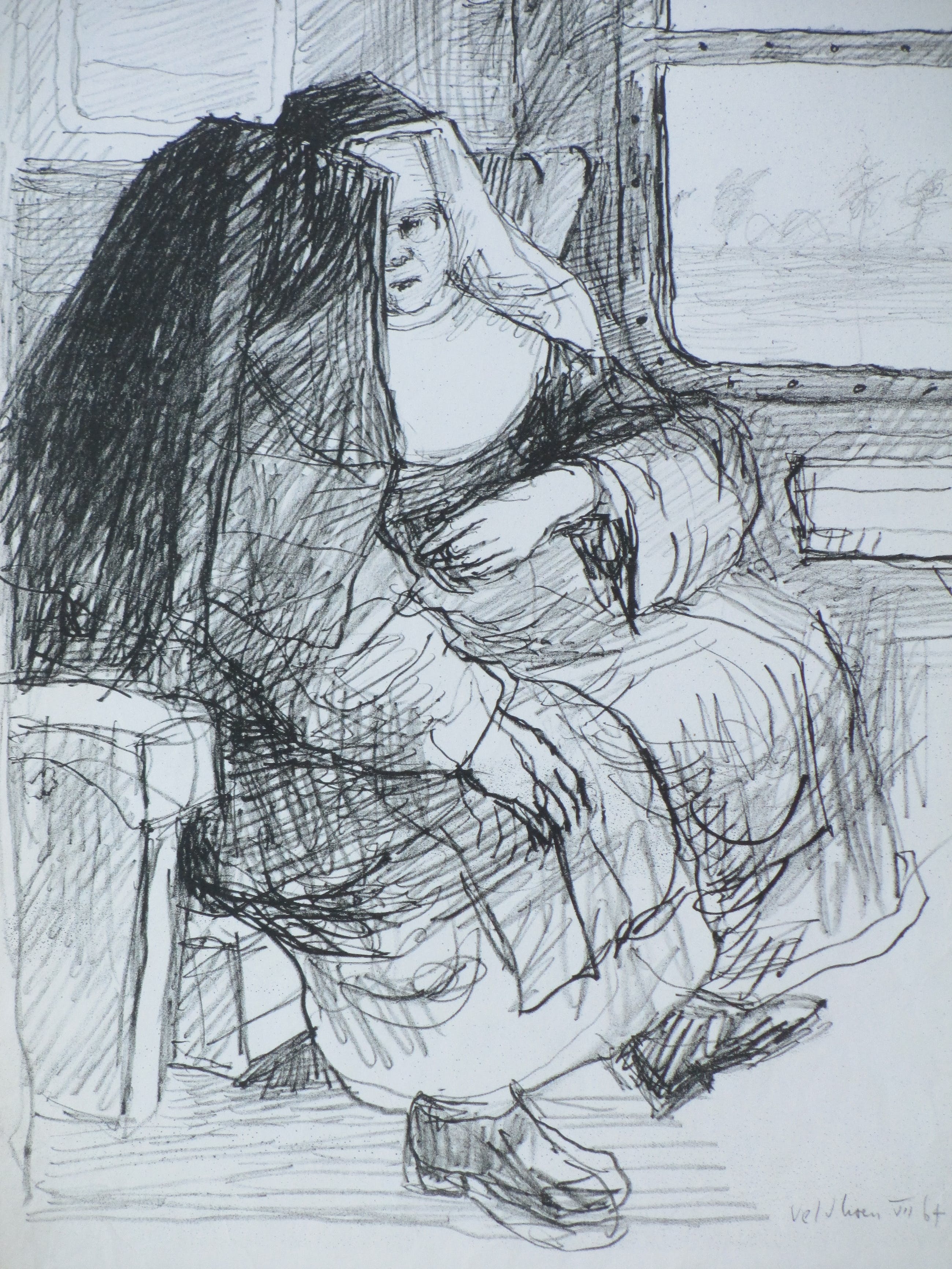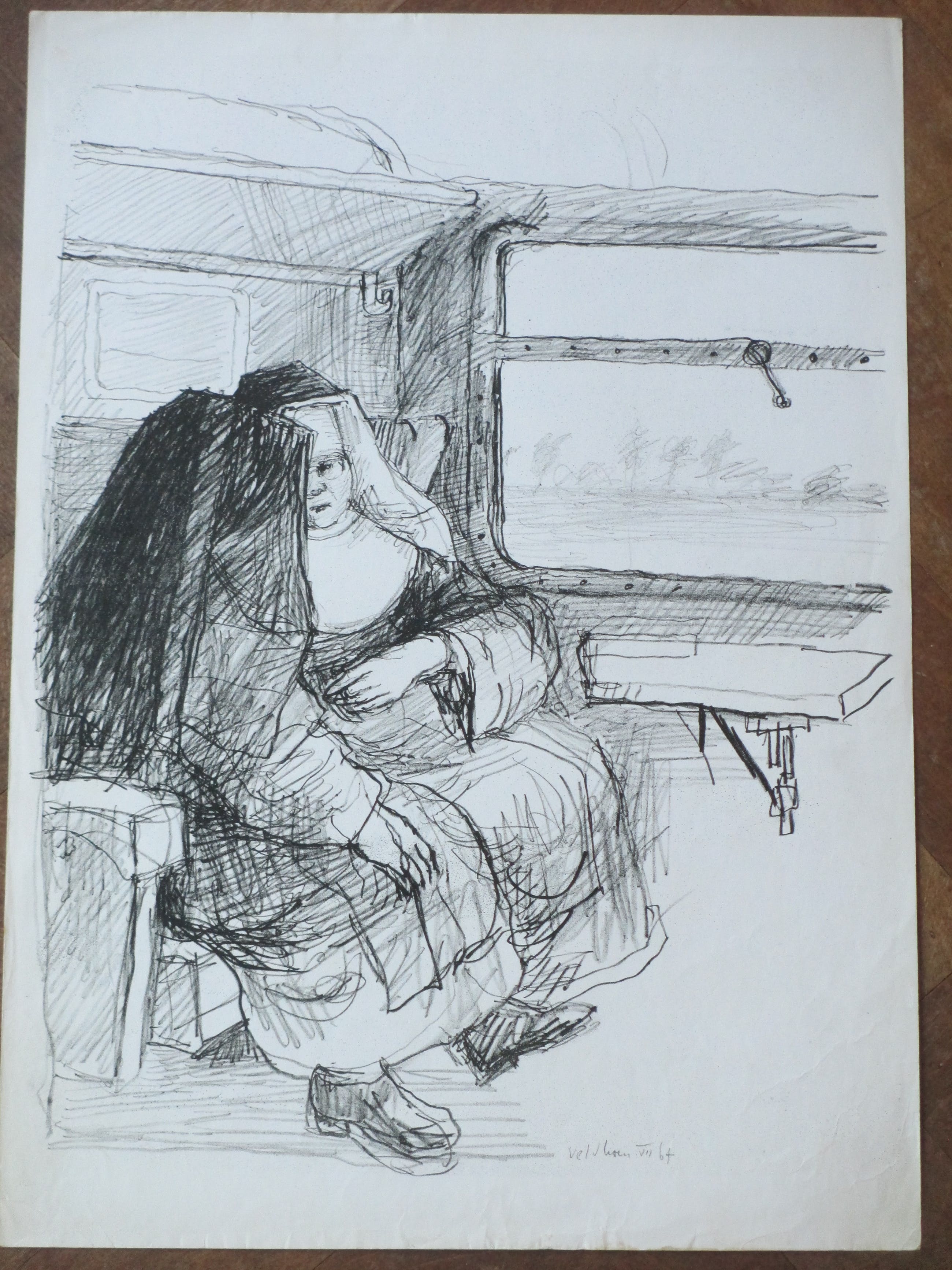 Rotaprint door Aat Veldhoen Voorstelling van twee nonnen in de trein Losbladig, beeldmaat 42x32, bladmaat 48x34 Gesigneerd en gedateerd r.o.: 'Veldhoen VII 64' Authenticiteit volledig gegarandeerd